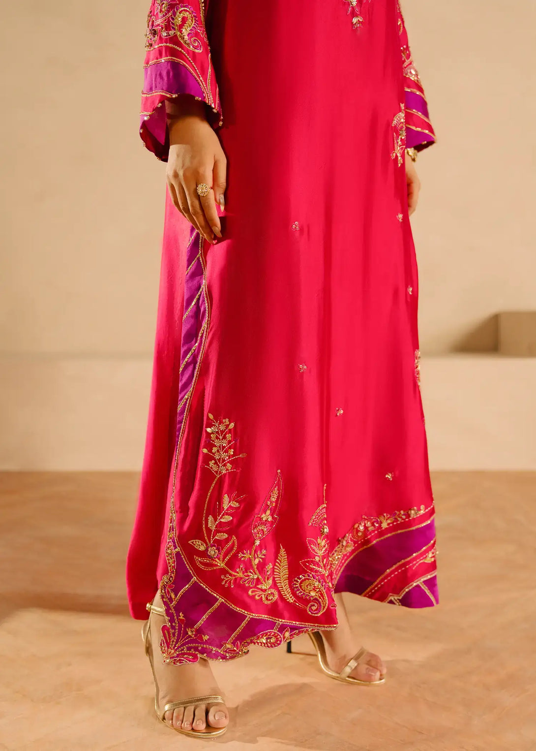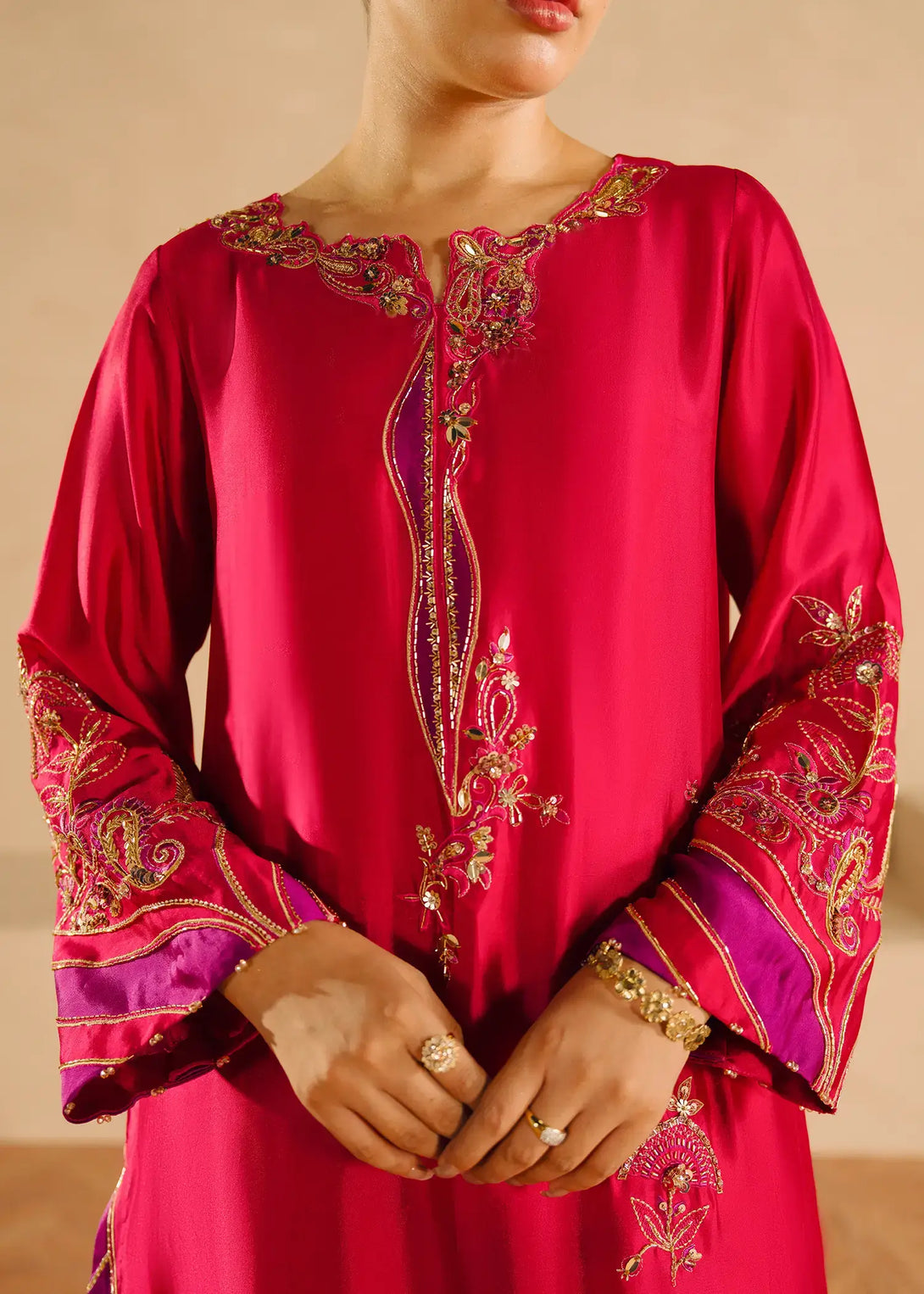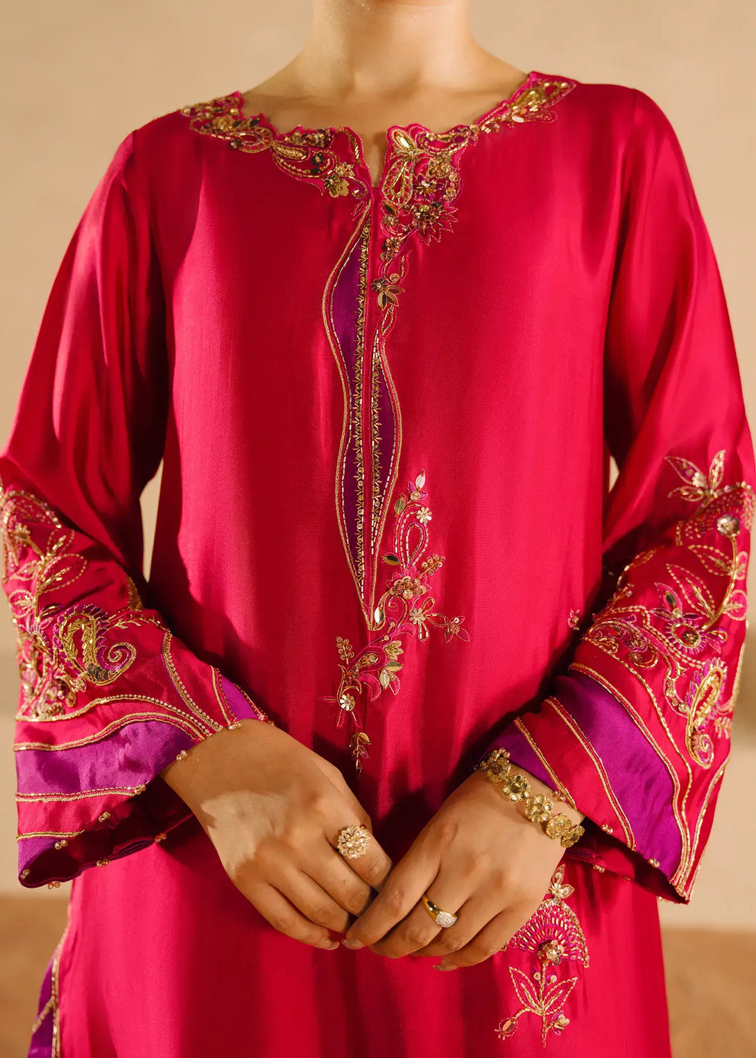 'A vibrant pink silk ensemble, Alisha Pink is adorned with rich cut dana sequin accents and threadwork. The long shirt has gold and contrasting purple detailing all over. Complemented by a pure organza dupatta and cigarette pants, this ensemble exudes elegance.