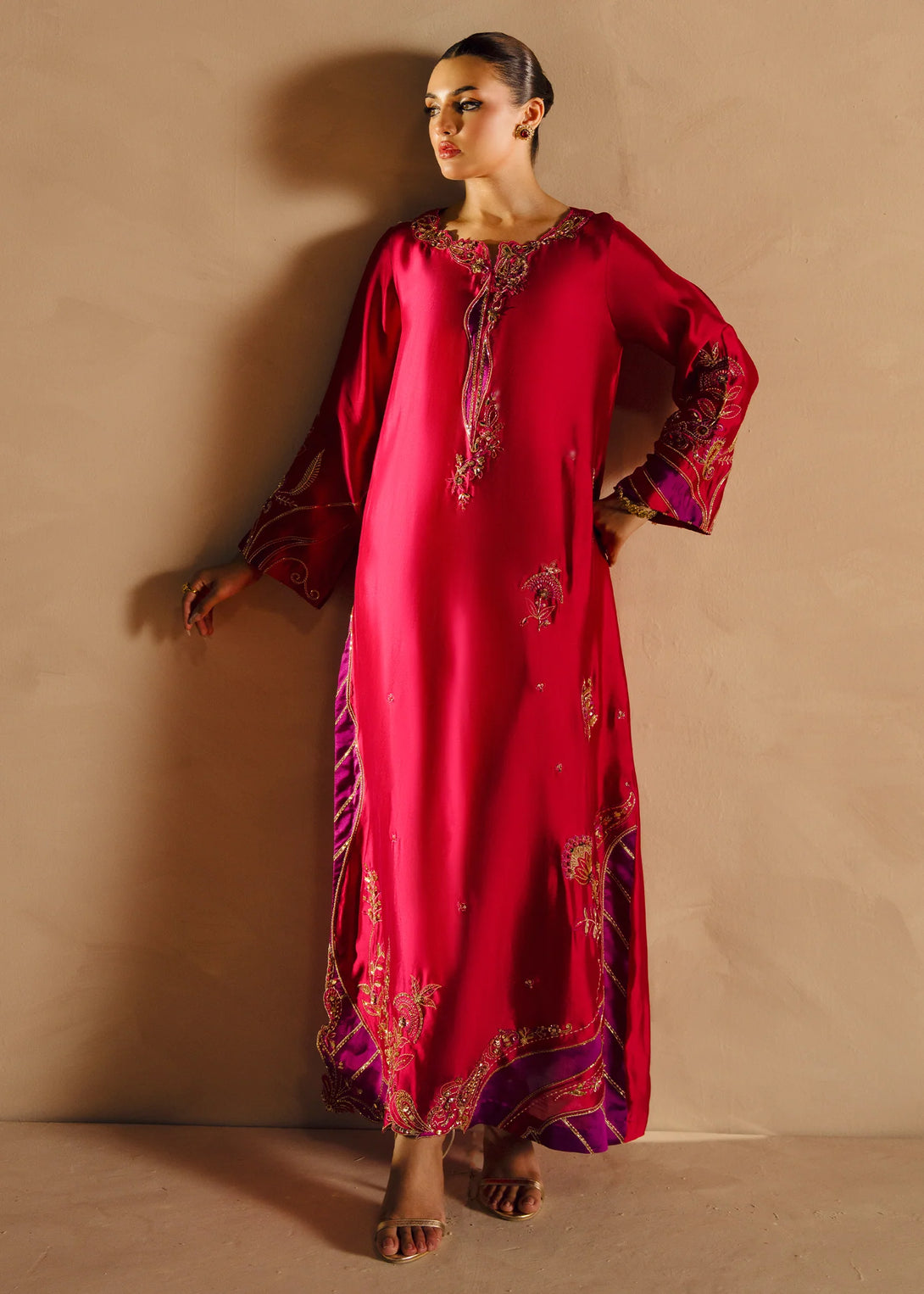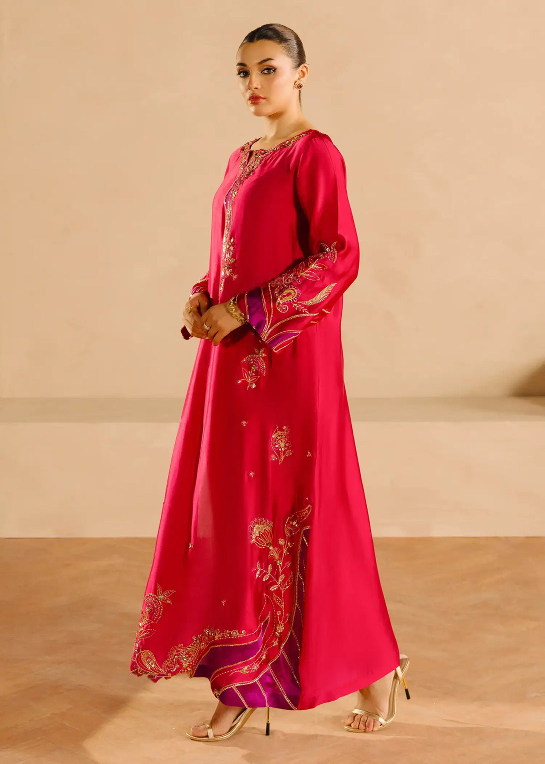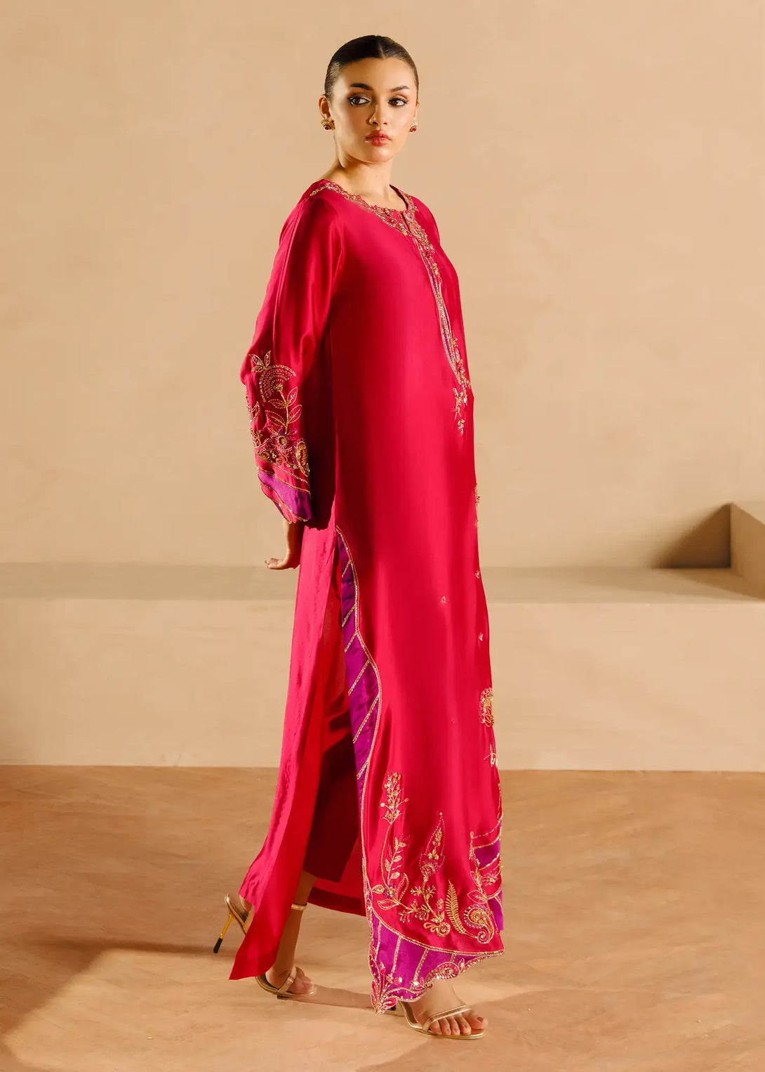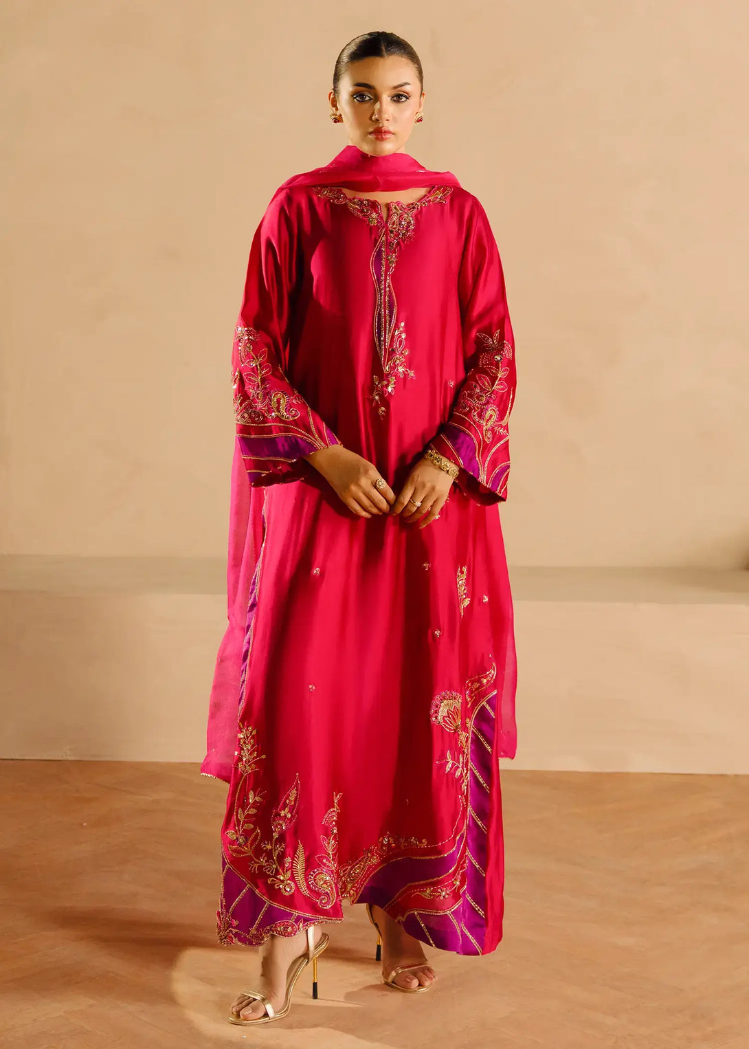 'A vibrant pink silk ensemble, Alisha Pink is adorned with rich cut dana sequin accents and threadwork. The long shirt has gold and contrasting purple detailing all over. Complemented by a pure organza dupatta and cigarette pants, this ensemble exudes elegance.