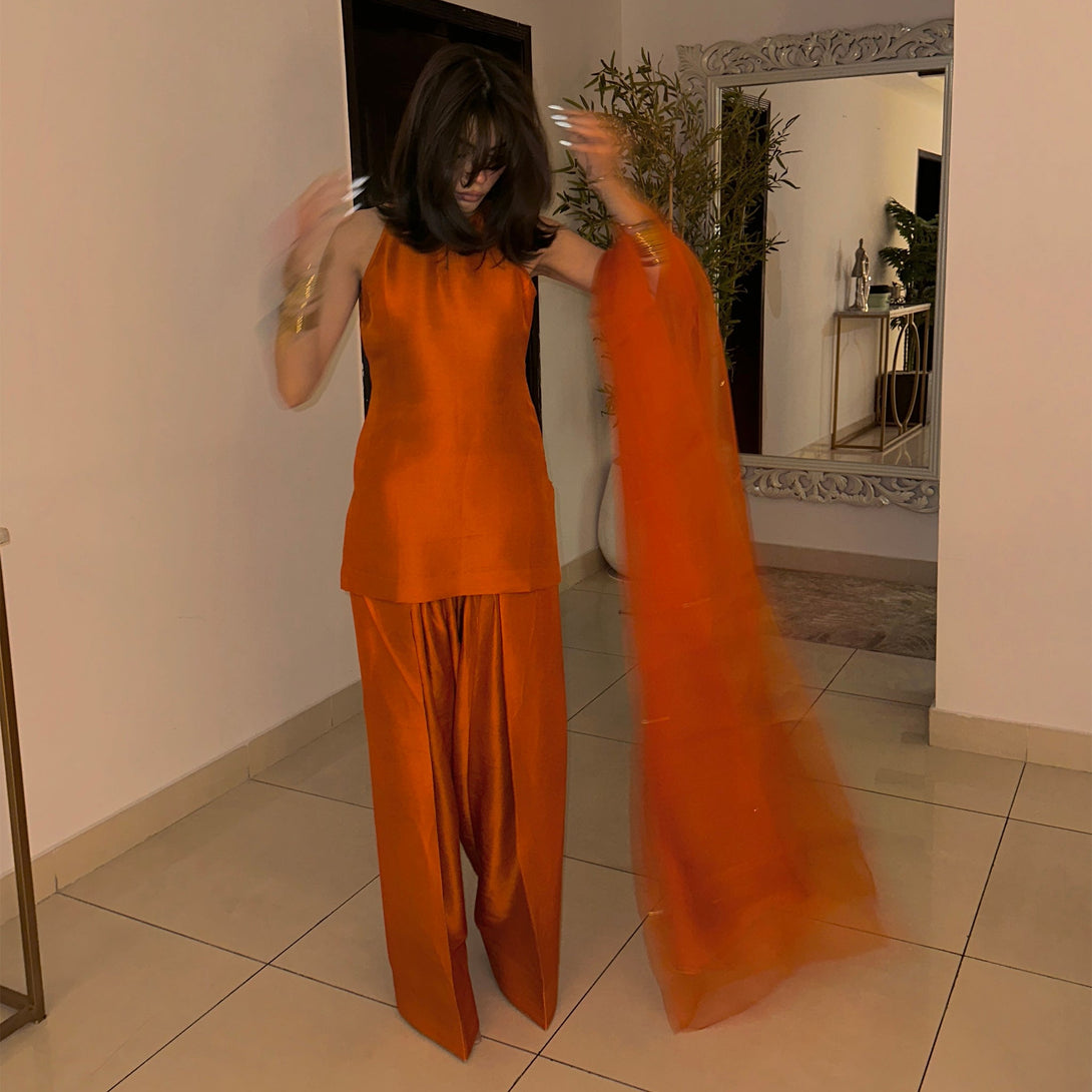 Turn heads in this radiant mustard ensemble, crafted from pure raw silk with a graceful farshi silhouette. The shirt and trousers flow effortlessly, combining structured elegance with luxurious texture. Finished with a light organza dupatta, this look brings refined sophistication with a playful twist—perfect for any special occasion or sunlit celebration.
