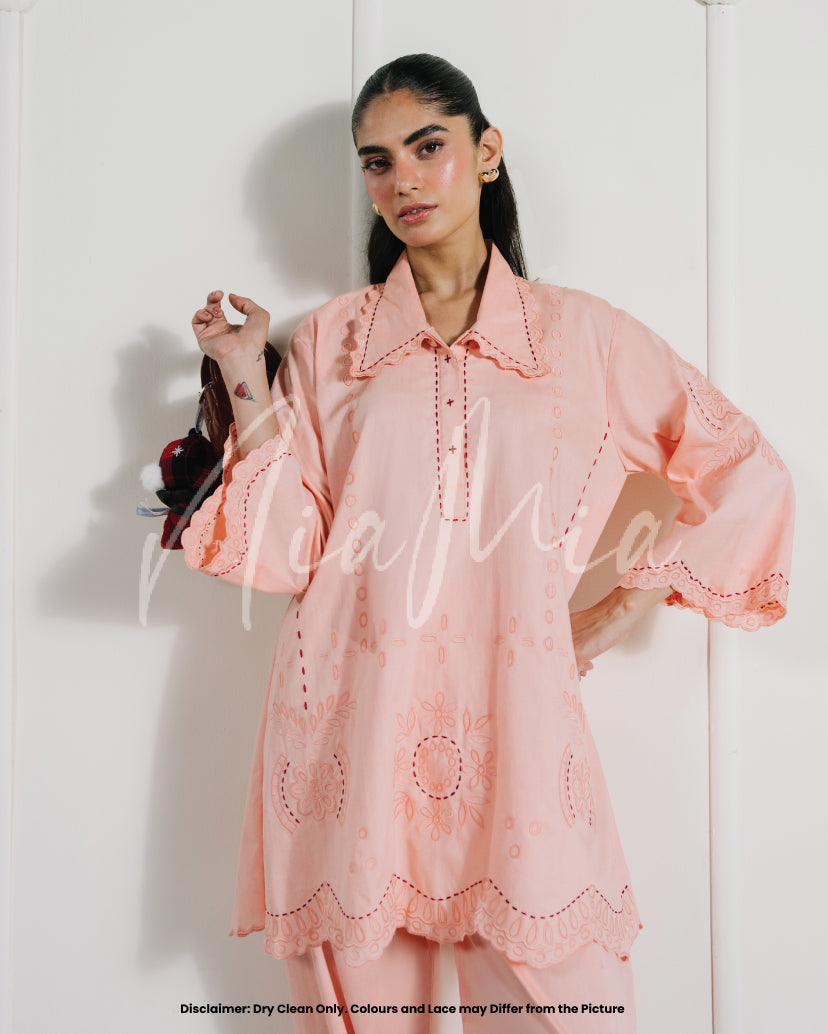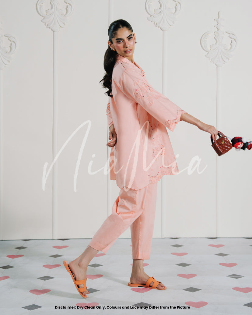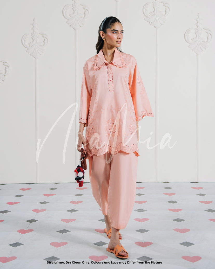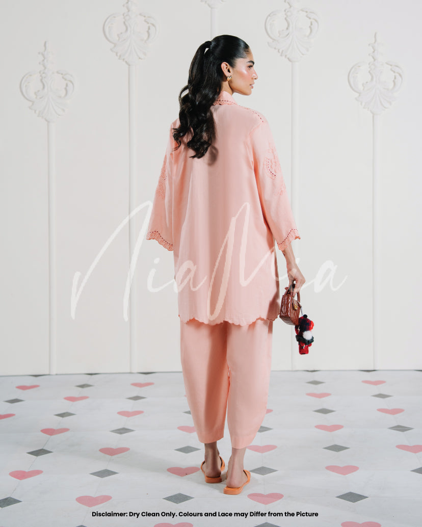 A two-piece set in a soft peach hue, crafted from breathable cambric. The shirt features intricate cutwork embroidery with scalloped detailing along the collar, sleeves, and hem — paired with a matching balloon shalwar for a breezy, playful silhouette. A light and graceful addition to your fall wardrobe.