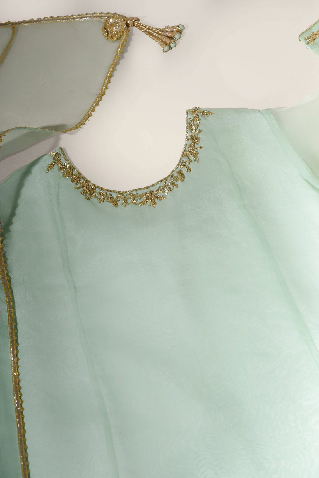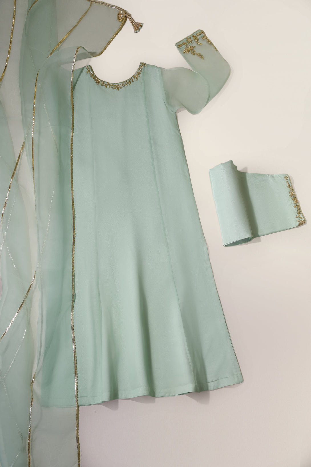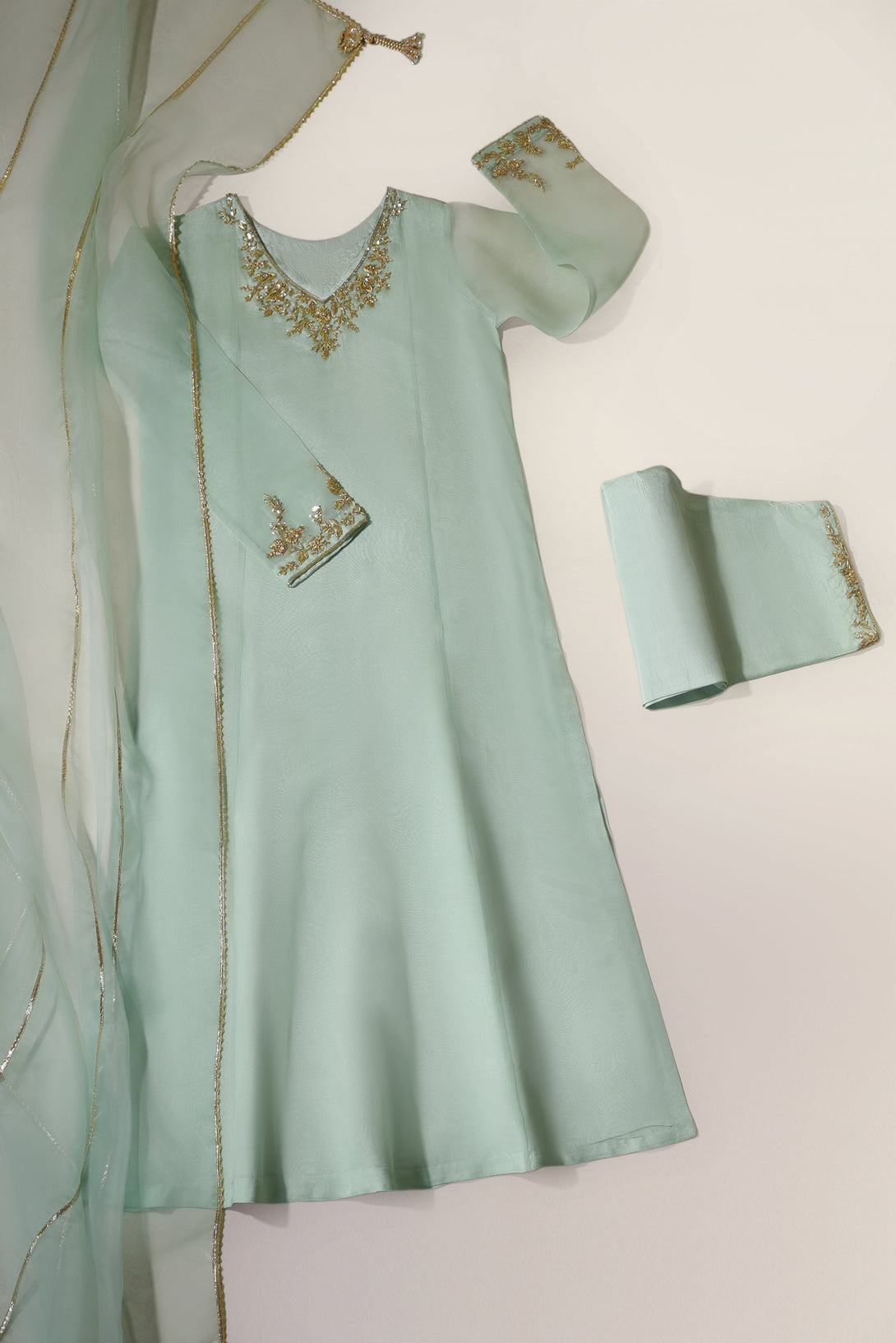 Presenting festive must haves. All masterfully tailored to be dressed up or down according to the occasion. Agha Noor's feminine ensembles will be your go to looks for your celebratory events. This design is meticulaously crafted on a aqua green ( pure organza ) in details that are truly Agha Noor. Adorned with elaborate hand/Ada work, making this one of our most sought after designs. Paired with a pure organza dupatta and trousers as seen, create a lasting impact.
