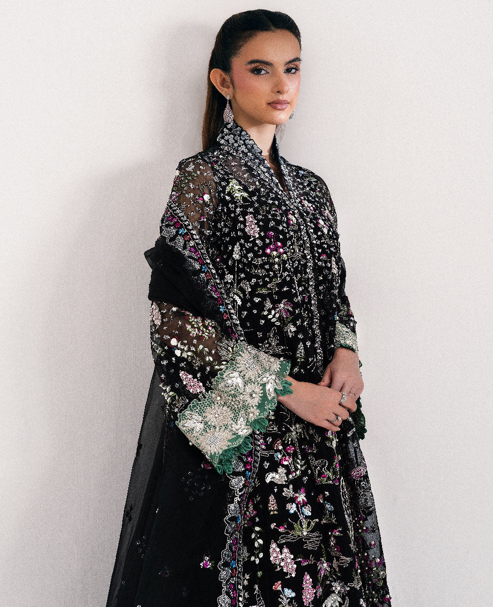 A black, six-paneled organza shirt adorned with intricate shikargah motifs intertwined with delicate florals cascading across the panels. Serene blue arches complement two hem borders in green and hot pink, finished beautifully with lace. The shirt features a sequin collar, while the sleeves are richly decorated with sequins and floral embroidery, highlighted by a green border and looped detailing at the cuffs. The organza dupatta showcases a sequin spray at the center, framed by a four-sided floral border. Completing the ensemble are black raw silk lehnga trimmed with gotta borders at the hem.