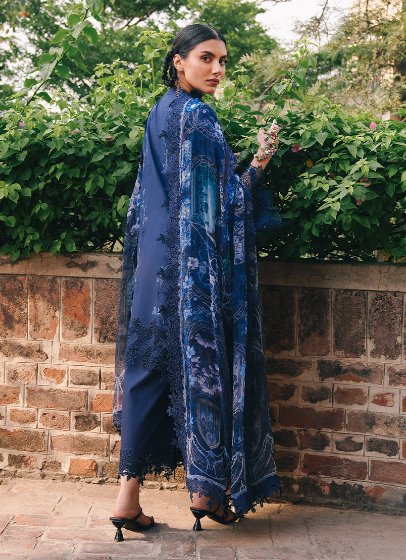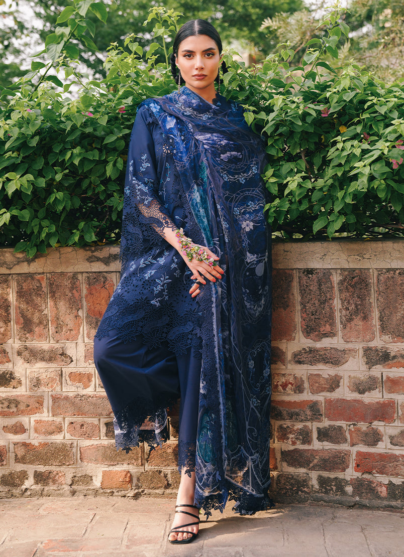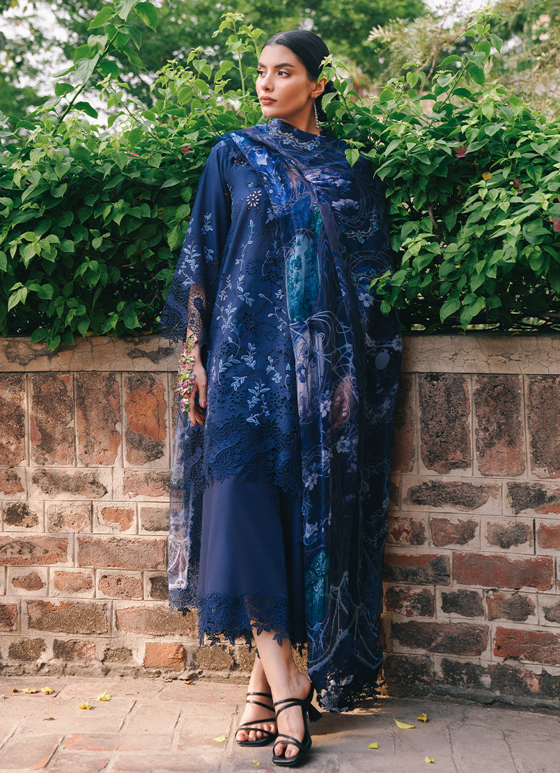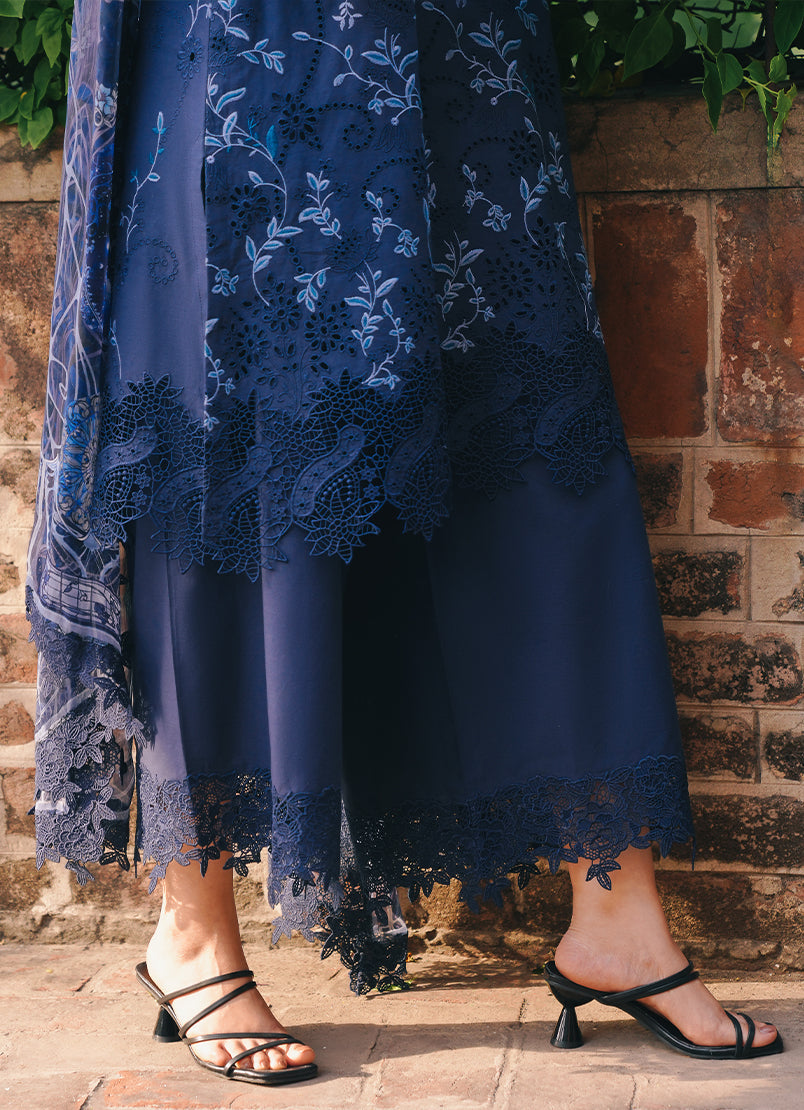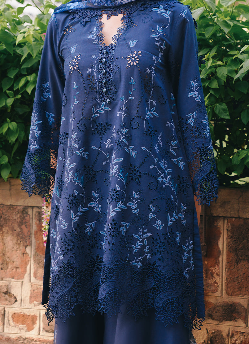Azelia in Navy from our Summerkari '25 Collection. An embroidered cotton lawn 3-piece outfit paired with cotton cambric trousers & digital printed chiffon dupatta.