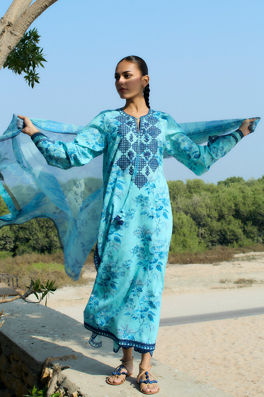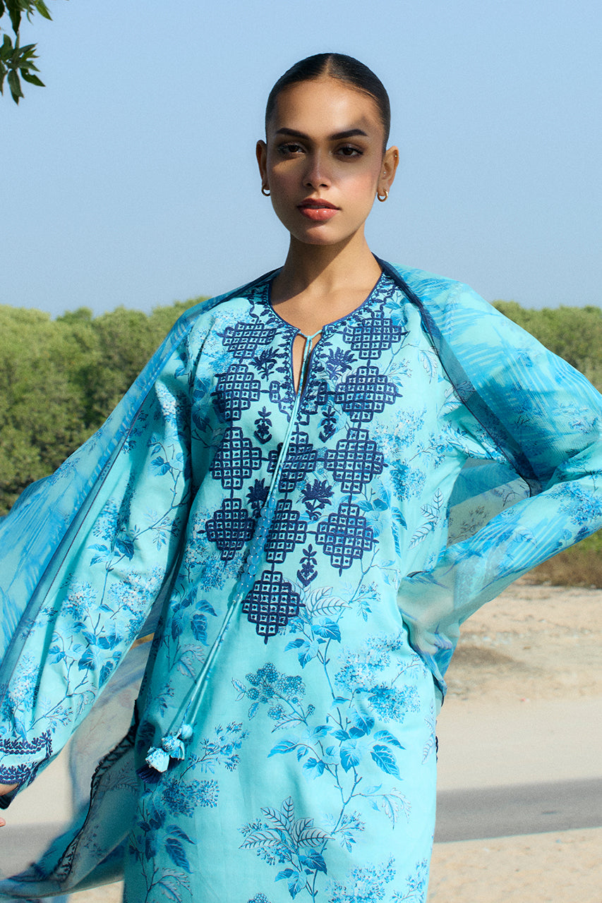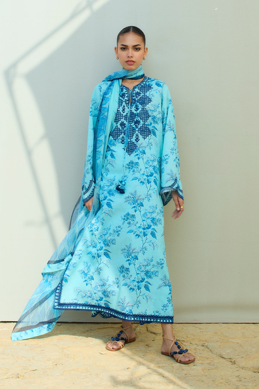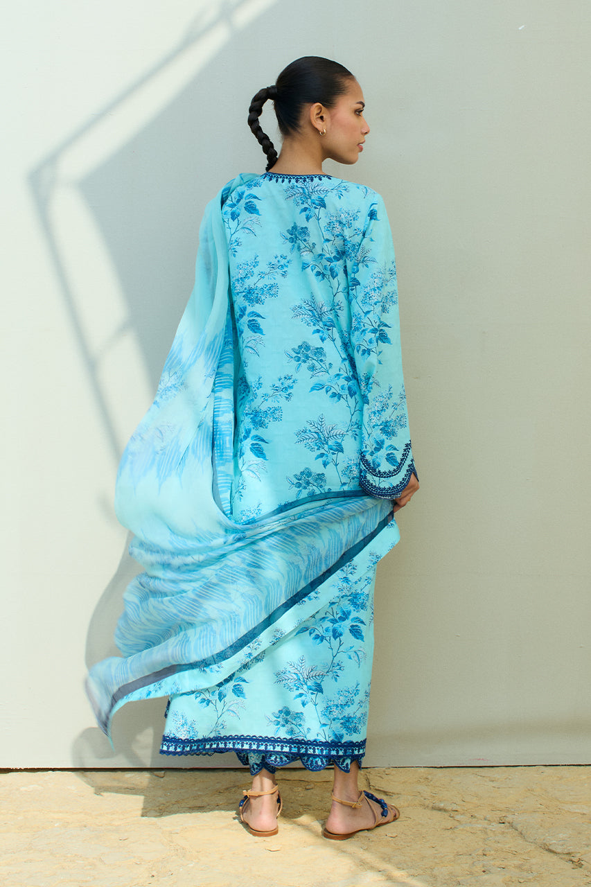 A sky blue hued jacquard lawn shirt and culottes are rendered with a deeper toned floral imagery. Embroidered aari details decorate the neckline and the scalloped sleeves and culottes. An ikat inspired print on the pure chiffon dupatta, in hues of the sky, maintains the subtle charm of the outfit.