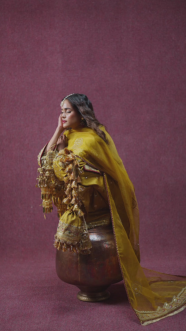 A mustard Indian silk shalwar kameez featuring an embroidered neckline and a finely bordered shirt. The matching shalwar is detailed with twin chan and elegant borders, paired with a block-printed organza dupatta for a rich festive finish.