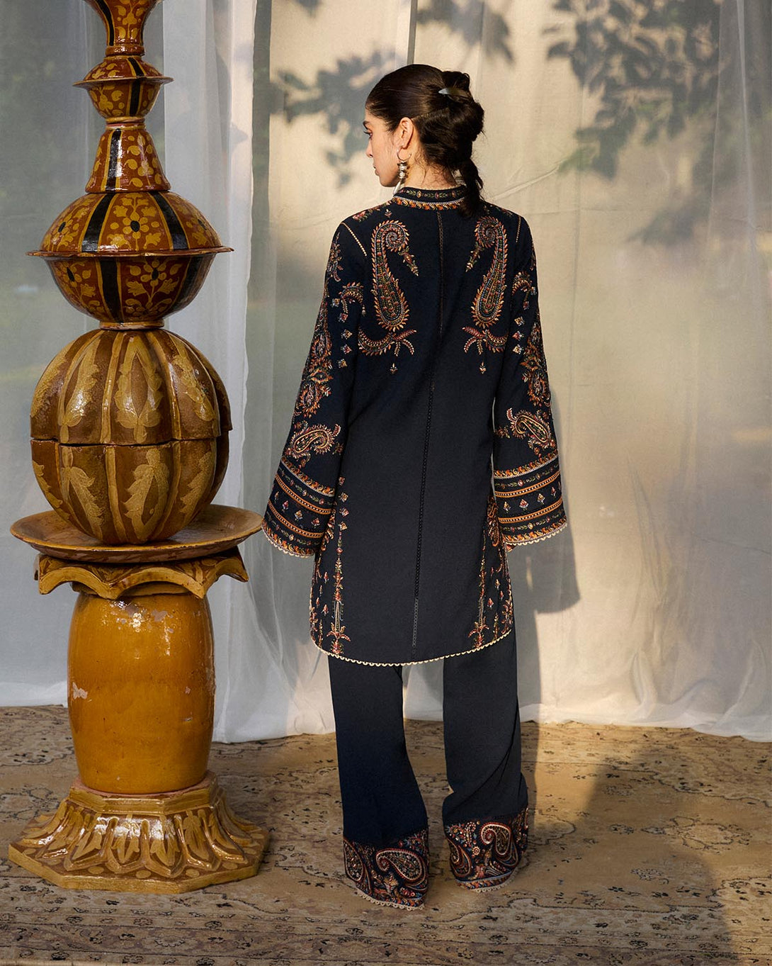 Description: A mid-length blue shirt, embroidered in Kashmiri motifs and adorned with tassels. Bell sleeves and straight pants carry the design language forward, while the embroidered scarf ties it all together in effortless grace.