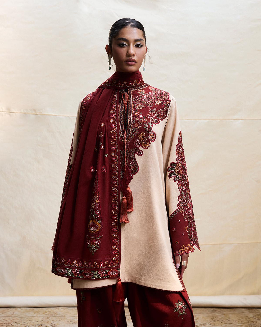 Description: A beige short shirt with Kashmiri embroidery in rust tones at the neckline, framed with playful tassels. Bell sleeves with embroidered patches extend the story, while a rust shalwar and scarf complete the look in warm, earthy elegance.