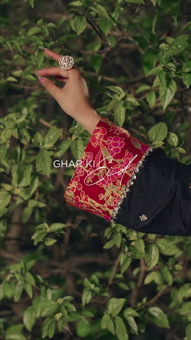 The pure raw silk shirt is beautifully enhanced with delicate hand embellishments and intricate embroidery, adding a refined shimmer and elevating its festive appeal. Paired with the shirt are screen printed sharara pants made from premium Korean raw silk. Completing the ensemble is a lightweight chiffon dupatta, adorned with subtle spray detailing for a soft, sparkling effect. The dupatta is finished with a finely screen printed border, perfectly complementing the embroidery and printed sharara.