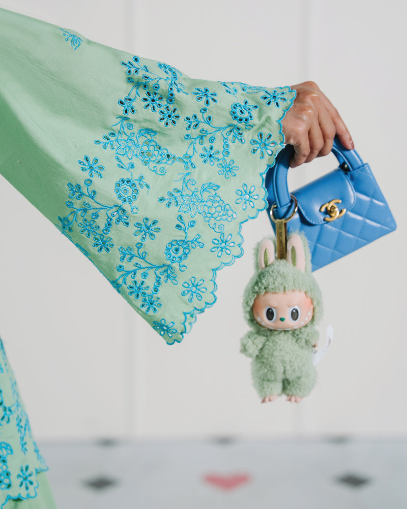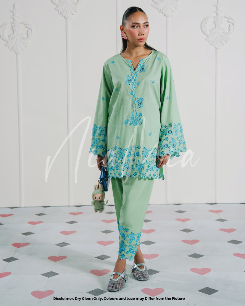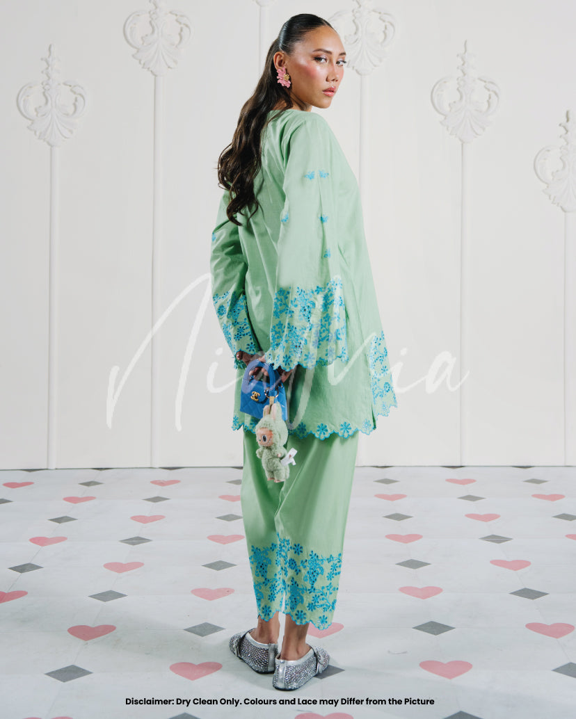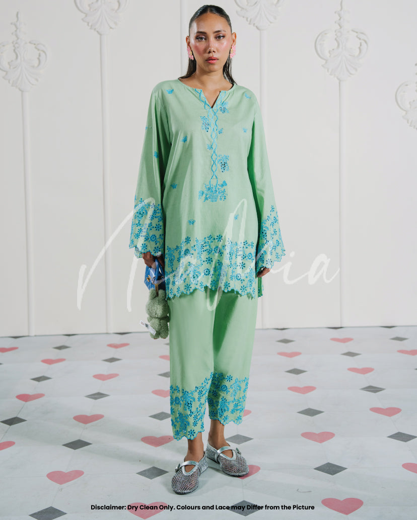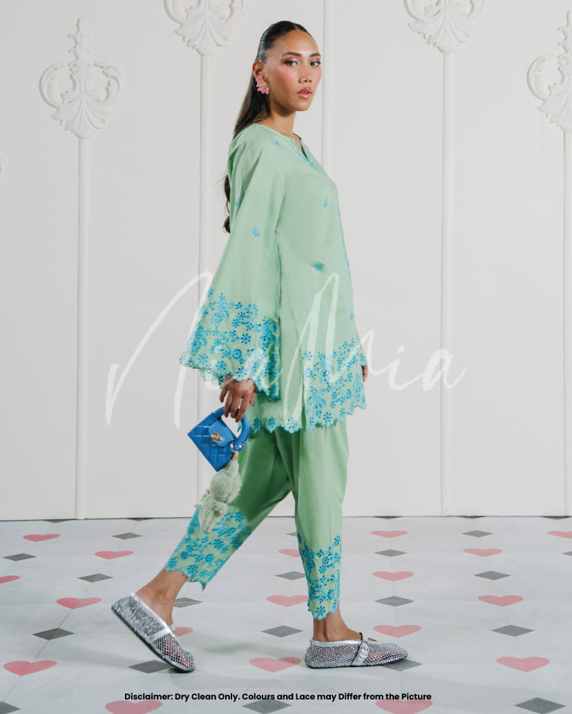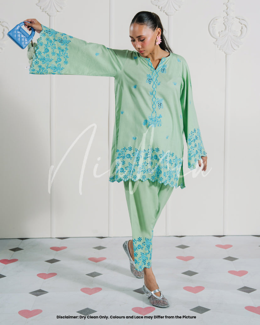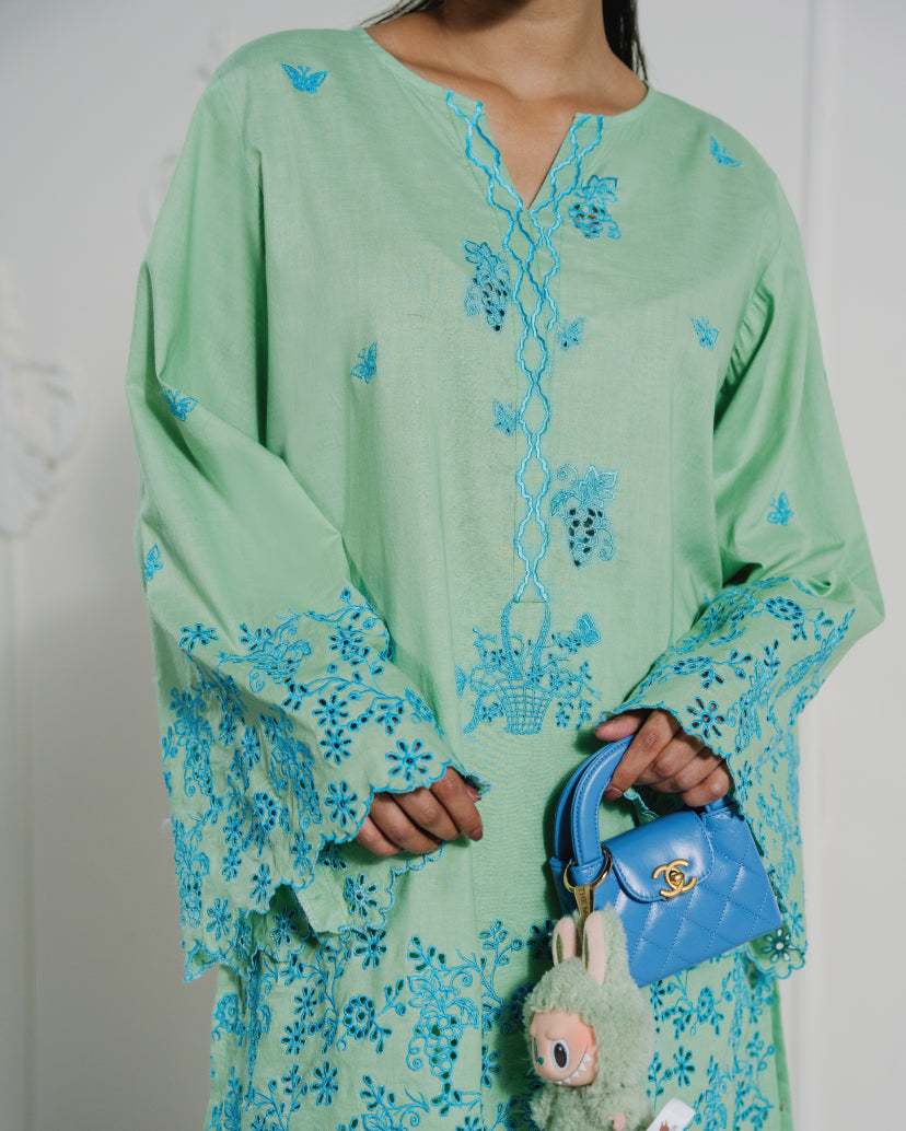 A two-piece embroidered set in refreshing mint green, brought to life with intricate blue floral embroidery. The shirt features a soft V-slit neckline with delicately worked borders on the sleeves and hem, adding a touch of finesse. Paired with matching embroidered shalwar, this look blends cool tones with timeless elegance for a refined summer statement.