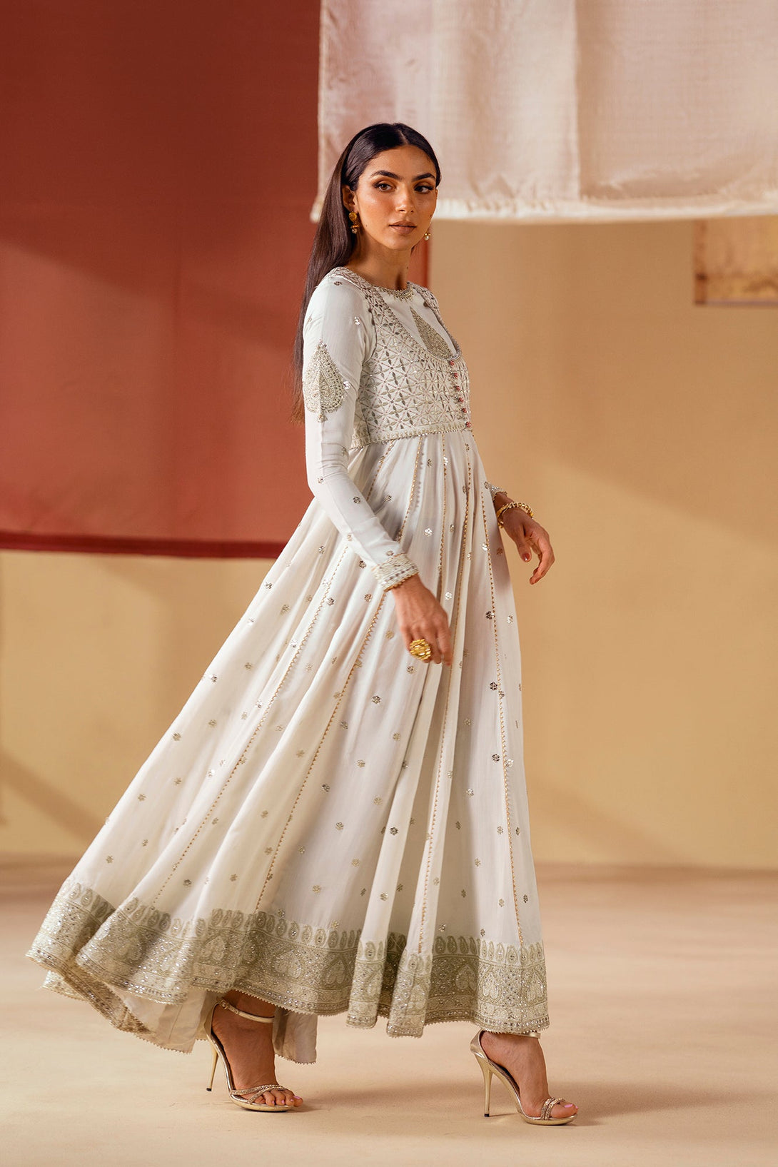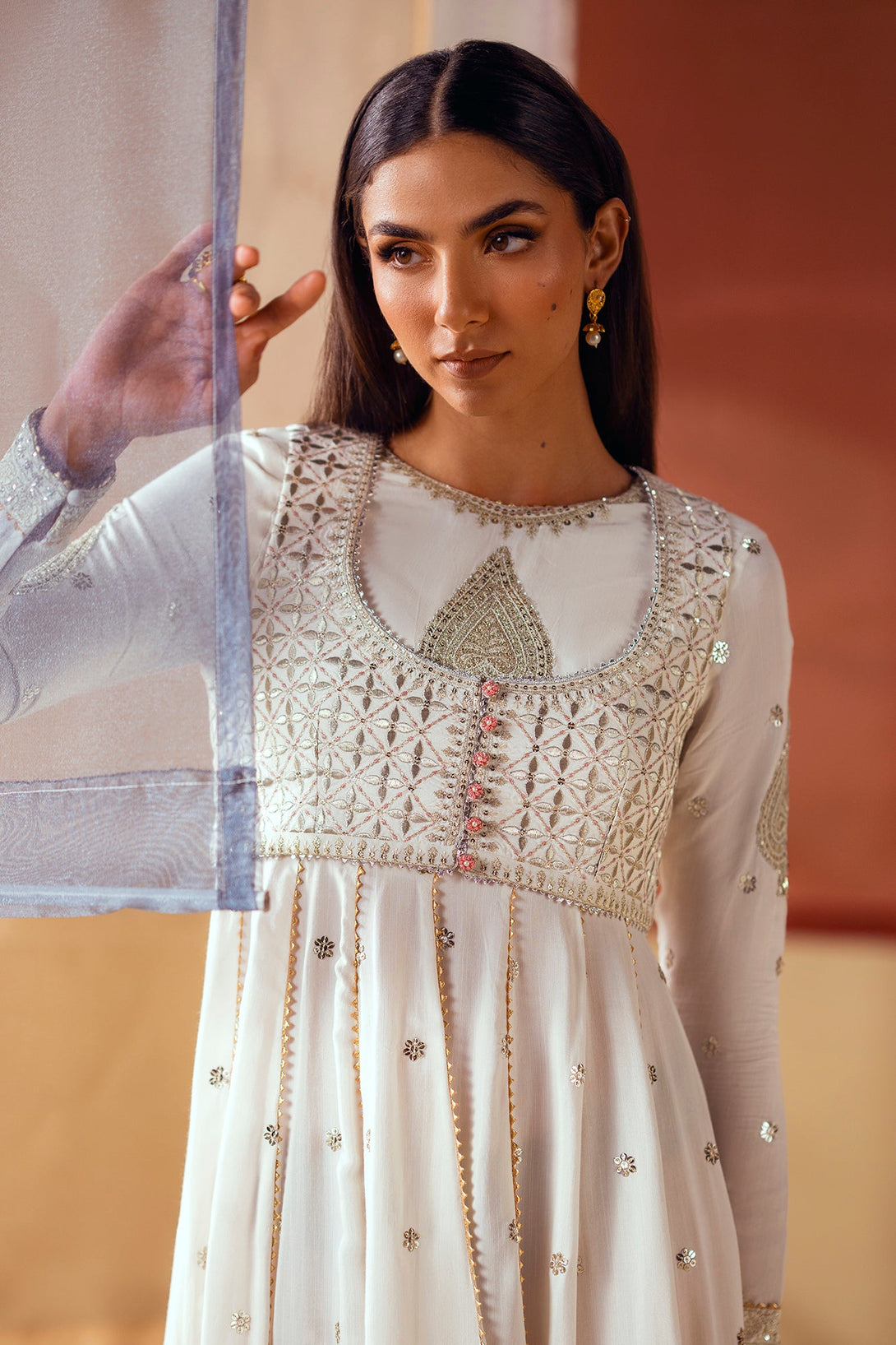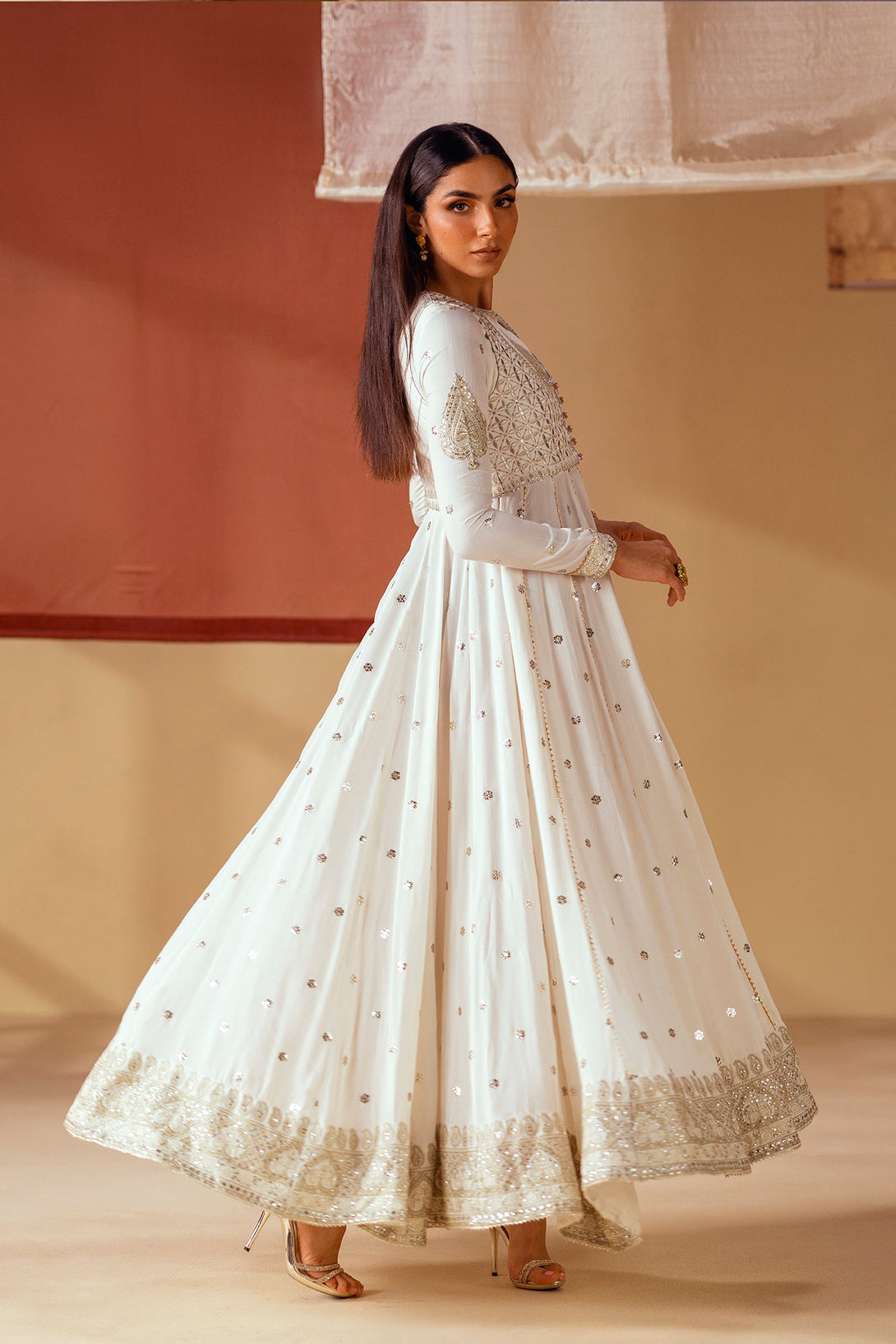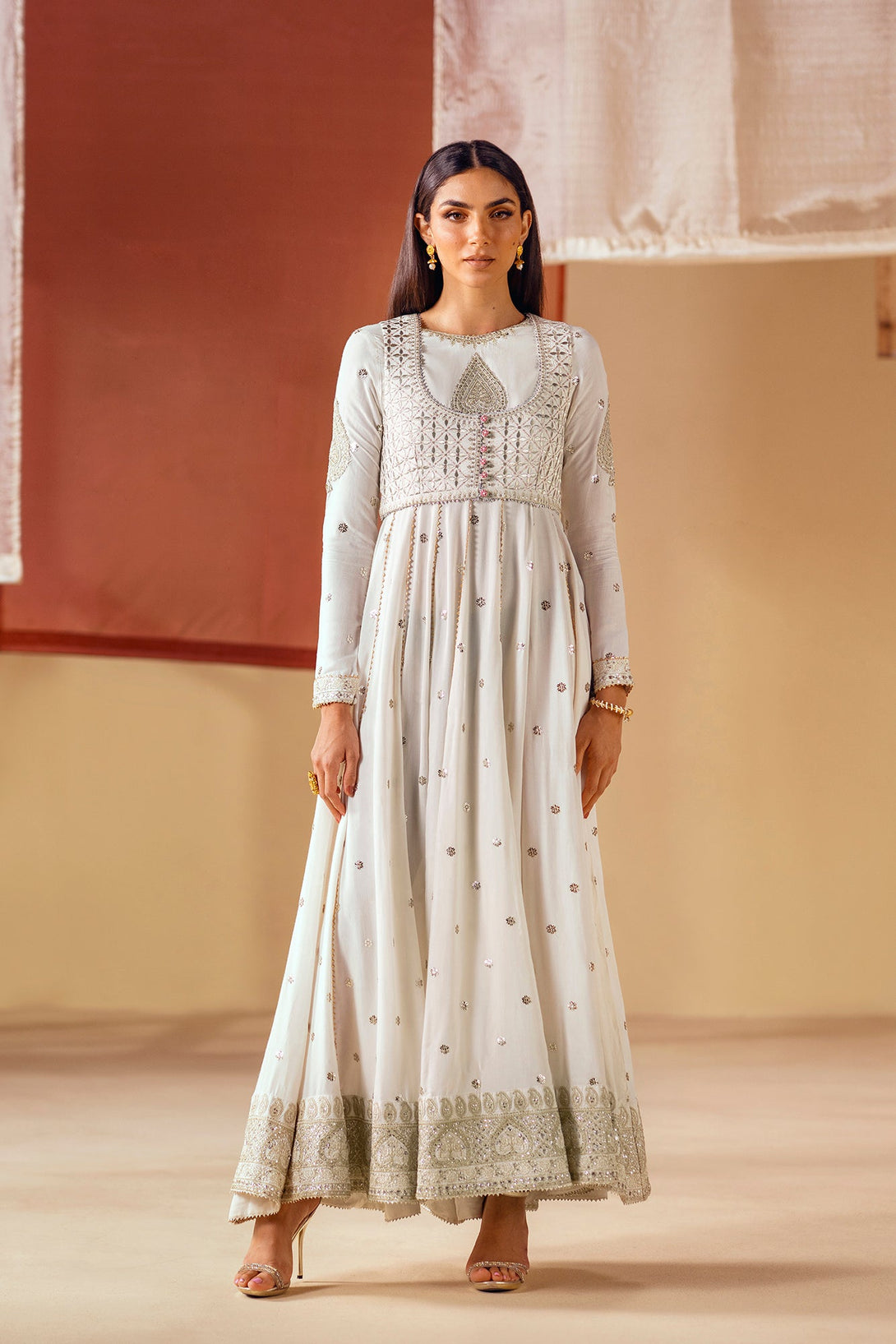 Unleash your inner goddess with this ethereal embroidered pishwas. The long, flowing pishwas in a crisp white fabric is adorned with delicate, shimmering details and intricate silver and gold embroidery on the bodice. It is complemented by a matching waistcoat with a striking, heavily embroidered pattern that adds a layer of sophistication. This ensemble is a timeless choice, perfect for a celebration.