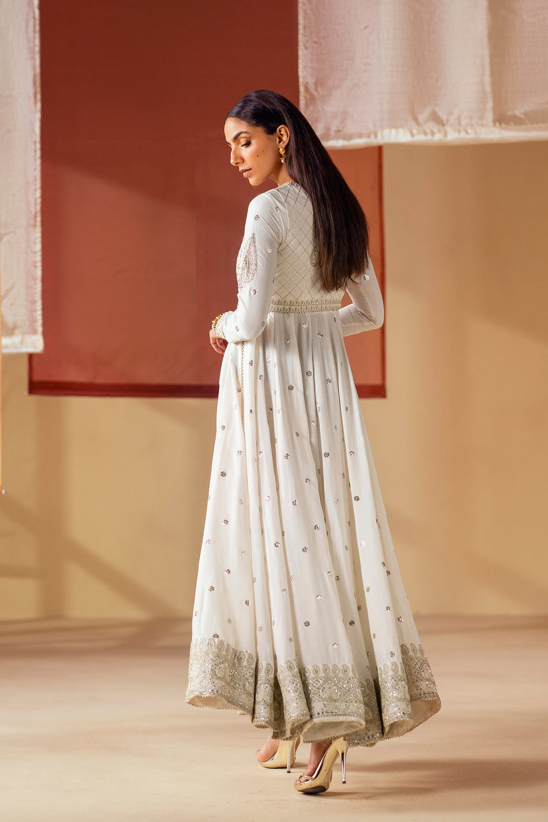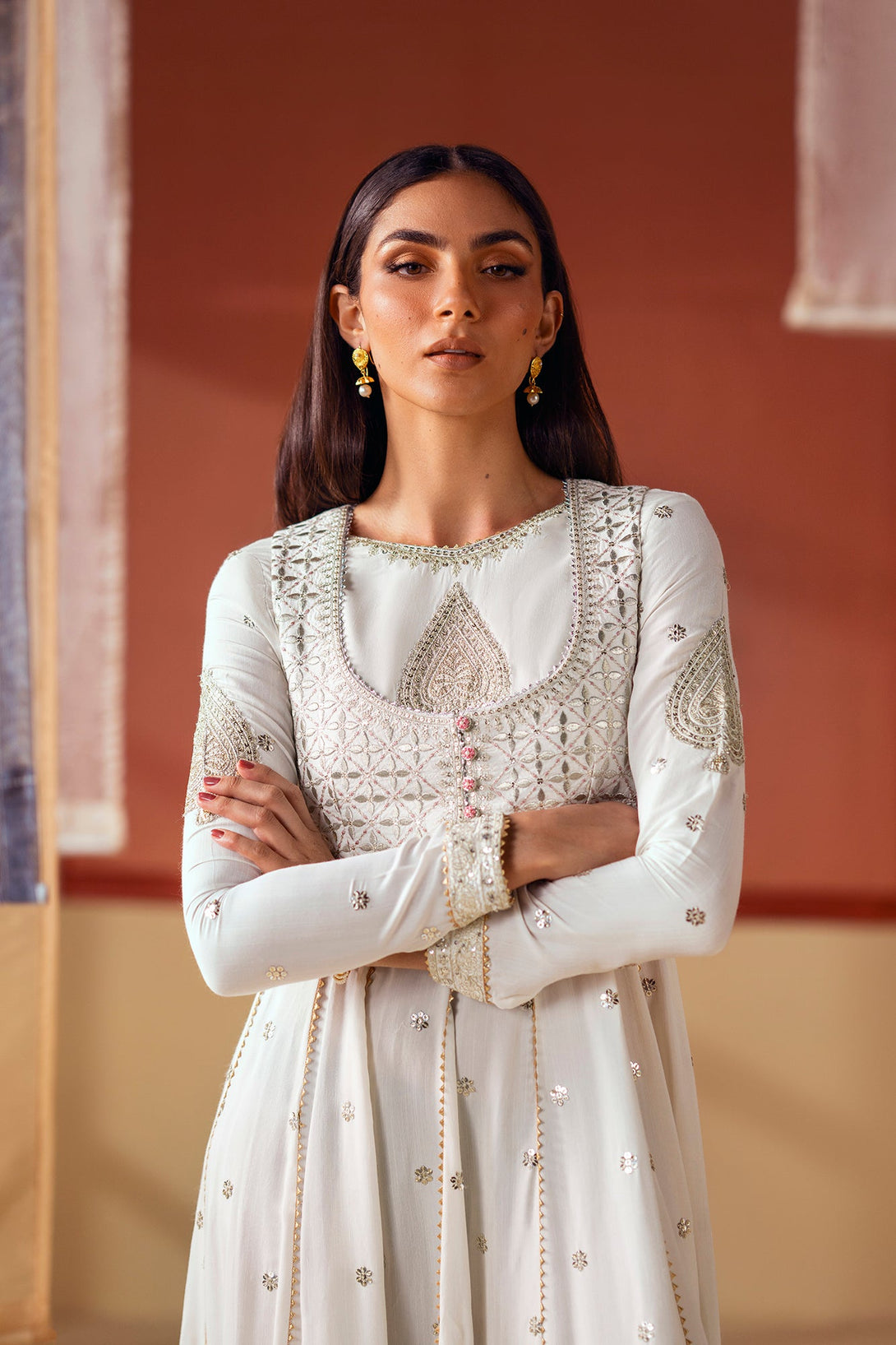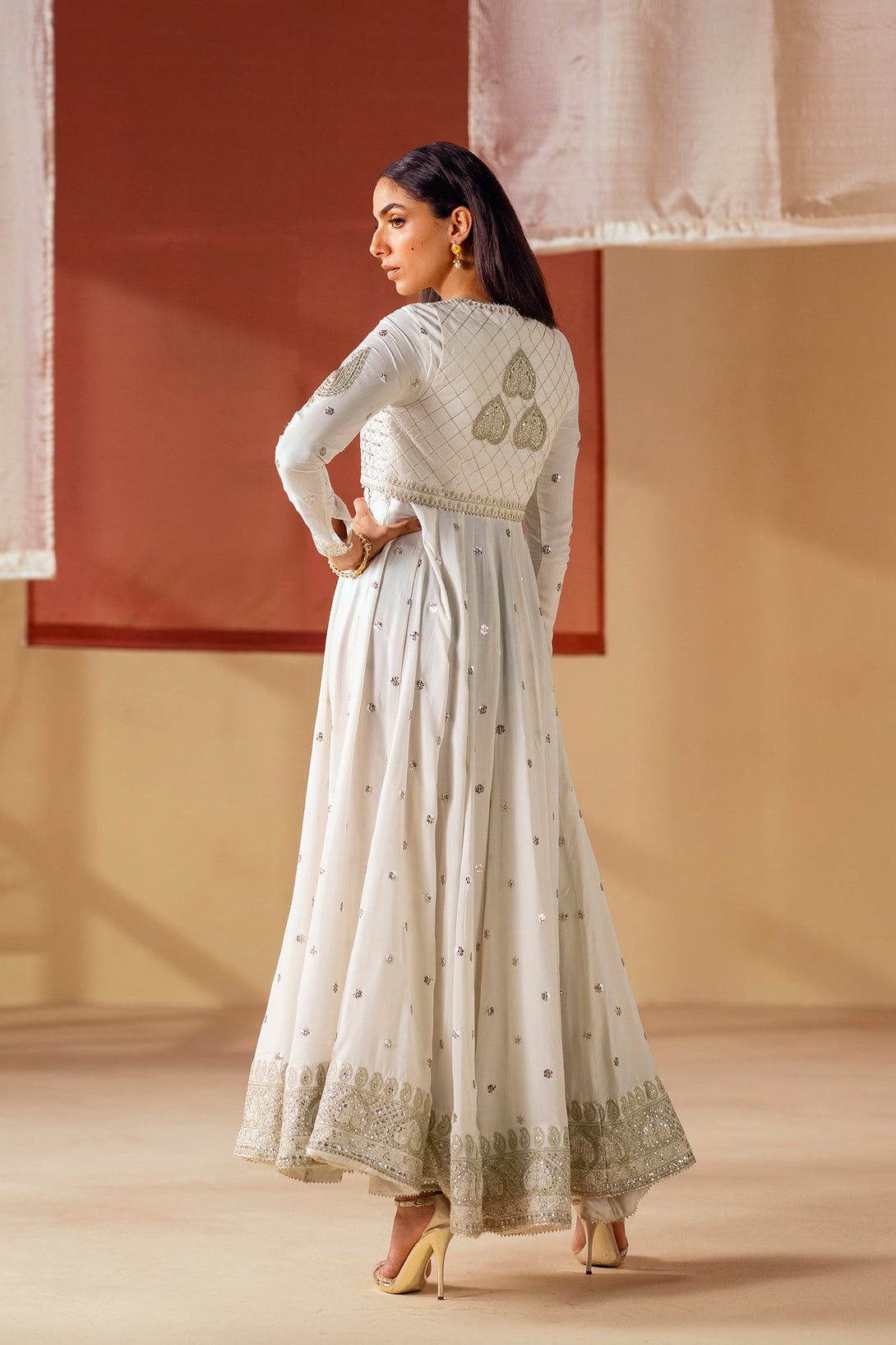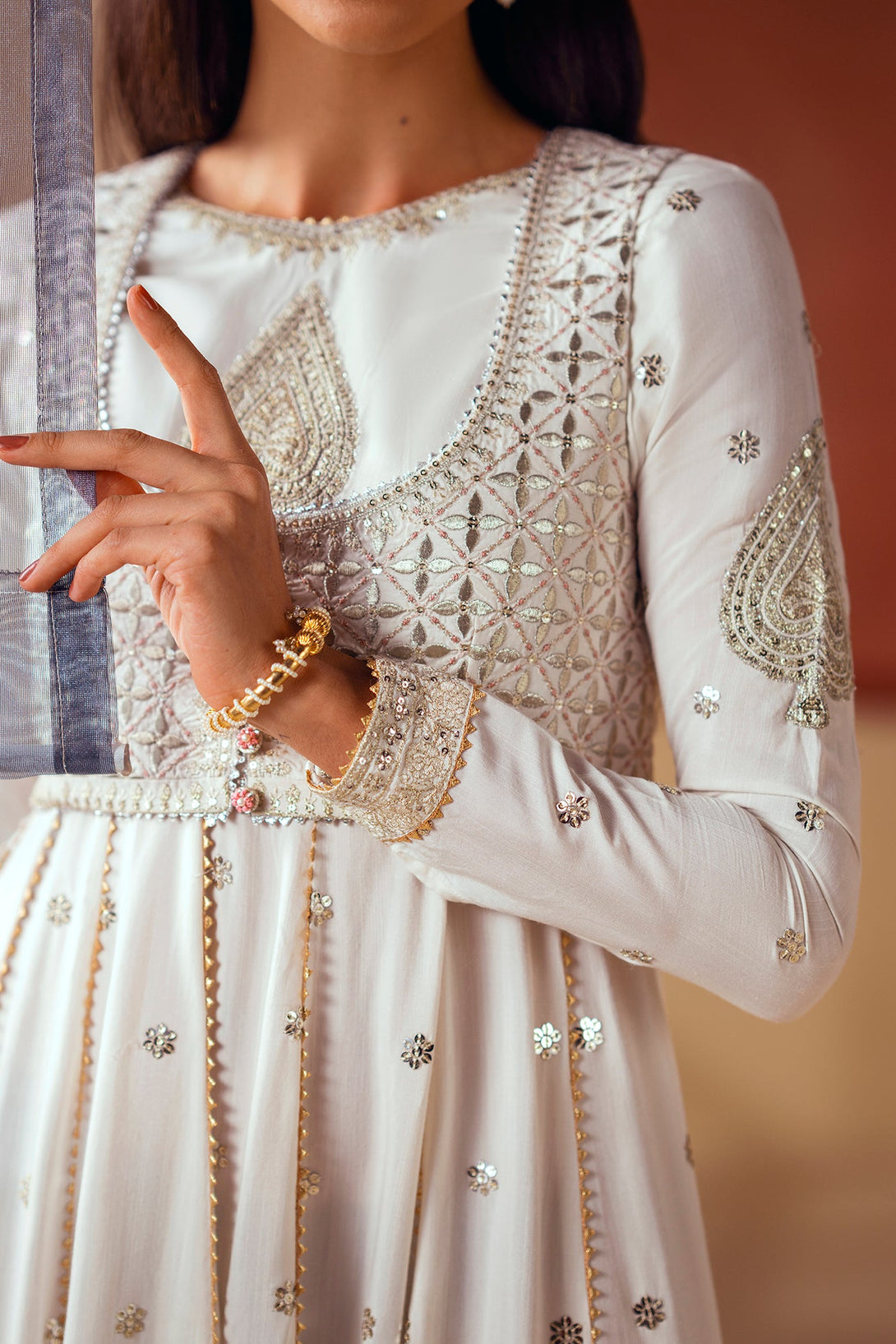 Unleash your inner goddess with this ethereal embroidered pishwas. The long, flowing pishwas in a crisp white fabric is adorned with delicate, shimmering details and intricate silver and gold embroidery on the bodice. It is complemented by a matching waistcoat with a striking, heavily embroidered pattern that adds a layer of sophistication. This ensemble is a timeless choice, perfect for a celebration.