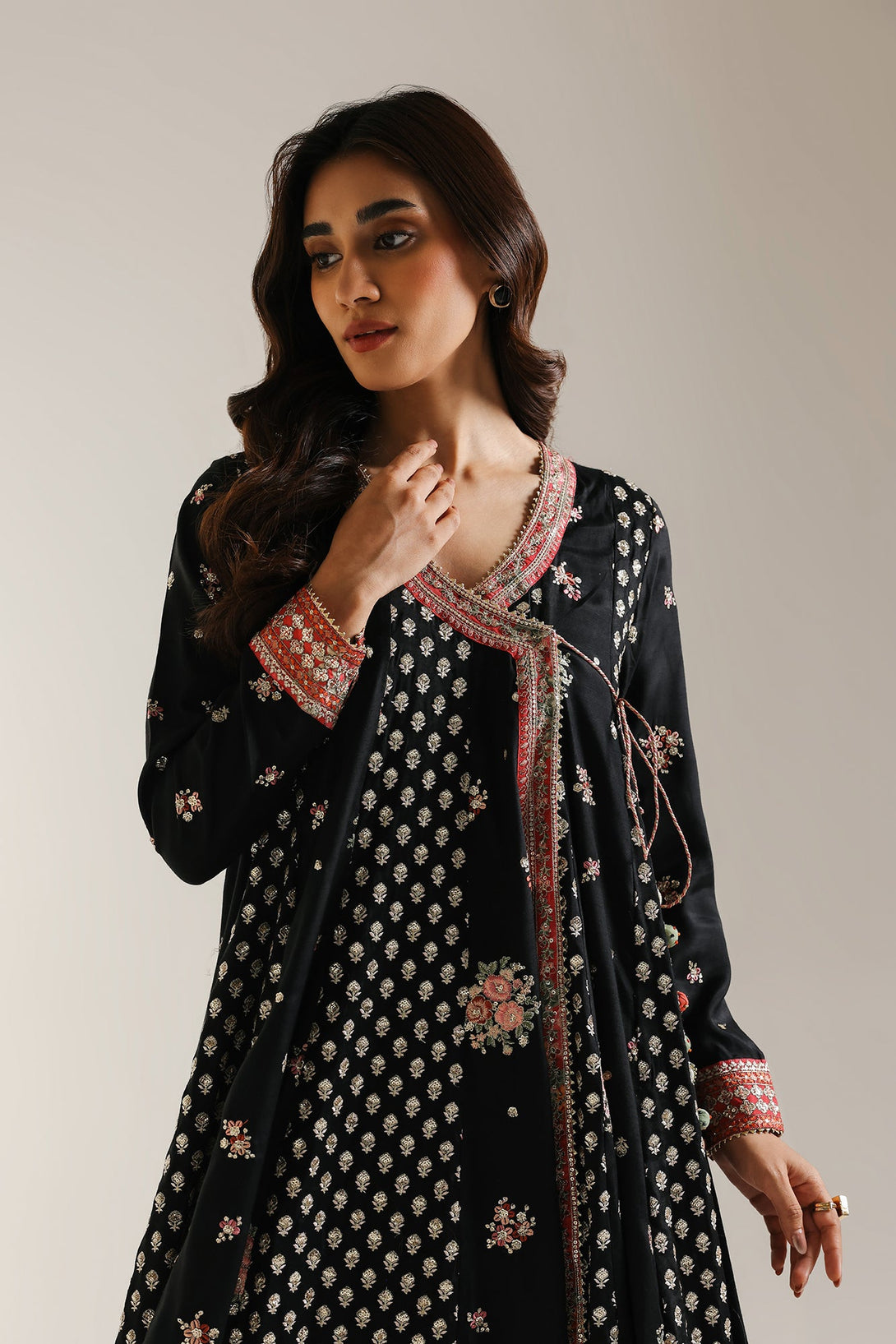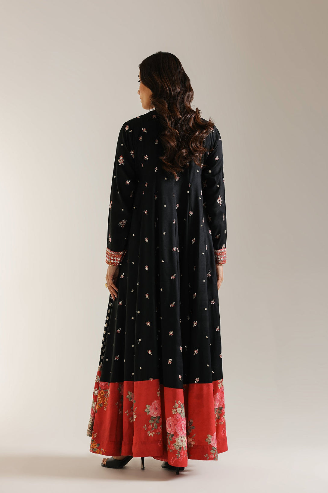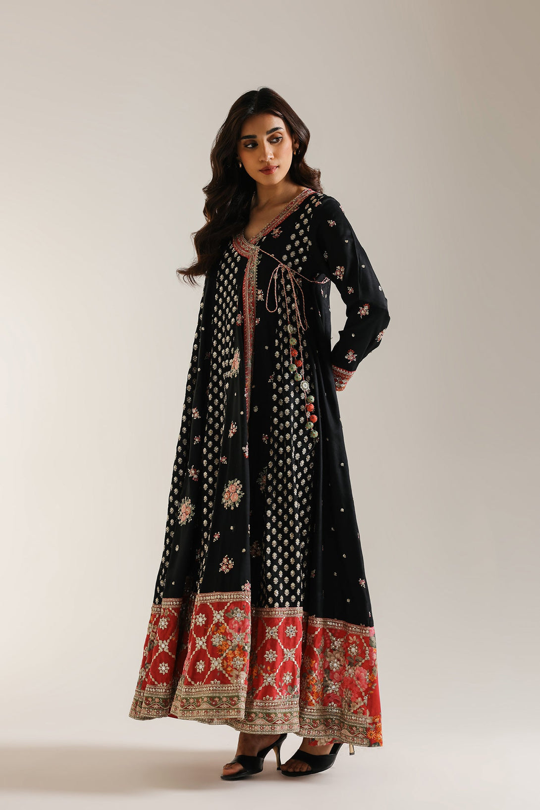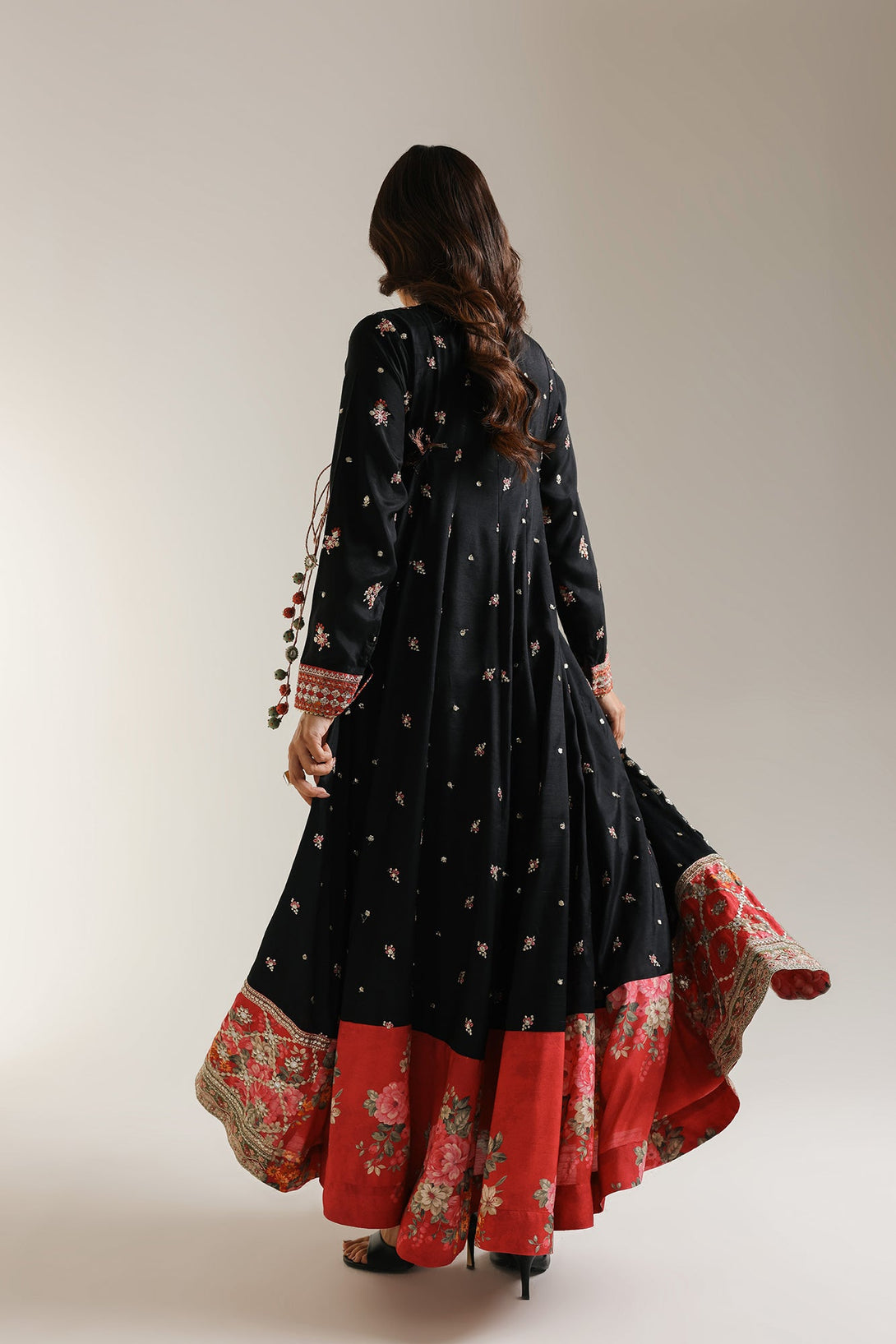Step into an enchanting realm with this magnificent black pishwas, a true masterpiece of traditional artistry and vibrant embellishments. This stunning full-length dress features a flattering silhouette, richly adorned with intricate embroidery and delicate beadwork, showcasing diverse patterns including floral motifs, and geometric designs. The vibrant red and gold border around the flared hem adds an opulent contrast, making this pishwas truly stand out. This pishwas is ideal for grand festive celebrations, formal dinners, or making an unforgettable and graceful statement at any special occasion.