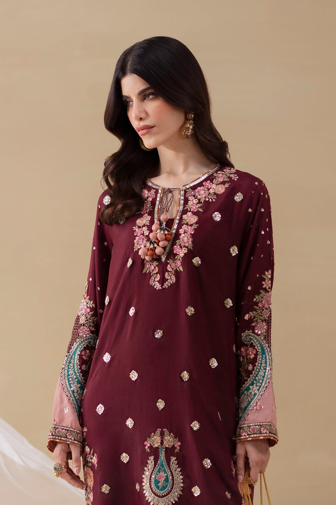 Channel regal richness in this stunning deep burgundy embroidered dress. This long, straight-cut dress is crafted from a deep burgundy fabric and is lavishly embellished with pink, gold, and turquoise thread embroidery. The design features large paisley and botanical motifs down the front, with scattered sequins adding a subtle sparkle. The hem and sleeves boast a striking border in soft pink and teal, transitioning seamlessly from the main color. Completed with an embellished neckline and delicate tassels, this elegant dress is a magnificent choice for any formal event or celebration.