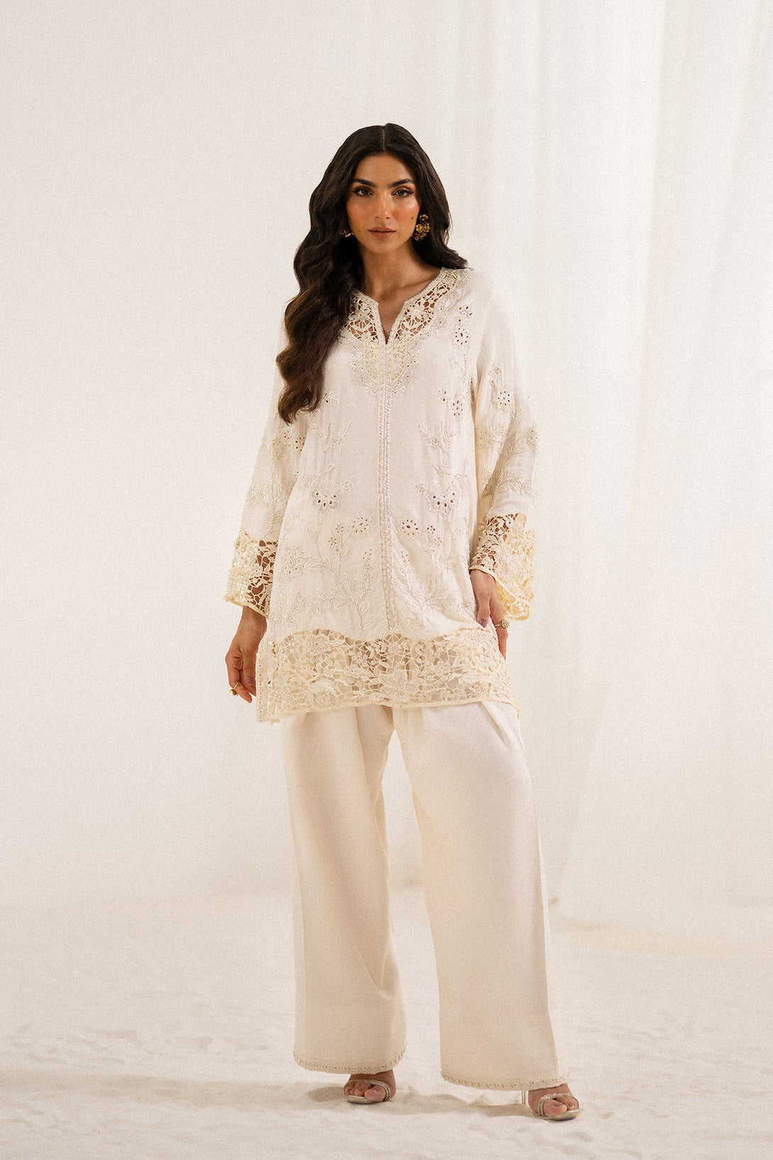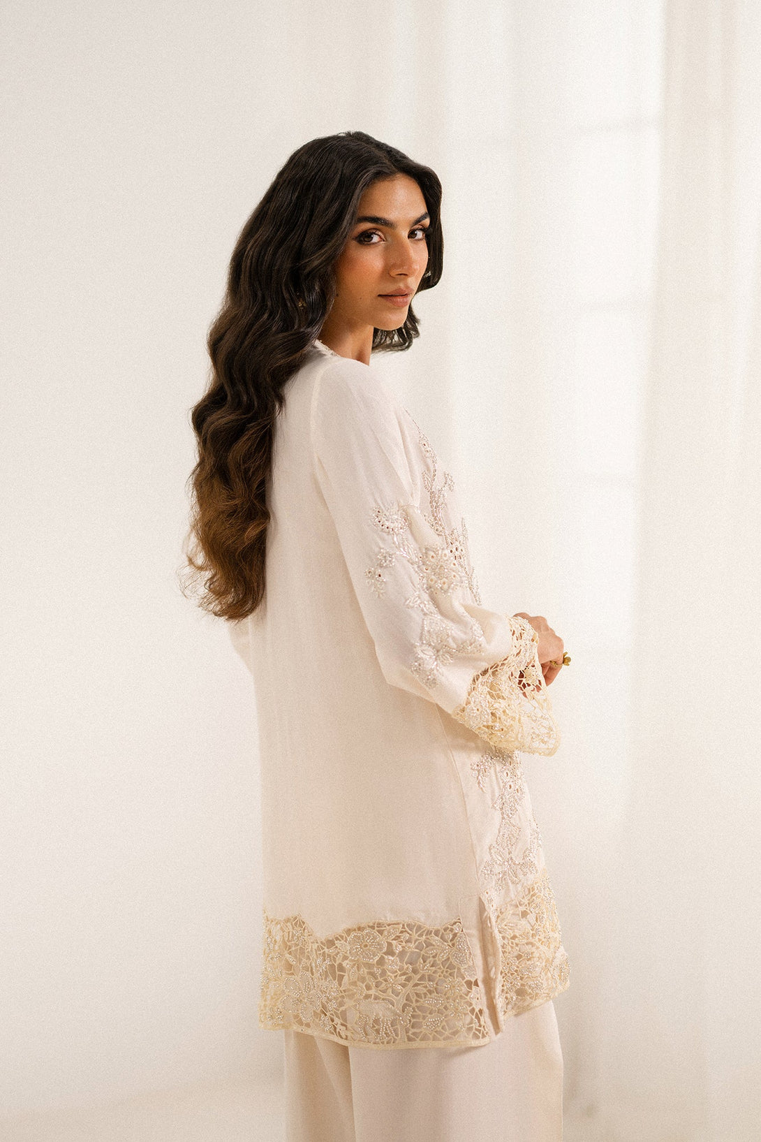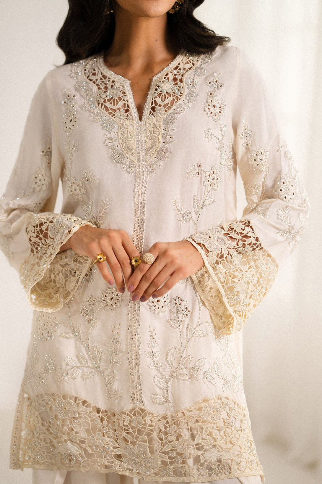 Embrace timeless grace with this exquisite ivory two-piece ensemble, designed for sophisticated charm and luxurious comfort. The pristine kurta is richly adorned with intricate monochrome embroidery, featuring delicate floral patterns and cutwork details that beautifully enhance the neckline, sleeves, and hem. Complemented by elegant wide-leg shalwar, this outfit creates a flowing and refined silhouette. Perfect for formal gatherings, festive celebrations, or making a statement of understated luxury.