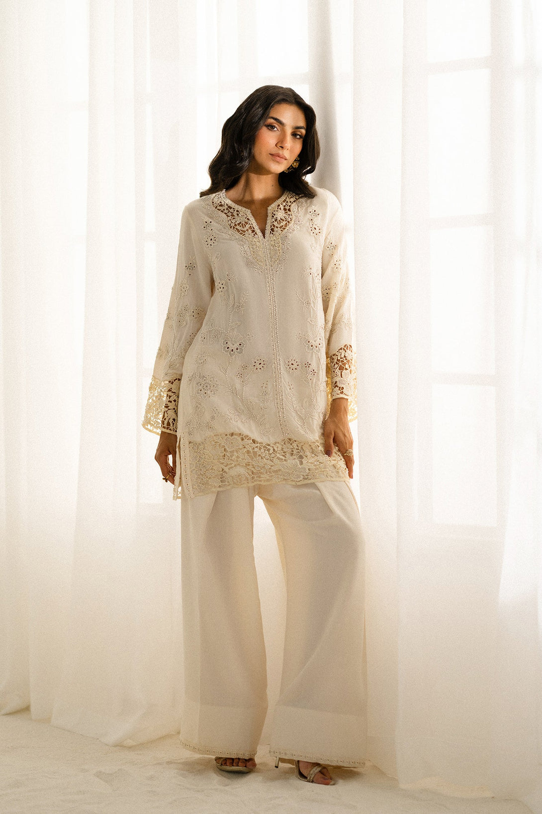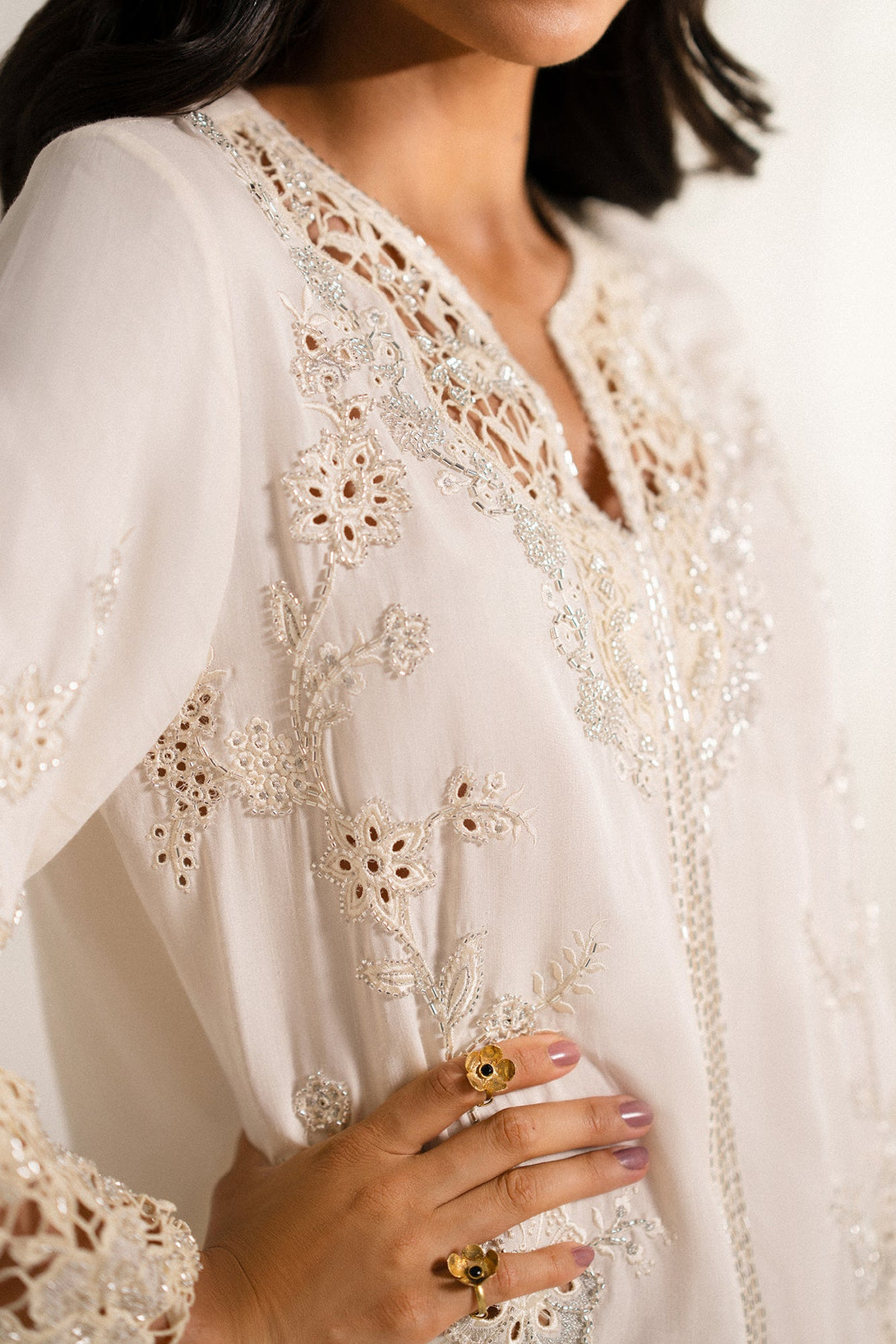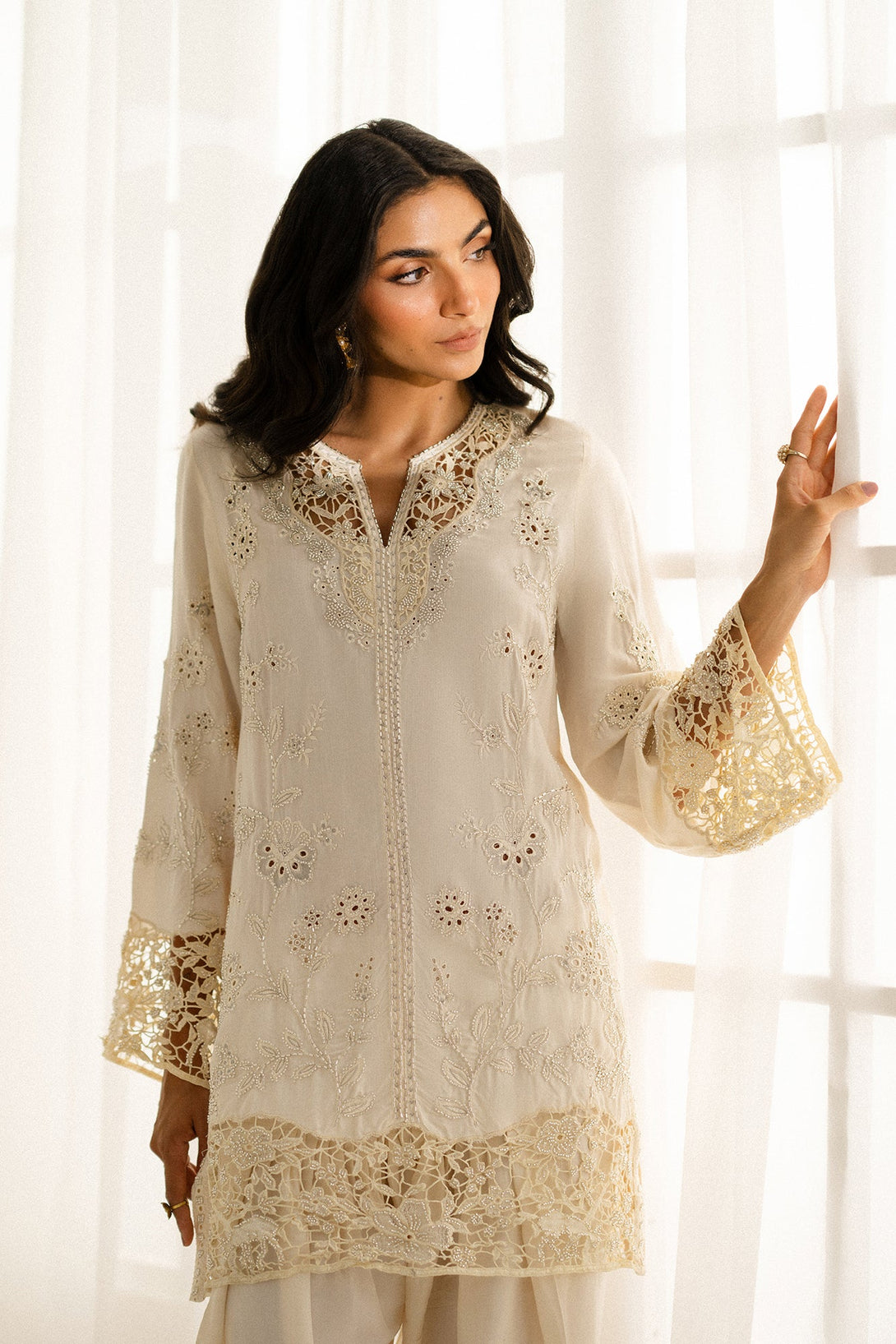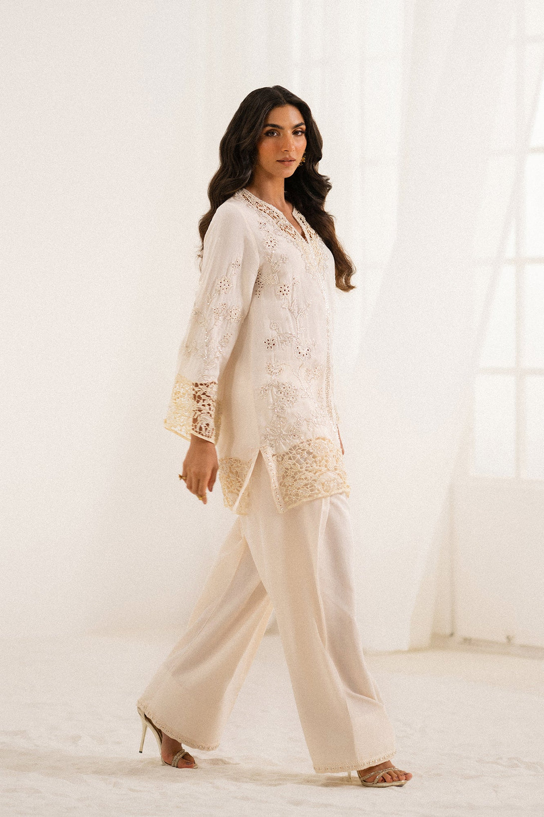 Embrace timeless grace with this exquisite ivory two-piece ensemble, designed for sophisticated charm and luxurious comfort. The pristine kurta is richly adorned with intricate monochrome embroidery, featuring delicate floral patterns and cutwork details that beautifully enhance the neckline, sleeves, and hem. Complemented by elegant wide-leg shalwar, this outfit creates a flowing and refined silhouette. Perfect for formal gatherings, festive celebrations, or making a statement of understated luxury.