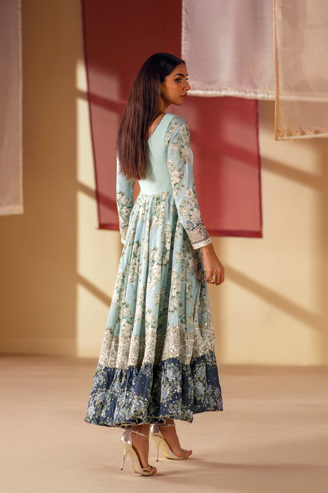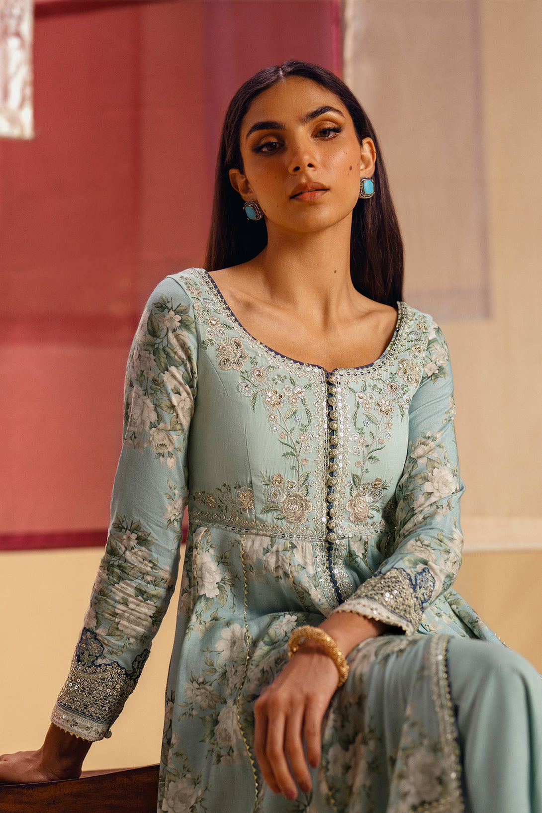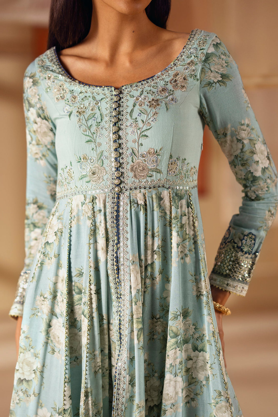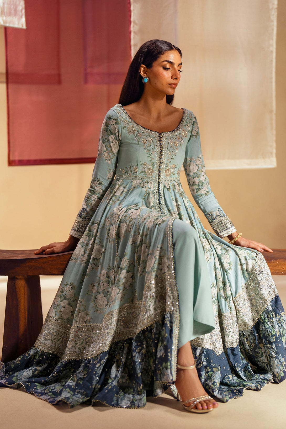 Step into a fairytale of serene grace. This beautiful pishwas and flapper suit features a light, seafoam-blue fabric with a graceful, flowing silhouette. The bodice is adorned with intricate embroidery in soft gold, while the voluminous skirt and flapper trousers are finished with a stunning, contrasting dark blue floral border. This ensemble is a perfect blend of timeless elegance and modern design, making it a captivating choice for any special event.