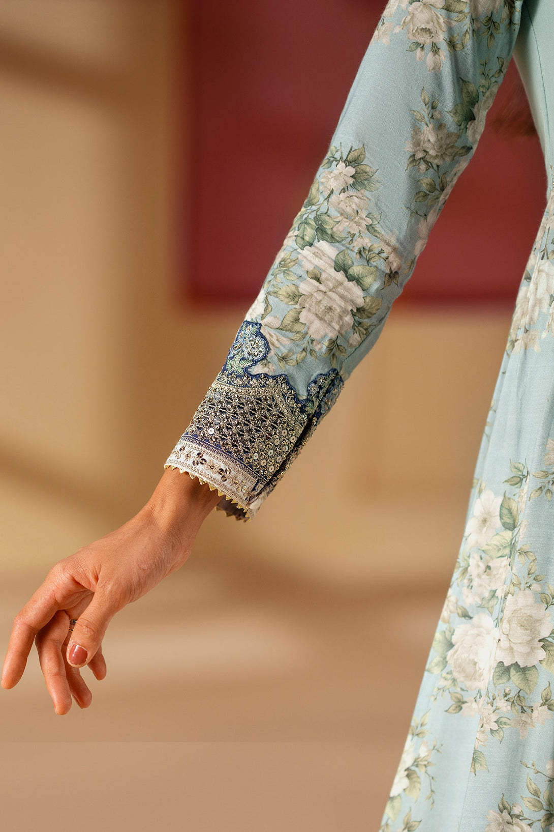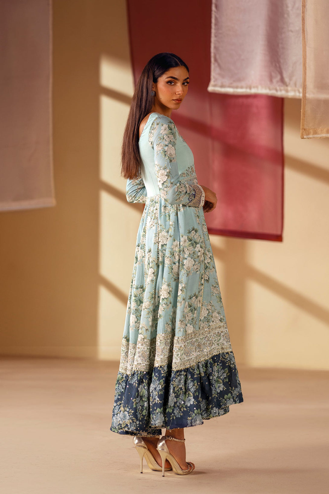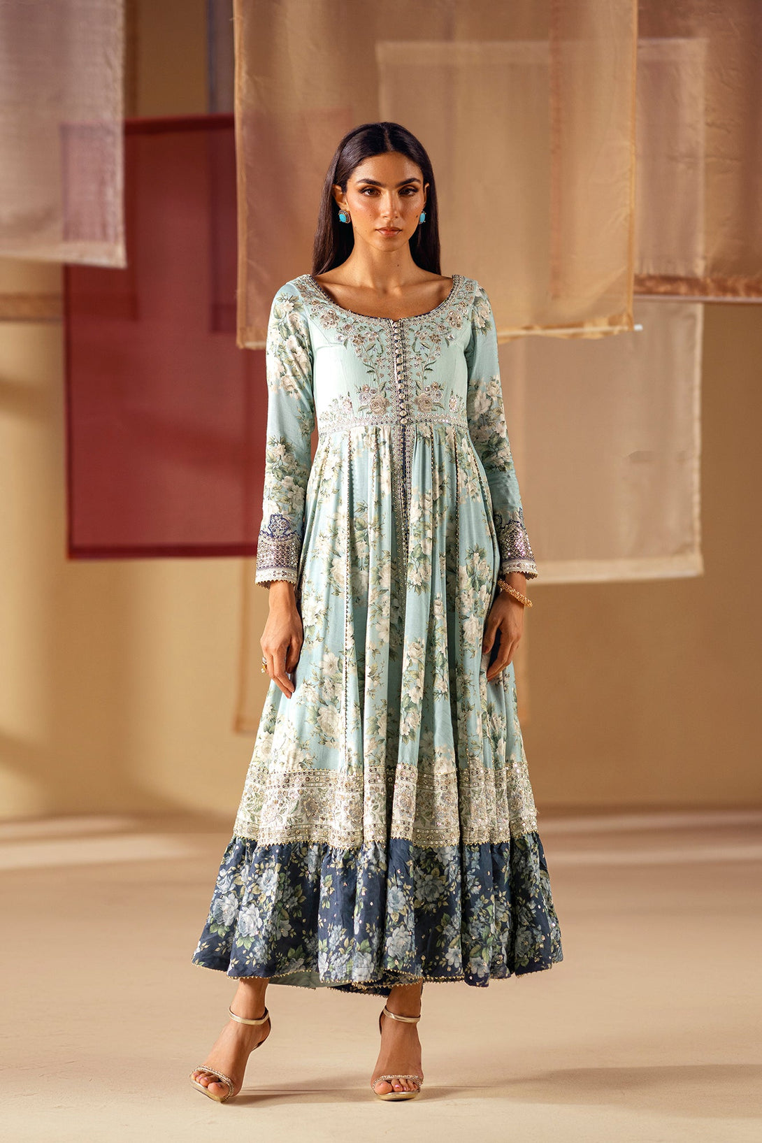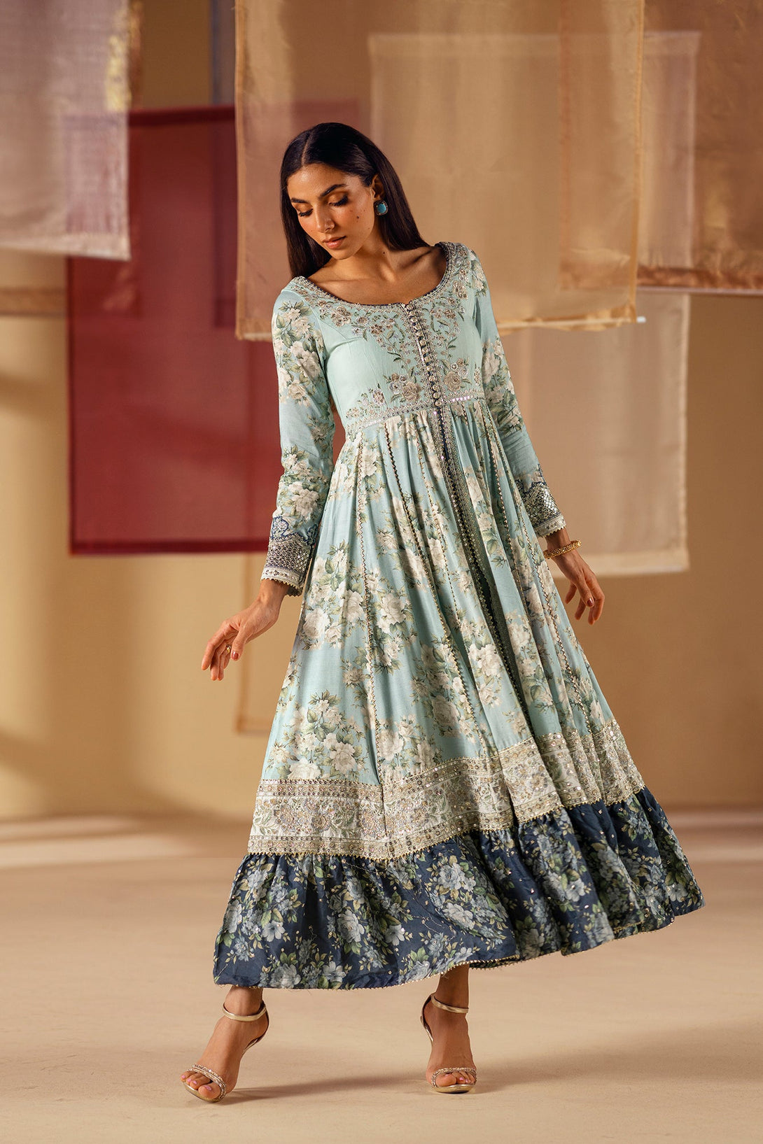 Step into a fairytale of serene grace. This beautiful pishwas and flapper suit features a light, seafoam-blue fabric with a graceful, flowing silhouette. The bodice is adorned with intricate embroidery in soft gold, while the voluminous skirt and flapper trousers are finished with a stunning, contrasting dark blue floral border. This ensemble is a perfect blend of timeless elegance and modern design, making it a captivating choice for any special event.