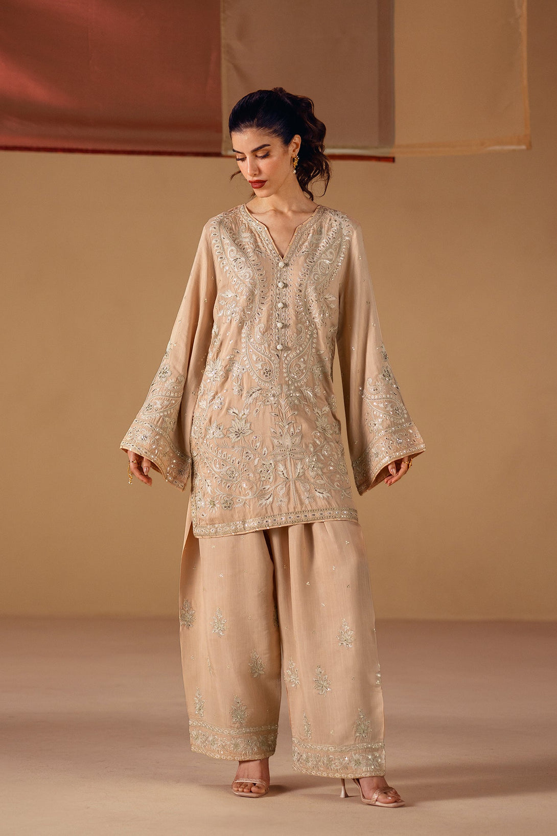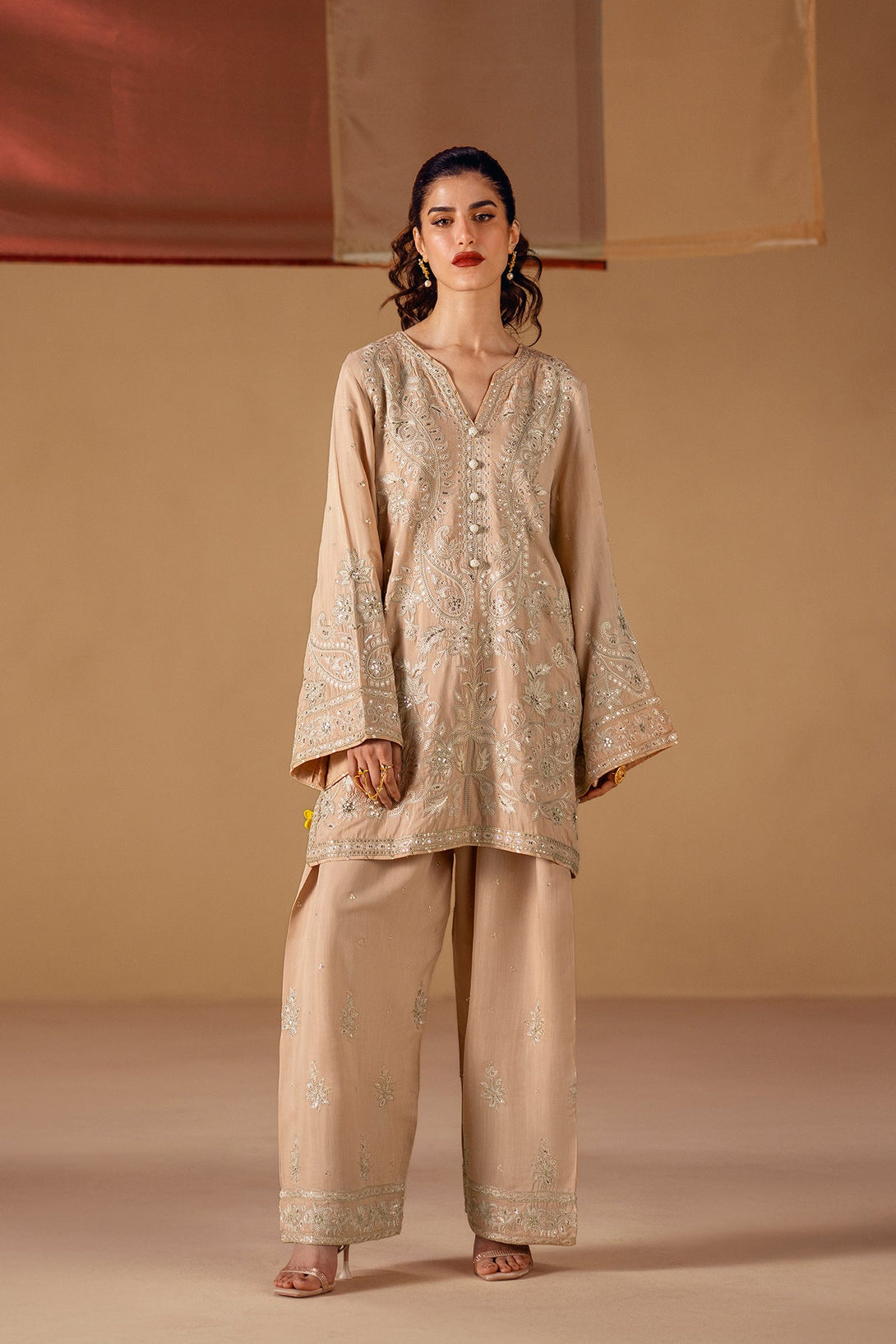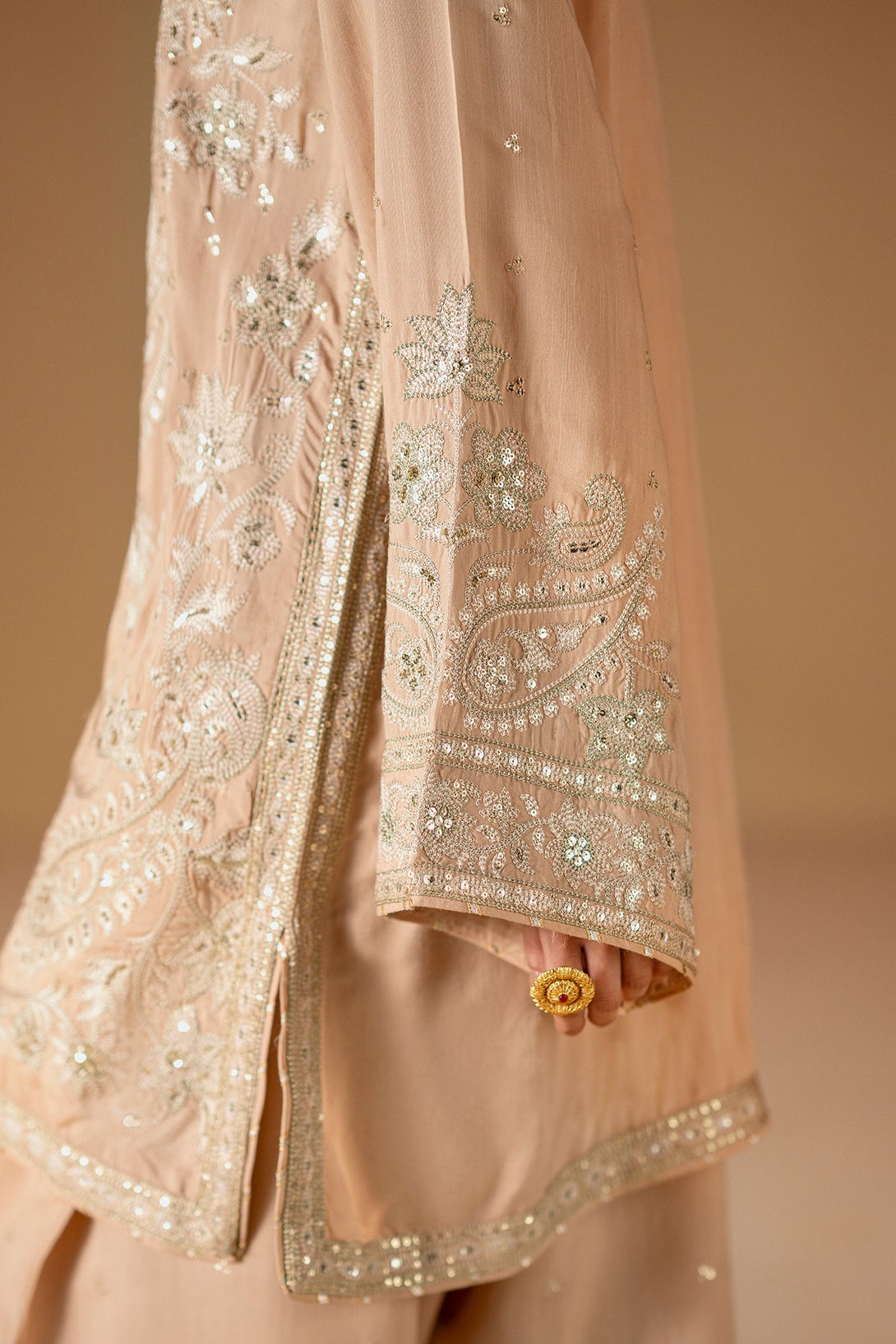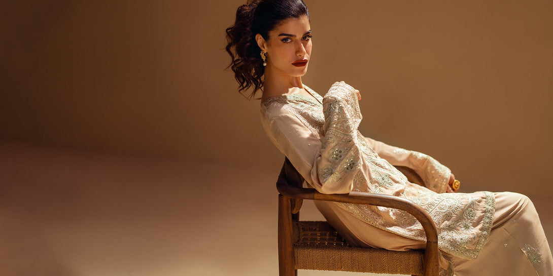 Embrace the elegance of golden artistry. This stunning suit features a light beige fabric that serves as a beautiful canvas for intricate silver and gold embroidery. The long, relaxed-fit shirt is adorned with delicate floral and ornamental patterns, while the wide-leg shalwar feature a matching embroidered border. This ensemble is a timeless choice, offering a perfect blend of modern comfort and artistic elegance.