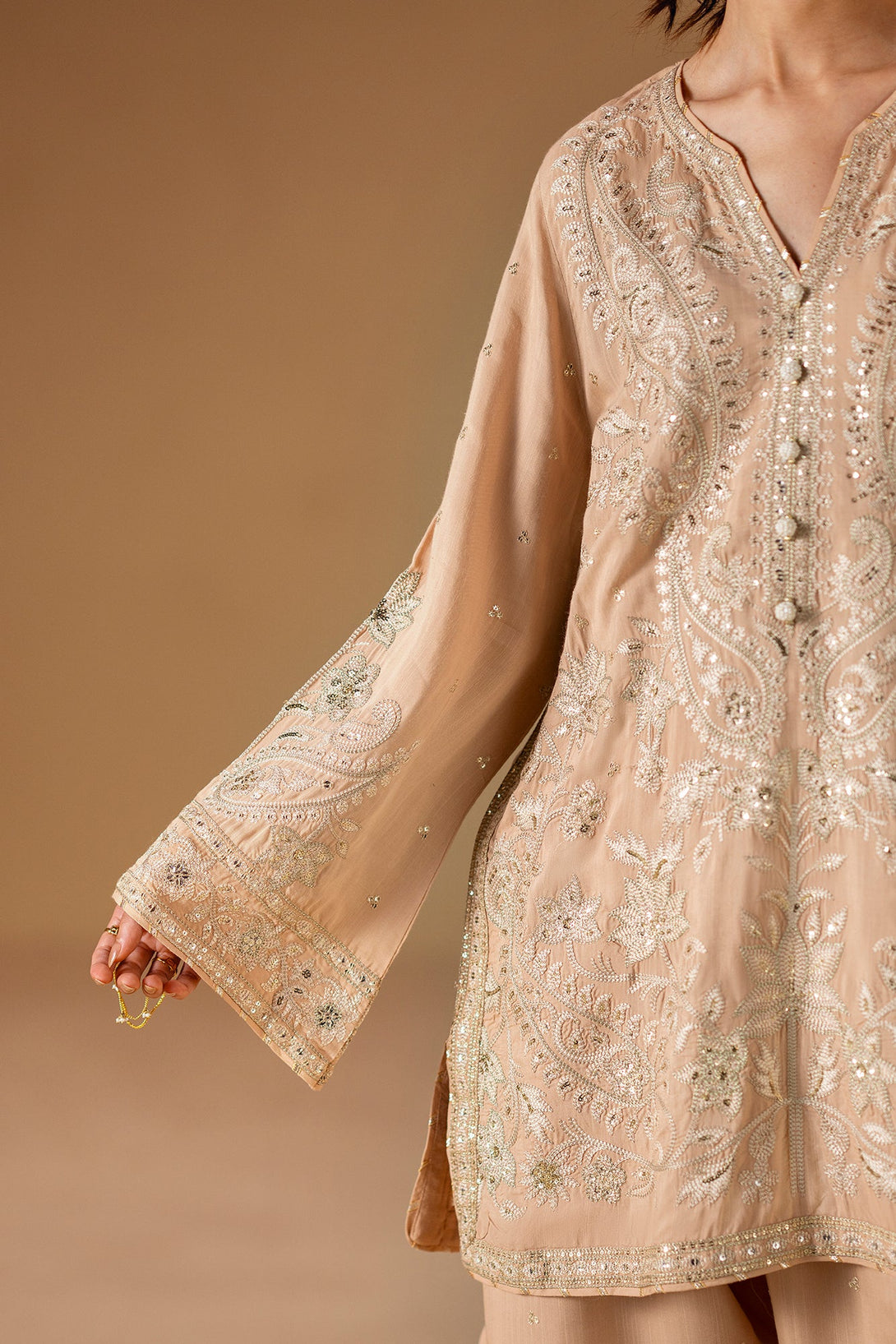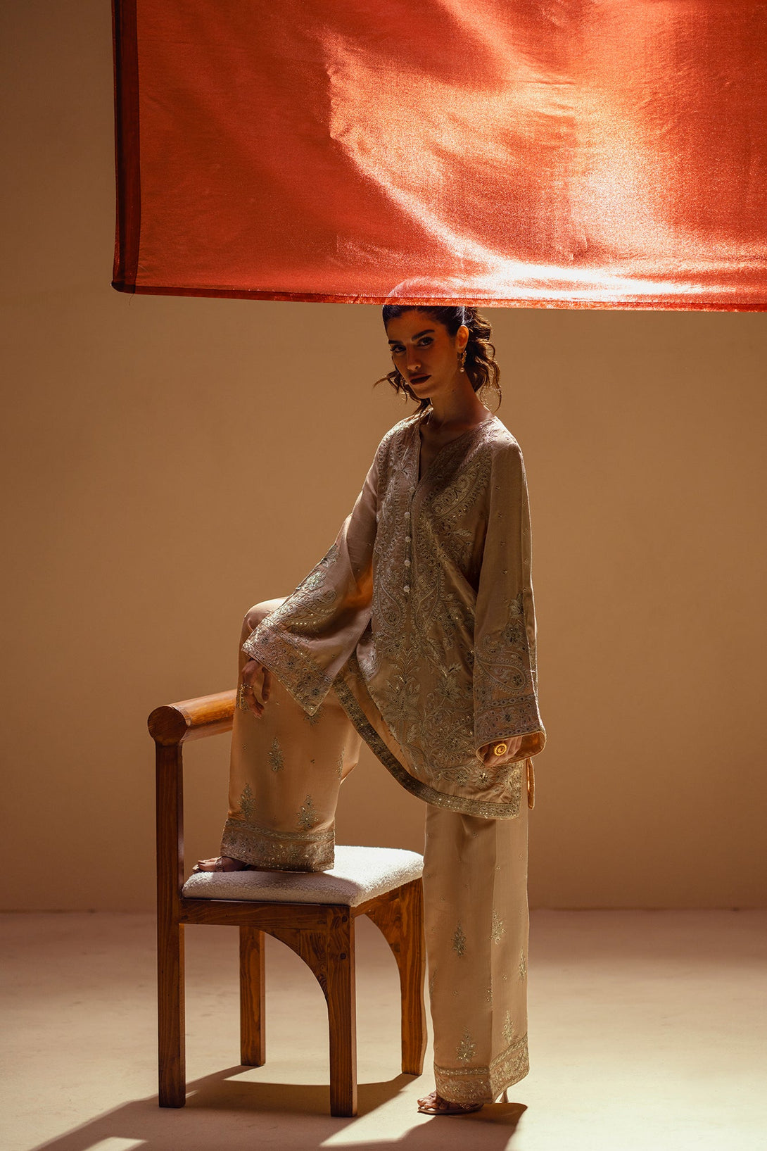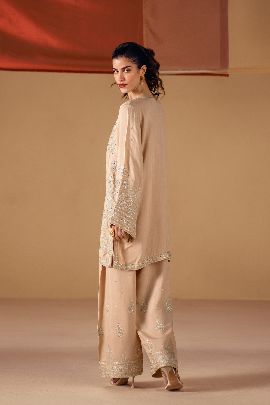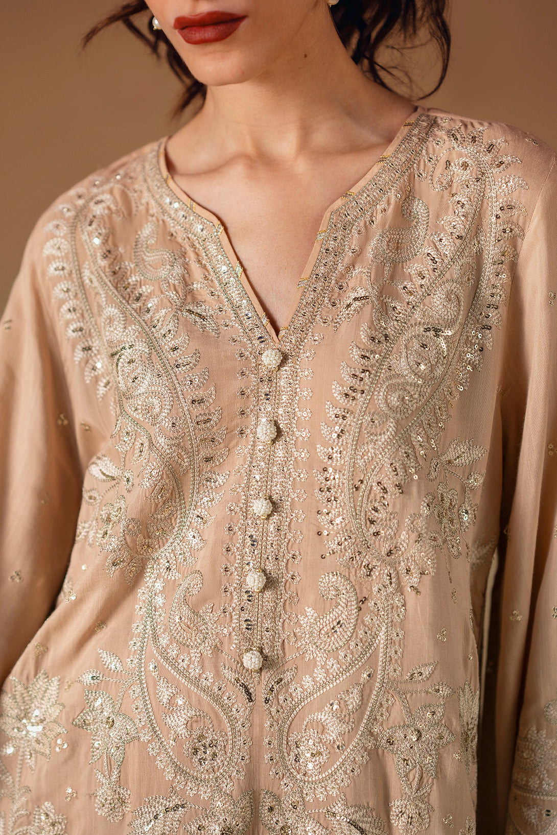 Embrace the elegance of golden artistry. This stunning suit features a light beige fabric that serves as a beautiful canvas for intricate silver and gold embroidery. The long, relaxed-fit shirt is adorned with delicate floral and ornamental patterns, while the wide-leg shalwar feature a matching embroidered border. This ensemble is a timeless choice, offering a perfect blend of modern comfort and artistic elegance.