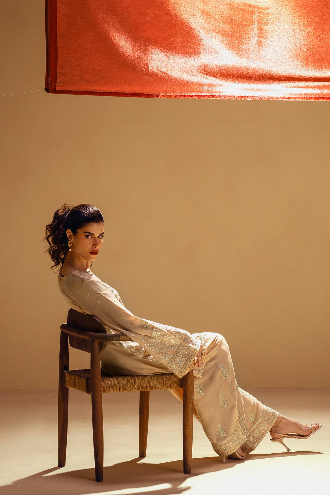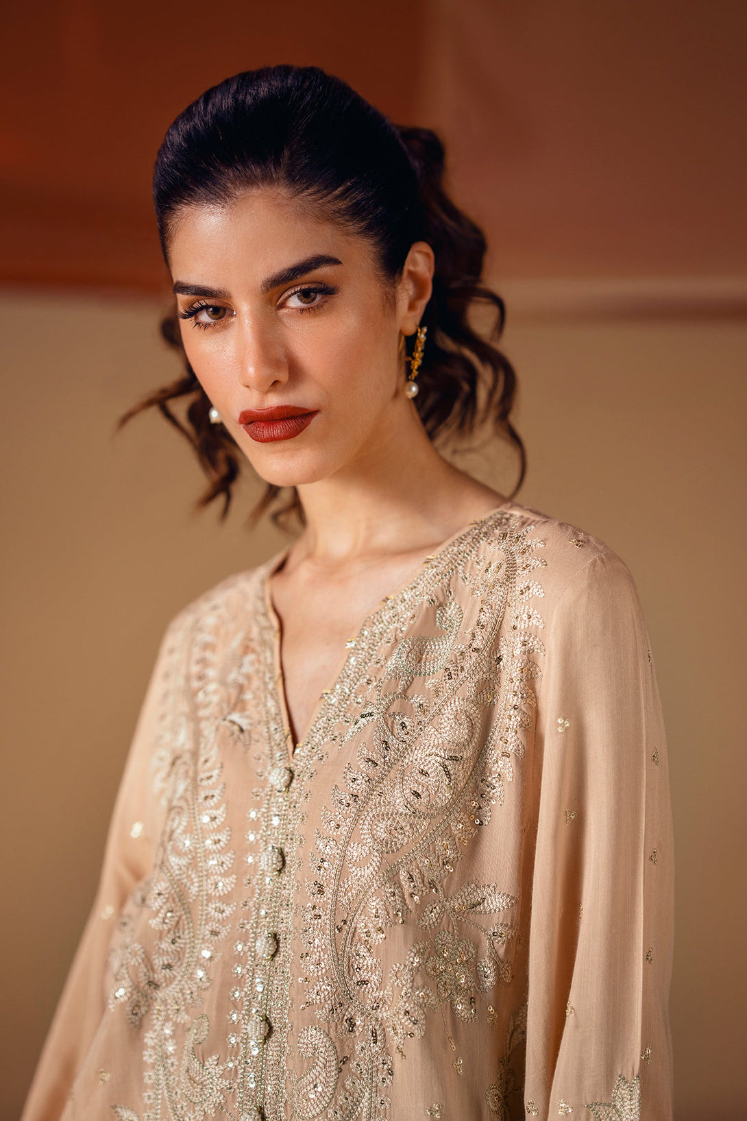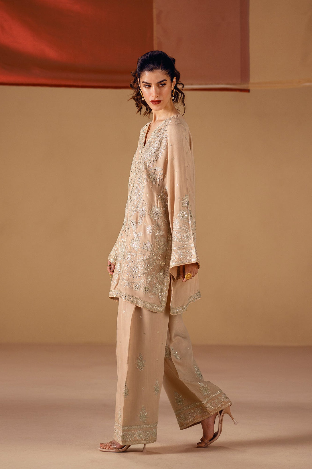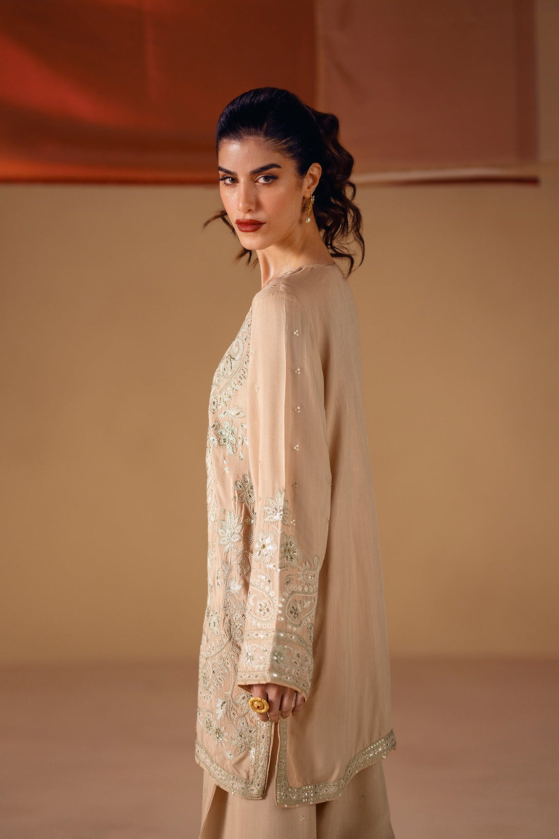 Embrace the elegance of golden artistry. This stunning suit features a light beige fabric that serves as a beautiful canvas for intricate silver and gold embroidery. The long, relaxed-fit shirt is adorned with delicate floral and ornamental patterns, while the wide-leg shalwar feature a matching embroidered border. This ensemble is a timeless choice, offering a perfect blend of modern comfort and artistic elegance.