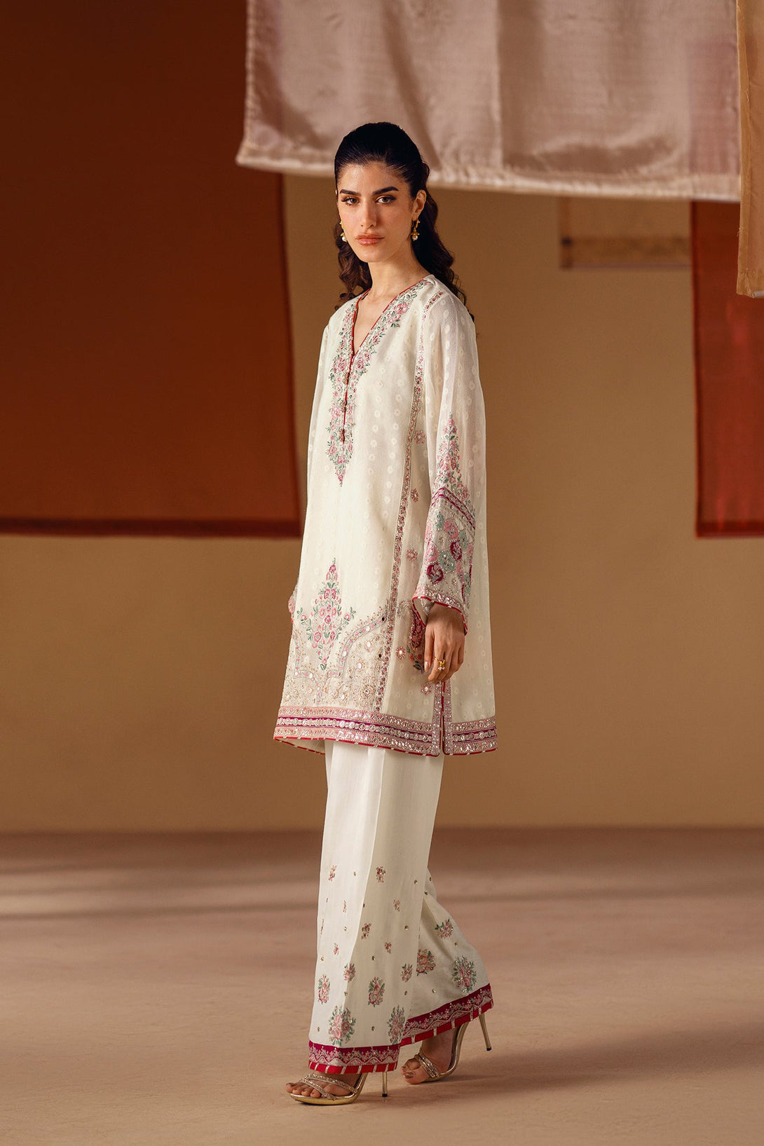 A masterpiece of sophisticated artistry. This stunning 3-piece suit includes an A- line shirt, a shalwar, and a separate inner slip. The shirt, in a soft cream hue, is beautifully adorned with intricate floral embroidery in vibrant shades of pink and green. The farshi shalwar features a matching embroidered border, creating a cohesive and elegant look. This ensemble is a celebration of rich color and captivating craftsmanship, perfect for making a memorable statement.