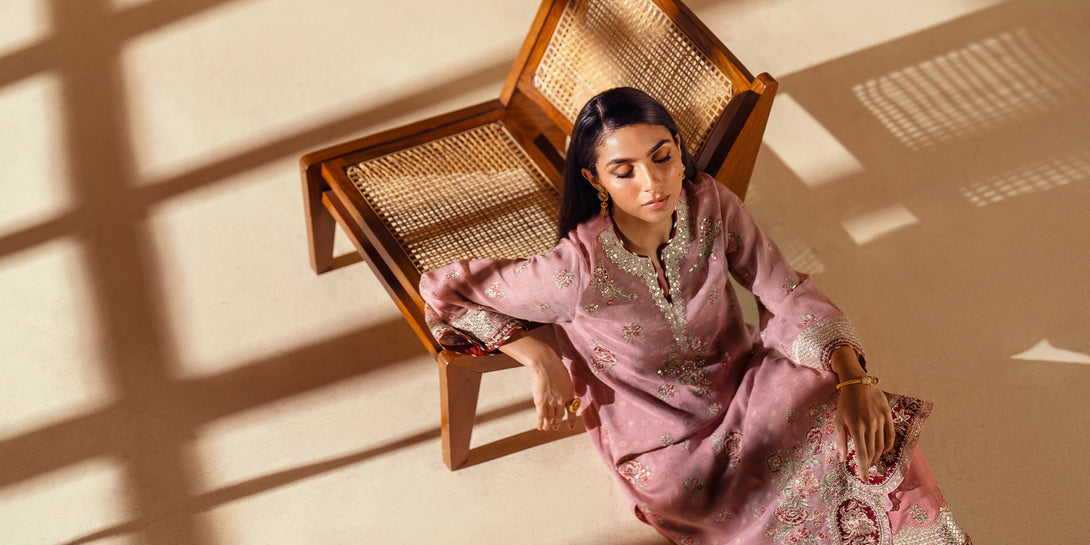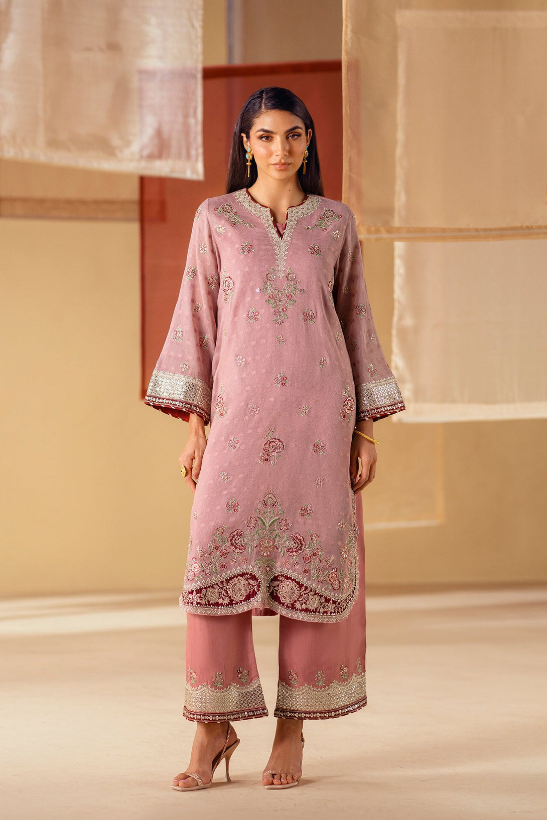 A vision of refined elegance and artistic charm. This beautiful 3-piece suit includes a long shirt, culotte fit trouser, and a separate inner slip. The shirt, in a soft hue, is beautifully adorned with intricate floral embroidery in silver and a deeper maroon. The trousers feature a matching embroidered border, creating a cohesive and sophisticated look. This ensemble is a celebration of graceful color and timeless artistry.