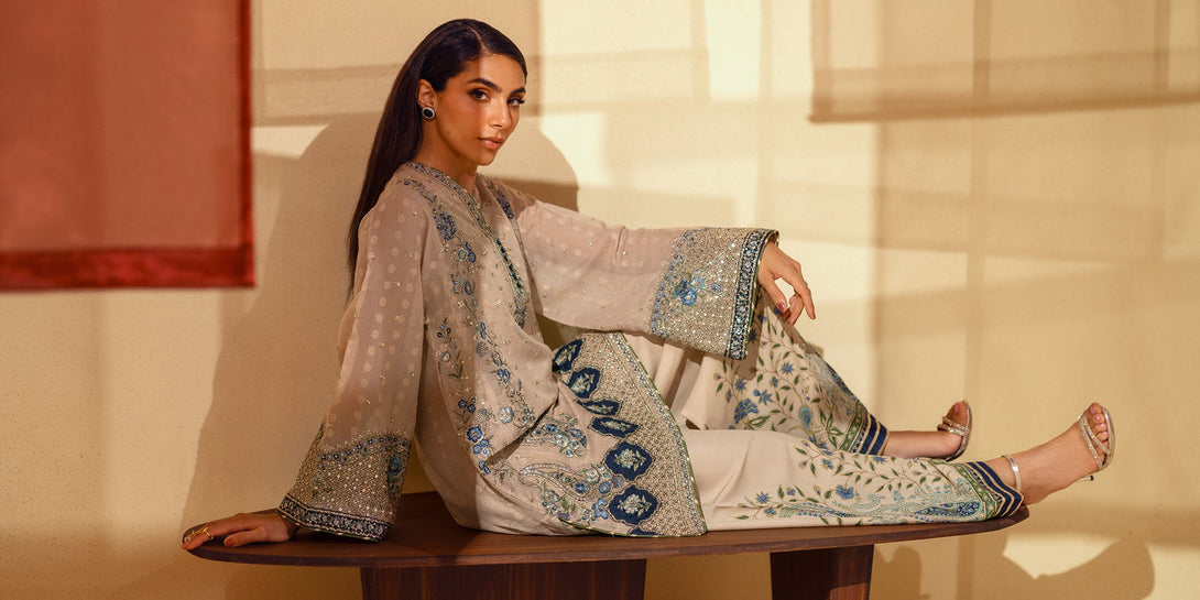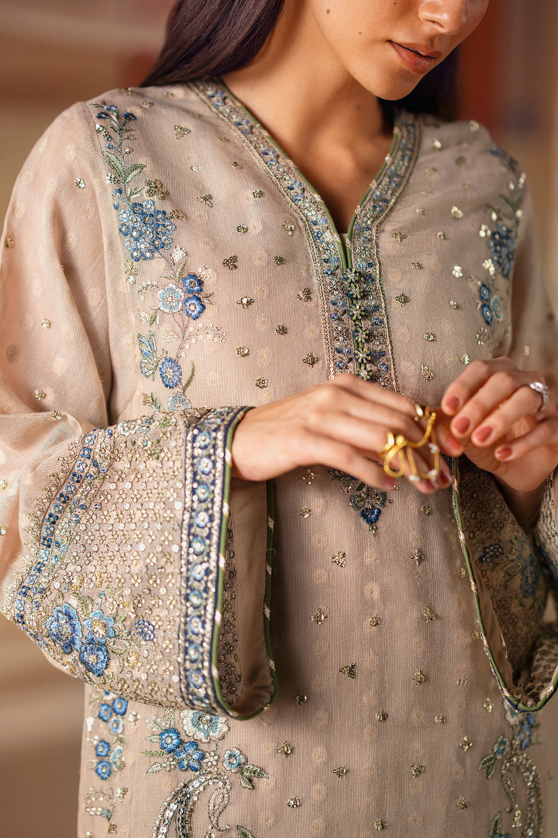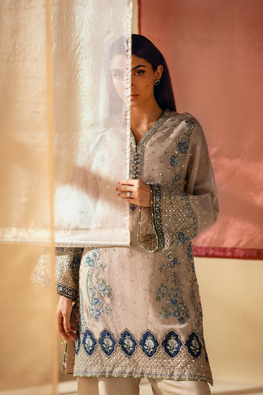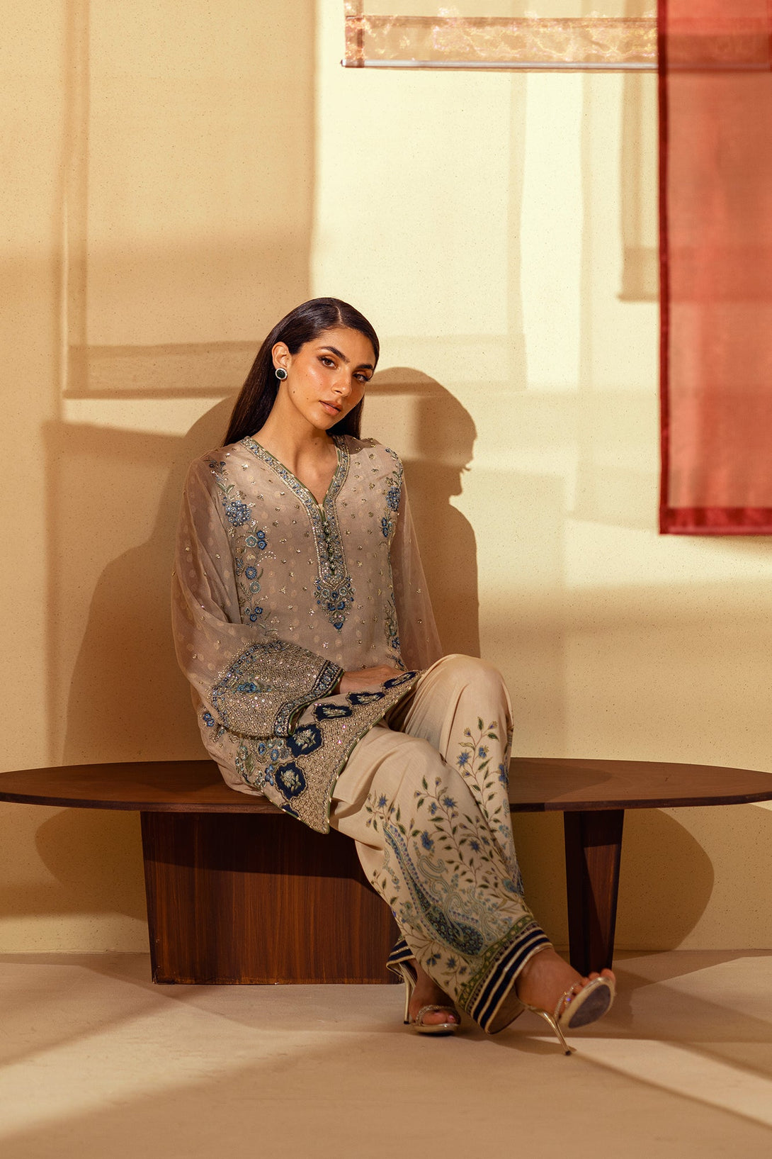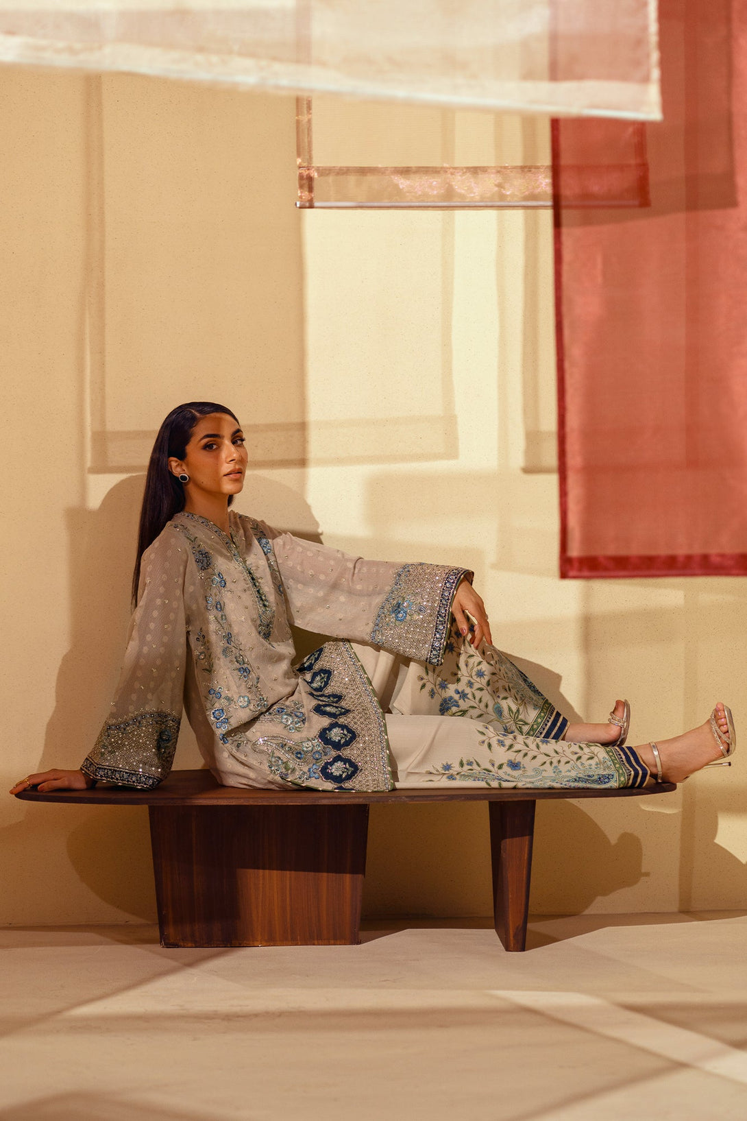 Experience the grandeur of traditional artistry. This elegant 3-piece suit includes a long shirt, a shalwar, and a separate inner slip. The shirt, in a beautiful beige hue, is adorned with intricate floral and ornamental embroidery in shades of light blue and silver. The shalwar features a matching embroidered border, creating a cohesive and sophisticated look. This ensemble is a celebration of graceful contrasts and timeless design, perfect for a grand occasion.