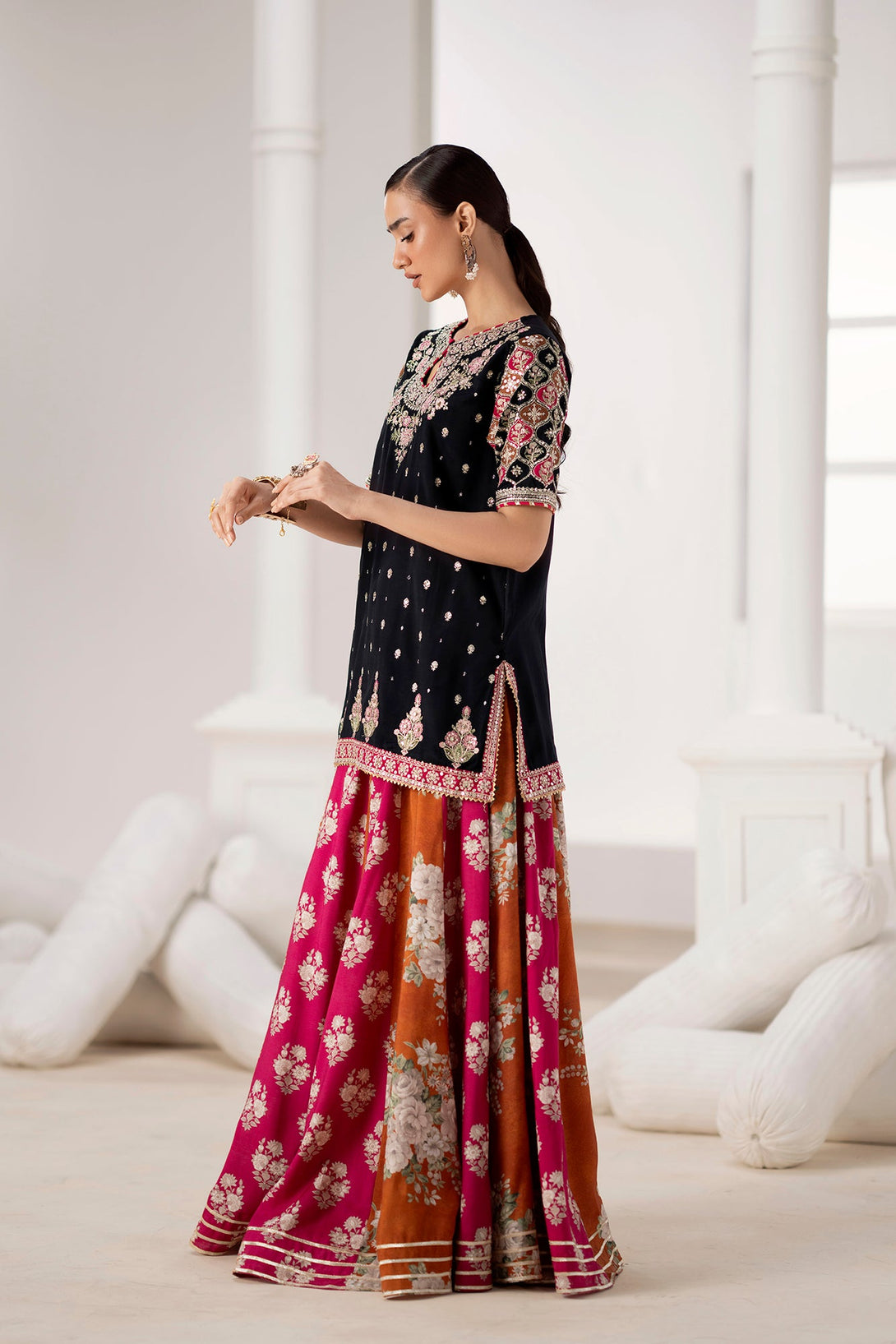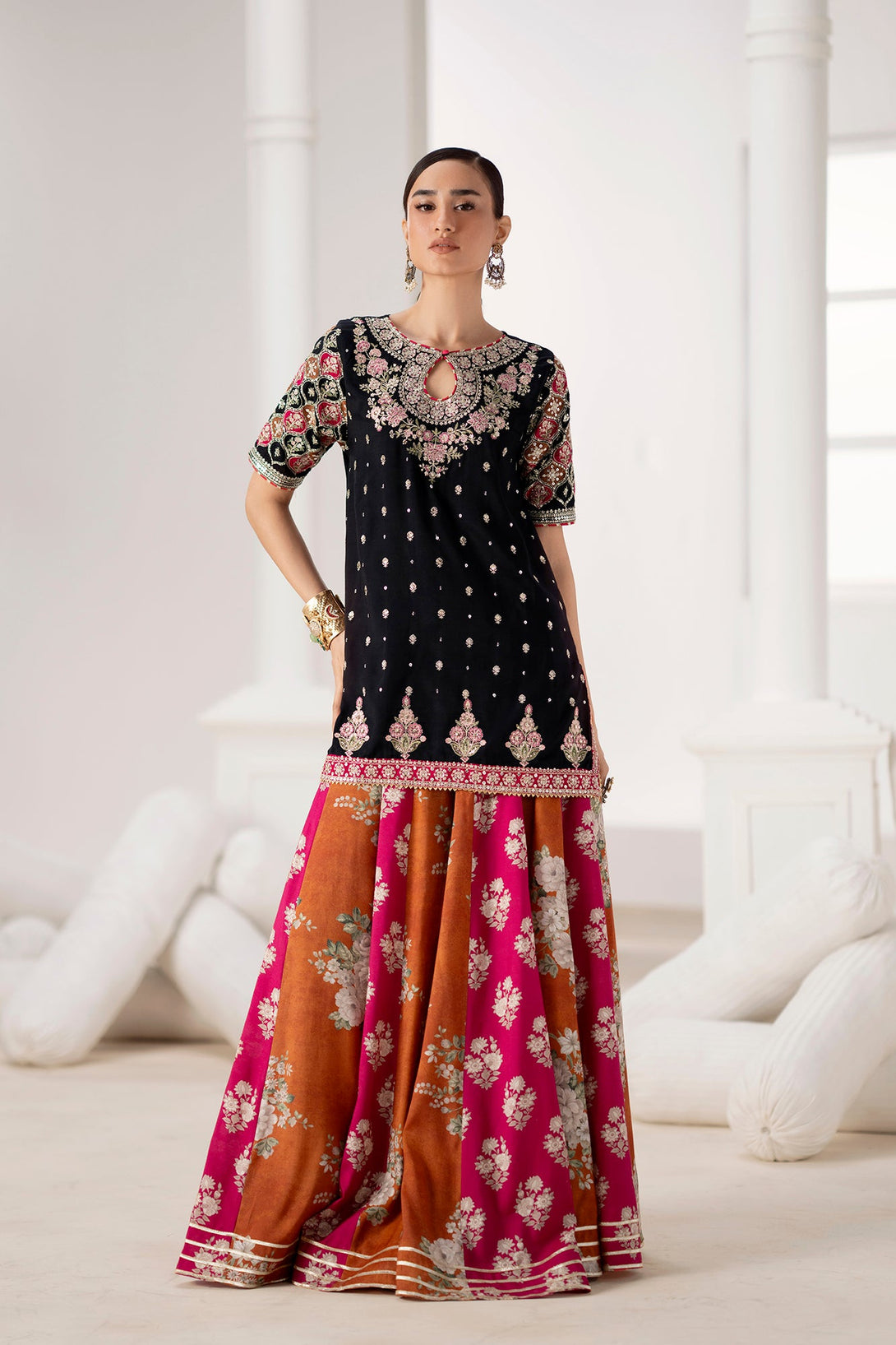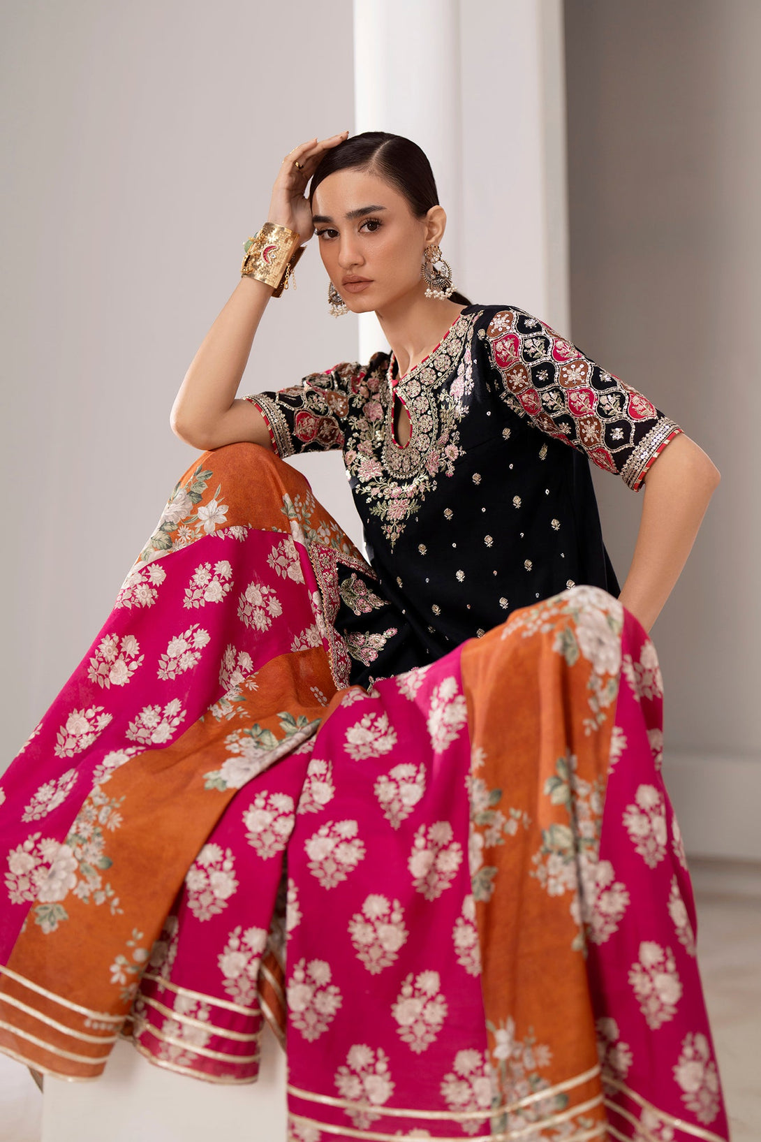 Command attention in this breathtaking embroidered suit, a vibrant fusion of traditional craftsmanship and modern design. The black shirt is a canvas for stunning floral embroidery in shades of fuchsia, green, and gold. A keyhole neckline and intricate beadwork add to its sophisticated charm. The ensemble is completed with a spectacular two-toned sharara, featuring a striking color-blocked pattern in warm orange and bright fuchsia. Both sections of the sharara are adorned with elegant floral prints and gotta work along the hem, creating a beautiful and dramatic silhouette. This suit is the perfect choice for a grand celebration, blending bold colors with refined detail.