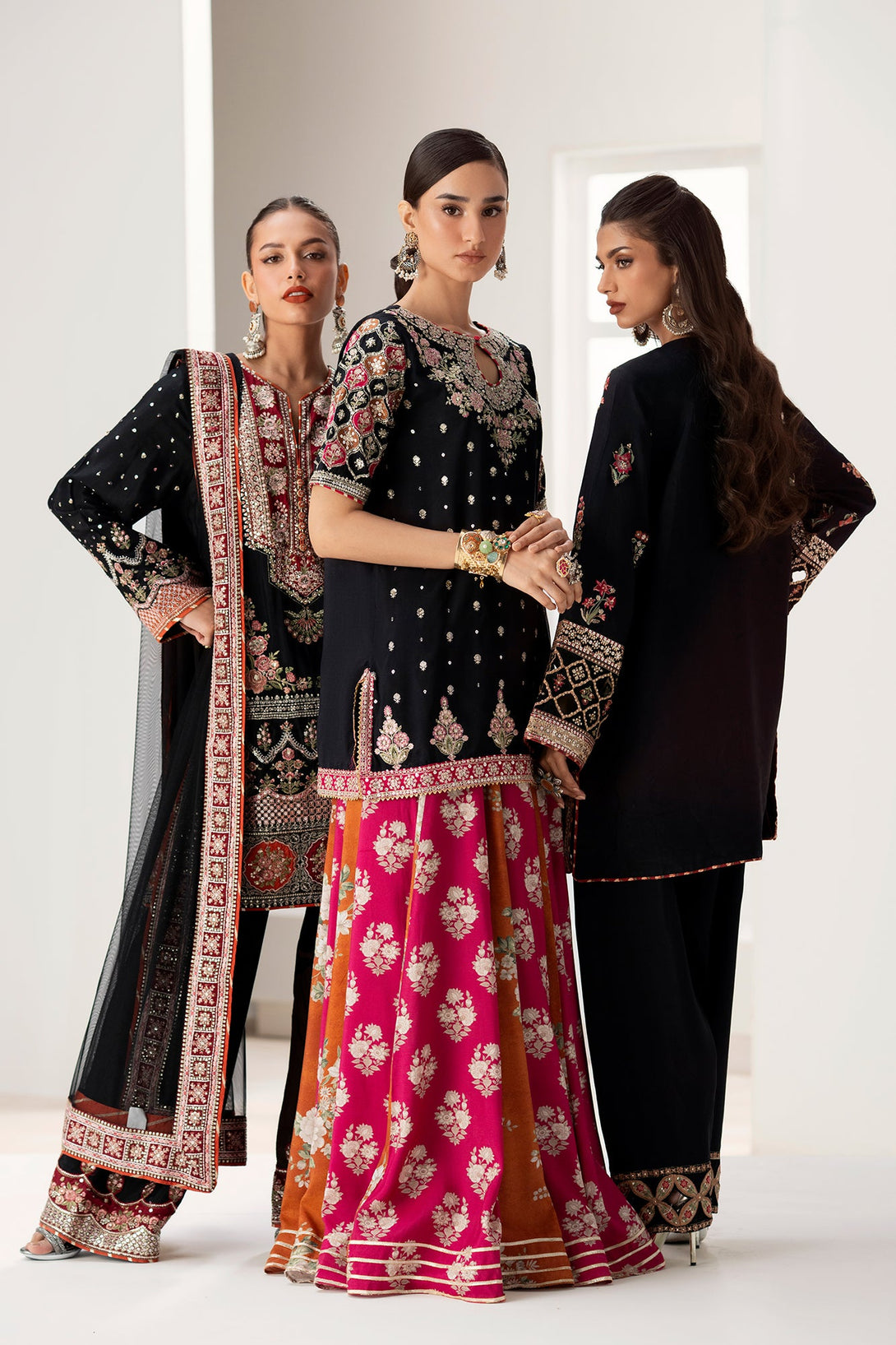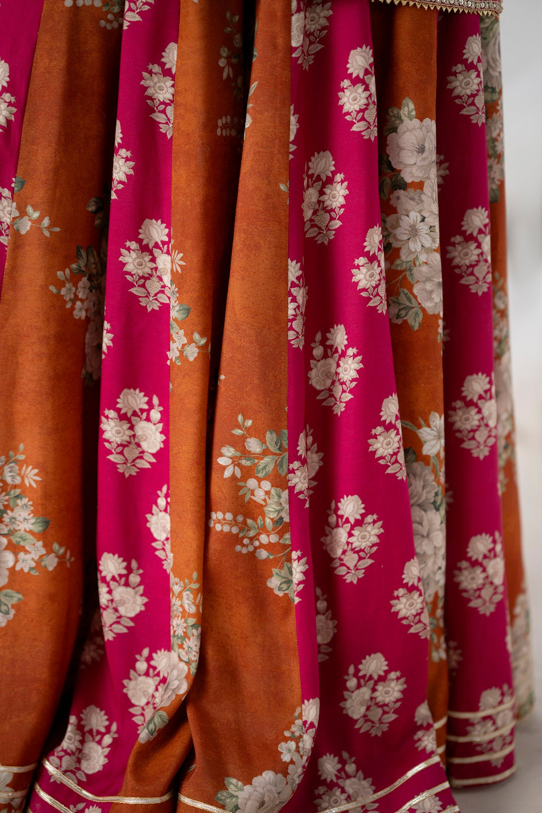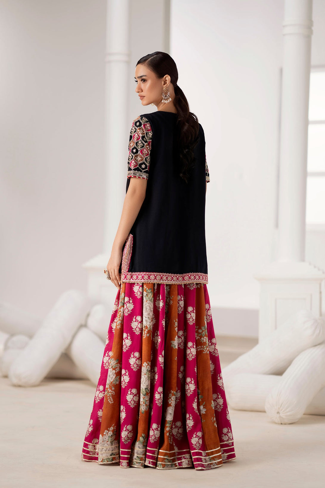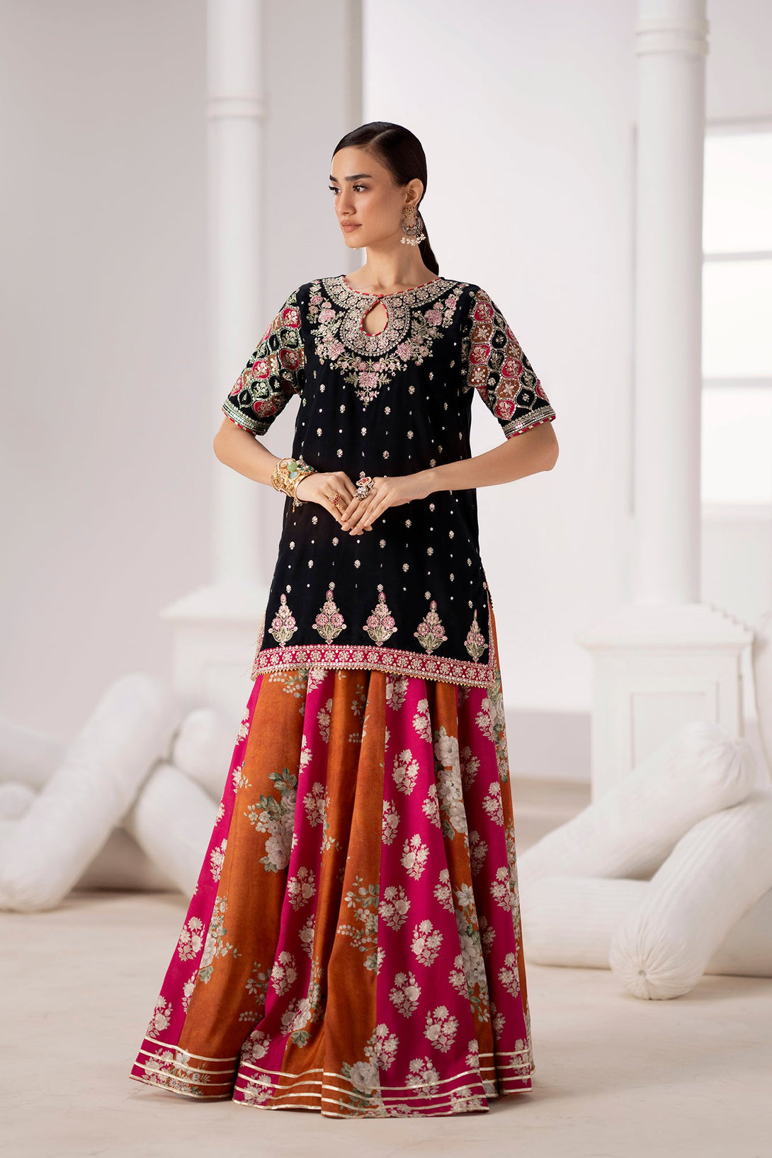 Command attention in this breathtaking embroidered suit, a vibrant fusion of traditional craftsmanship and modern design. The black shirt is a canvas for stunning floral embroidery in shades of fuchsia, green, and gold. A keyhole neckline and intricate beadwork add to its sophisticated charm. The ensemble is completed with a spectacular two-toned sharara, featuring a striking color-blocked pattern in warm orange and bright fuchsia. Both sections of the sharara are adorned with elegant floral prints and gotta work along the hem, creating a beautiful and dramatic silhouette. This suit is the perfect choice for a grand celebration, blending bold colors with refined detail.