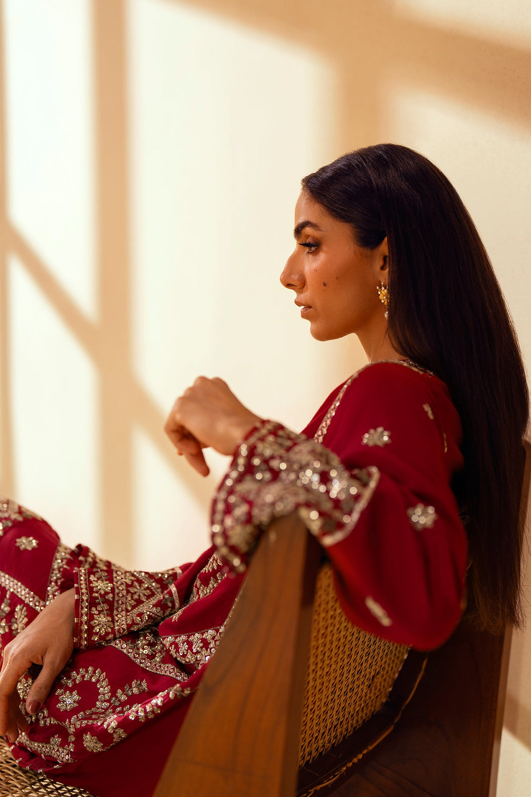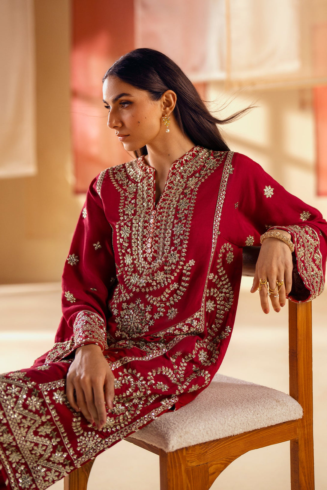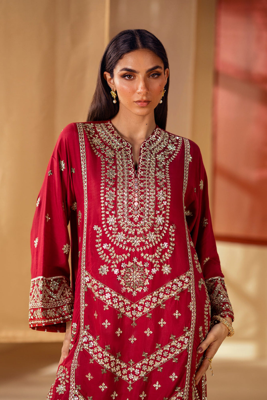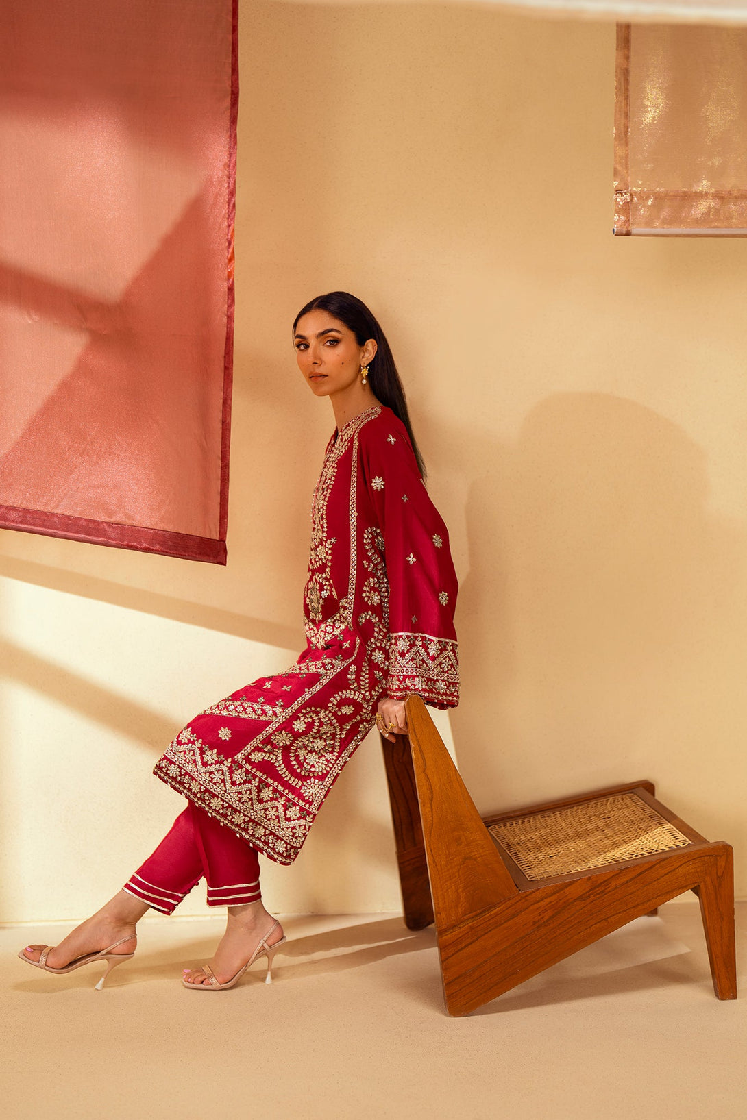 Drenched in a deep, captivating hue, this stunning embroidered suit is a vision of regal sophistication. The rich maroon fabric serves as a beautiful canvas for intricate silver and gold embroidery that adorns the front of the shirt and the borders of the sleeves. The tapered-fit shalwar feature a matching border with button addons, creating a cohesive and elegant look. This ensemble is a celebration of luxurious color and timeless artistry, perfect for making a grand statement.