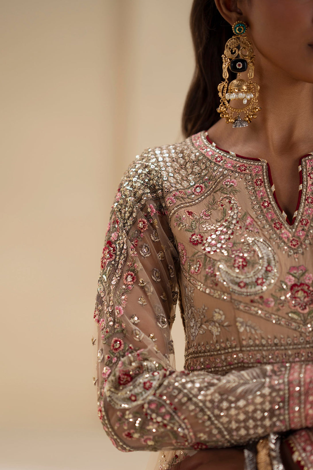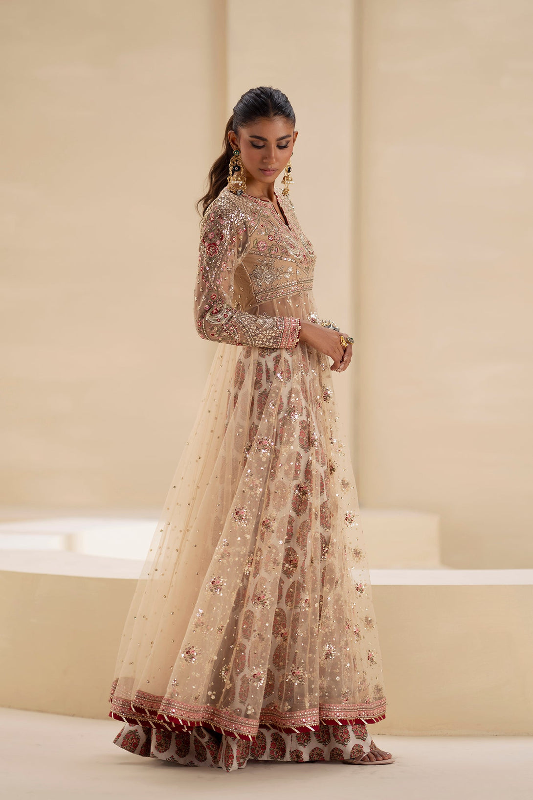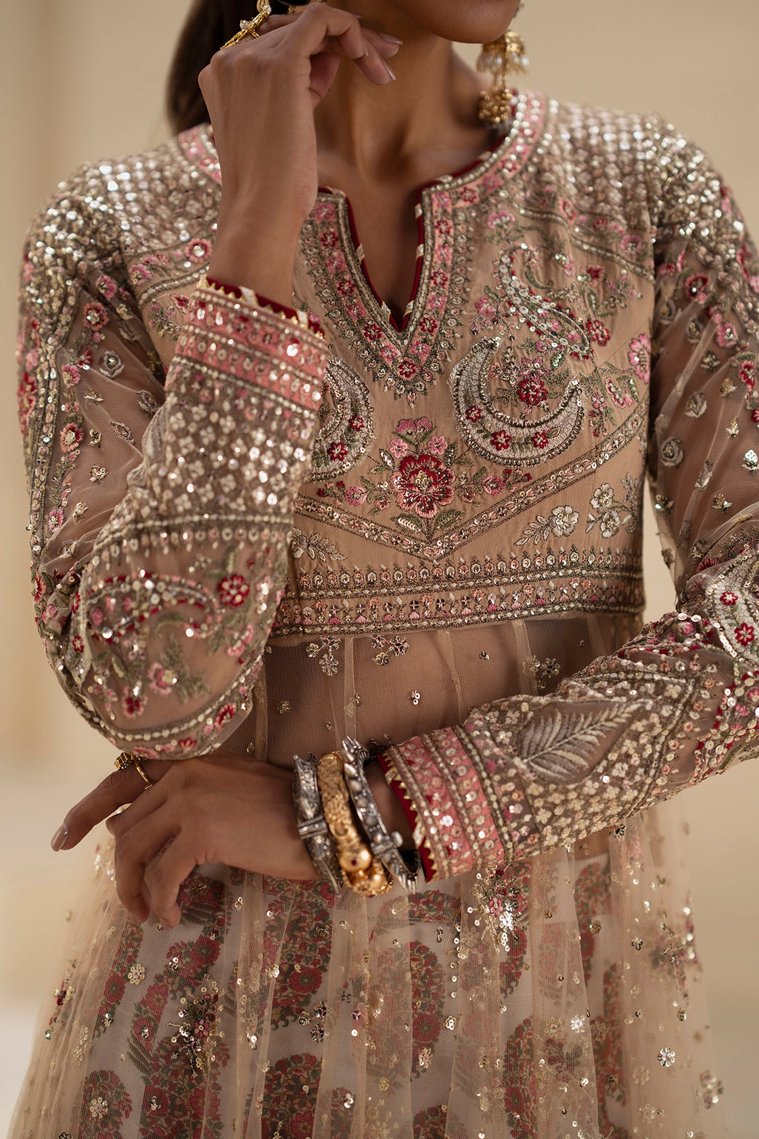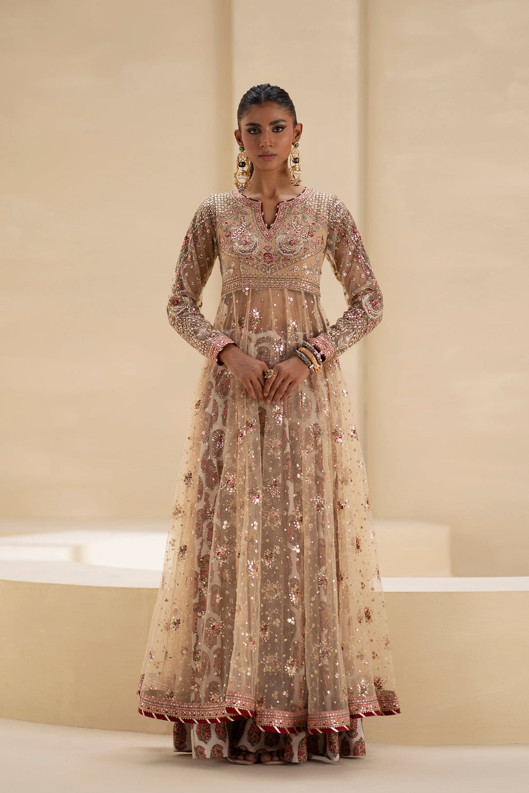 Step into the spotlight with this ethereal gold Dazzle in ethereal beauty with this show-stopping beige embroidered set, featuring a long shirt and a coordinated skirt. The sheer, long-sleeved shirt is crafted from a light net or chiffon in a soft beige hue. It is utterly submerged in luxurious embellishments, including dense sequins, threadwork, and beading in gold, silver, and soft pink. The bodice is intricately worked, transitioning into a full, flowing skirt that is covered in scattered motifs and glittering detail. This opulent piece is layered over a skirt that features a white and pink print visible beneath the sheer overlay. This majestic ensemble is a perfect centerpiece for a grand wedding or high-end formal event.