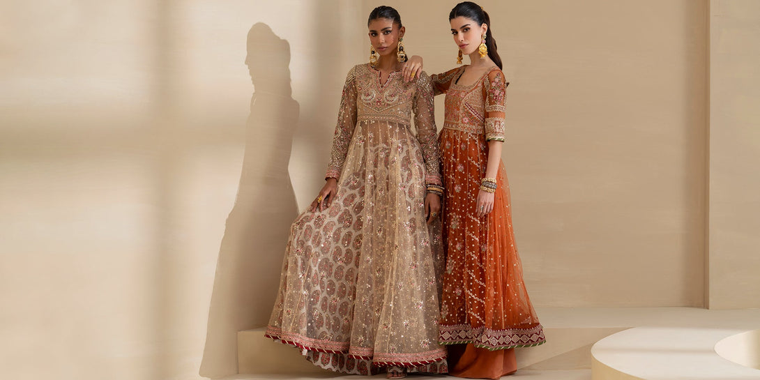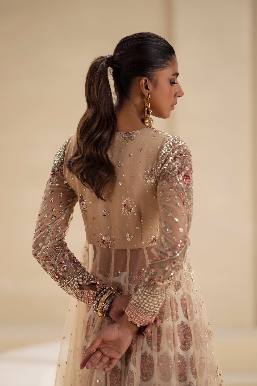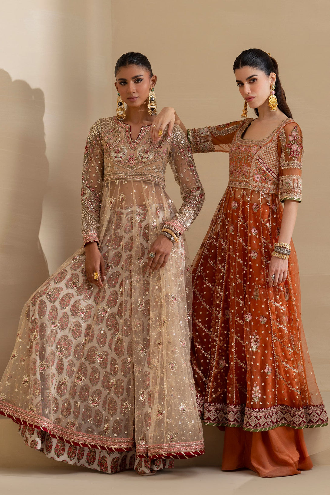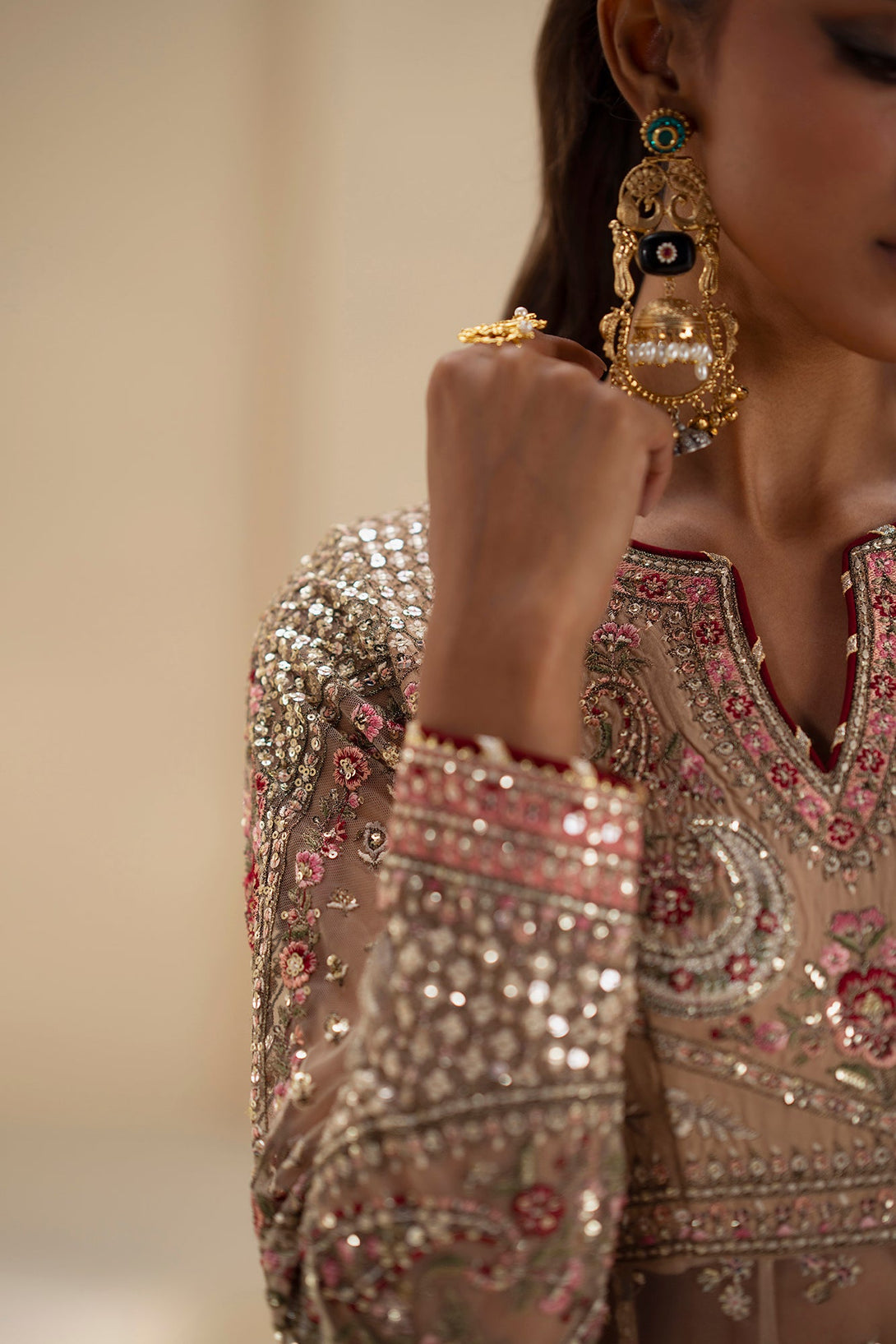 Step into the spotlight with this ethereal gold Dazzle in ethereal beauty with this show-stopping beige embroidered set, featuring a long shirt and a coordinated skirt. The sheer, long-sleeved shirt is crafted from a light net or chiffon in a soft beige hue. It is utterly submerged in luxurious embellishments, including dense sequins, threadwork, and beading in gold, silver, and soft pink. The bodice is intricately worked, transitioning into a full, flowing skirt that is covered in scattered motifs and glittering detail. This opulent piece is layered over a skirt that features a white and pink print visible beneath the sheer overlay. This majestic ensemble is a perfect centerpiece for a grand wedding or high-end formal event.