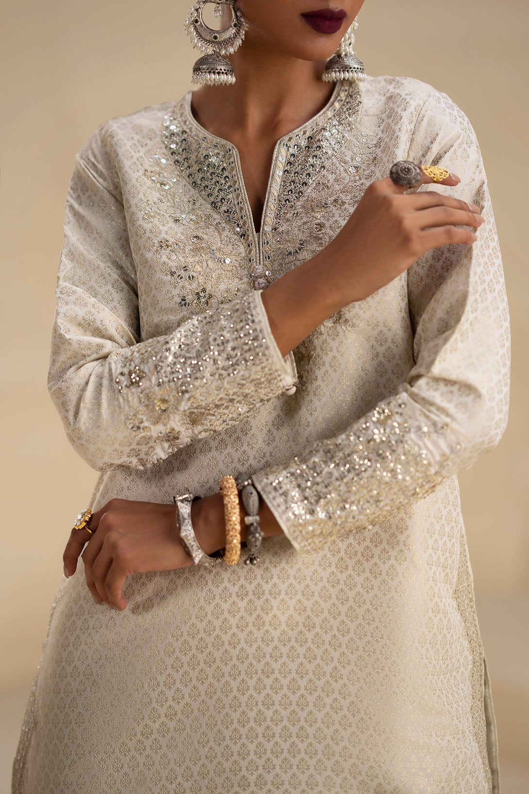 Illuminate the evening in this exquisitely detailed ivory embroidered suit, featuring a short shirt and a magnificent gharara. The straight-cut shirt is crafted from a luxurious off-white fabric with a subtle tonal woven pattern and features a deeply flattering V-neckline. The bodice and full sleeves are richly embellished with intricate gold and silver embroidery and sequin-work, giving it a luminous, festive appeal. The ensemble is completed by a voluminous gharara in a coordinating cream beige hue. The lower tier of the gharara is adorned with delicate, ornate gold thread embroidery and sequin work, creating a majestic, flared silhouette that is ideal for formal weddings or celebratory occasions.