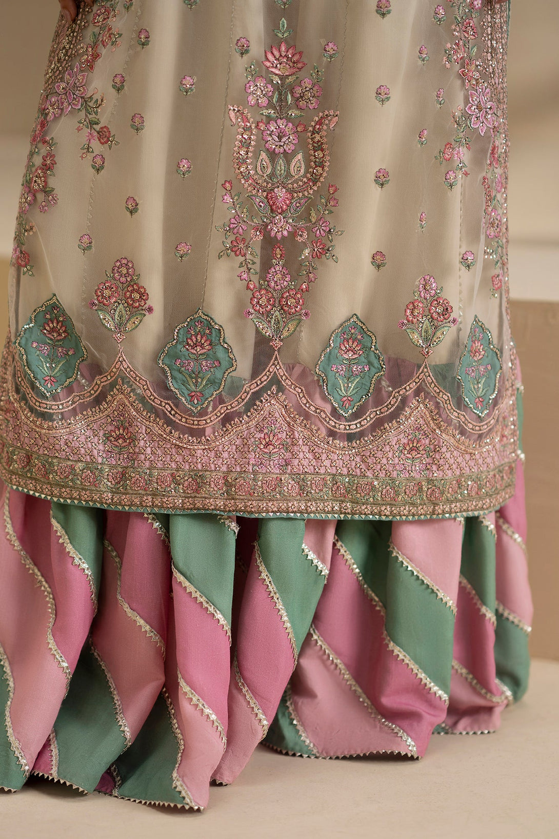 Channel ethereal majesty in this stunning ivory embroidered suit. The ensemble features a long, flowing shirt crafted from sheer net fabric, which is lavishly embellished with intricate pink, gold, and turquoise threadwork and bead detailing across the yoke and full sleeves. The detailed embroidery continues down the length of the shirt in ornate floral and paisley borders. Layered beneath is a slip and a magnificent flared gharara with striking horizontal stripes in complementary shades of pink and green, creating a voluminous and contemporary silhouette. This suit is a regal and unique choice for high-end formal or wedding events.