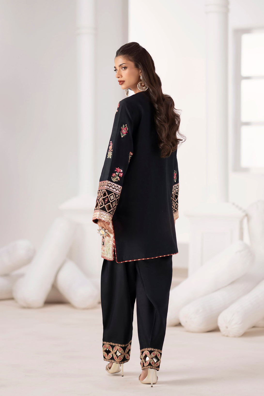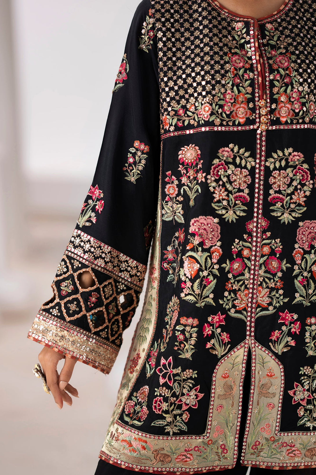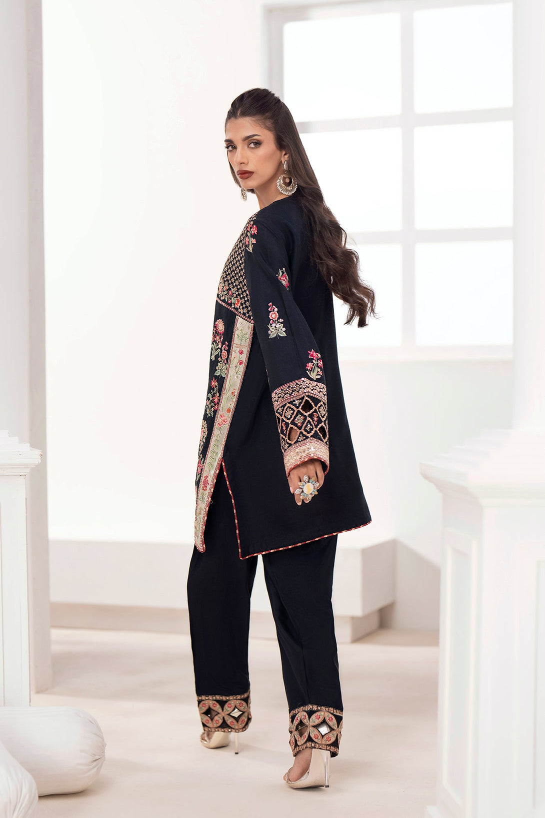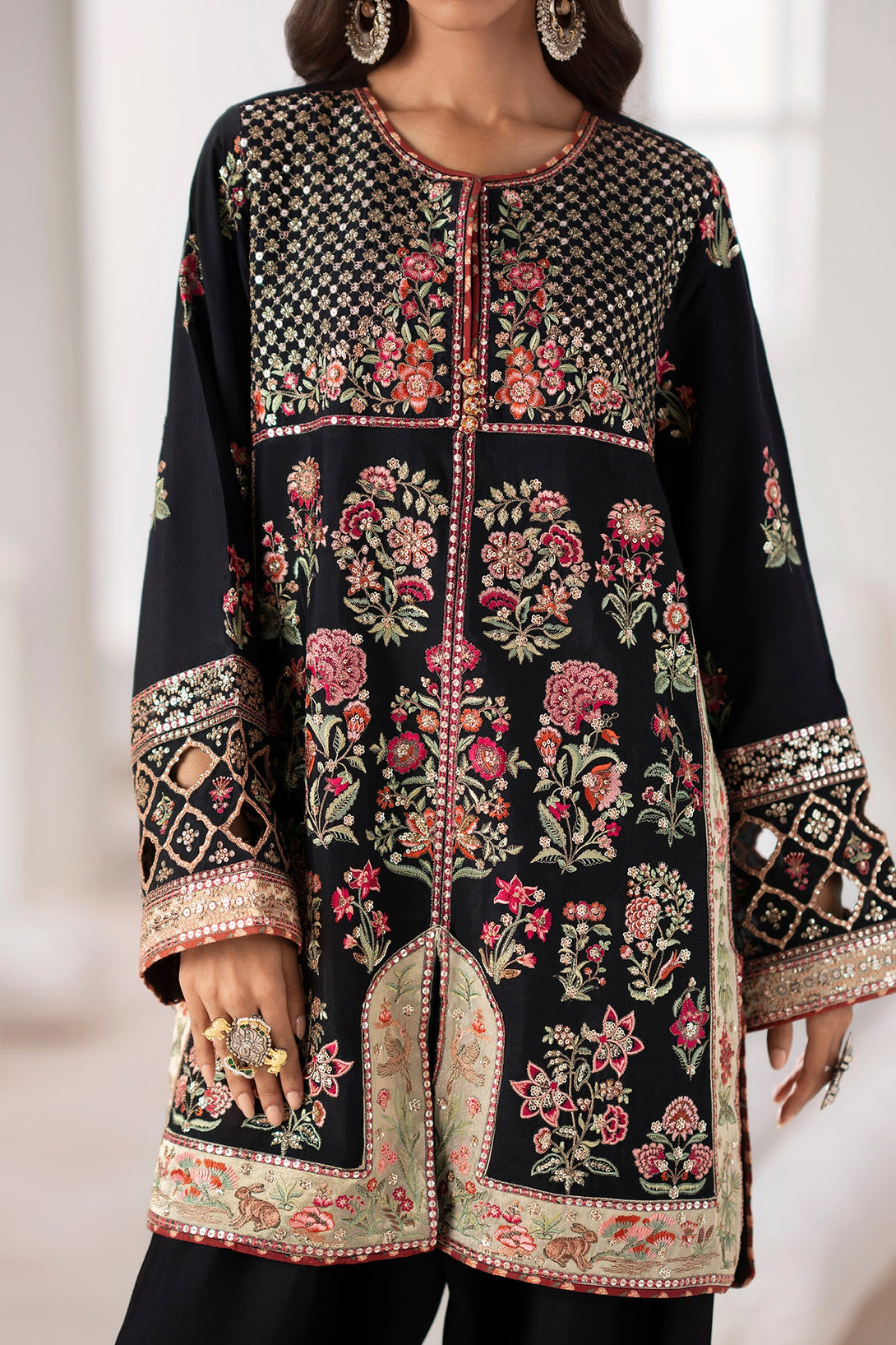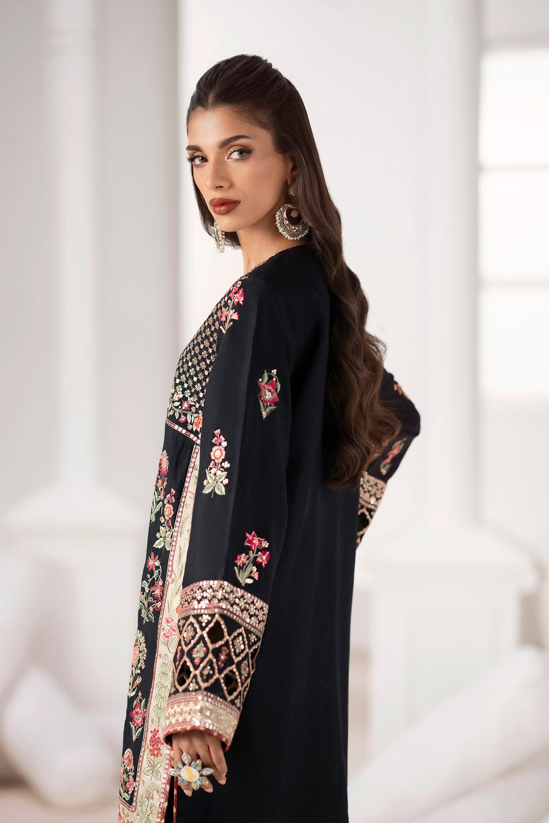 Step into timeless elegance with this captivating embroidered suit. The rich black fabric is a striking backdrop for the intricate embroidery in vibrant shades of pink, gold, and green. Delicate floral and vine motifs gracefully cover the shirt, while a heavily embellished neckline and broad cuffs add a touch of regal charm. The set is completed with matching black shalwar, creating a sophisticated and cohesive silhouette. This suit is the perfect choice for a grand celebration, ensuring a look that is both luxurious and unforgettable.
