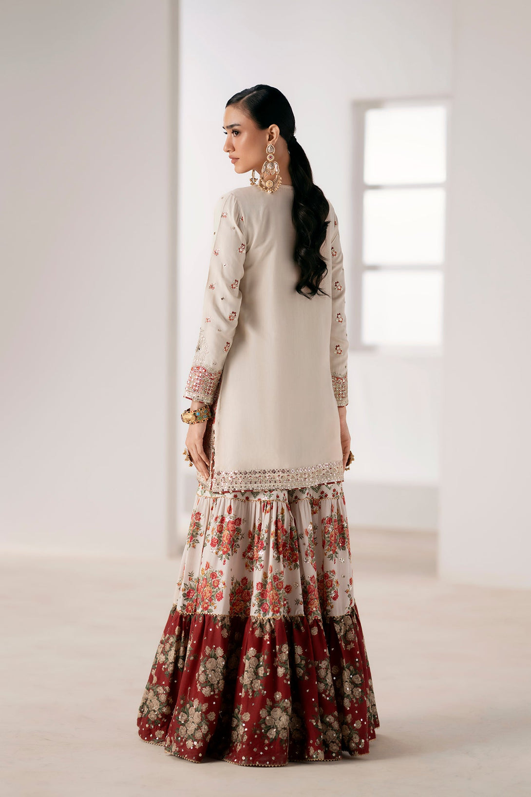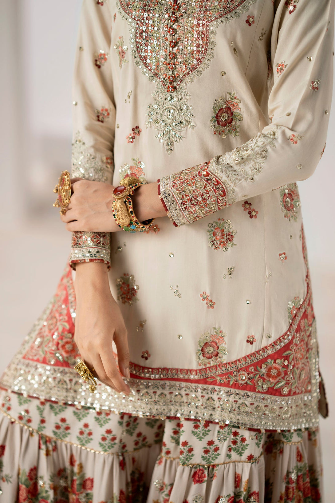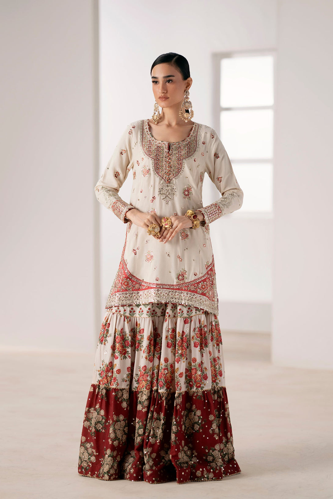 Immerse yourself in festive elegance with this stunning embroidered suit. The off-white shirt is a masterpiece of design, with a richly embellished bodice featuring intricate floral and traditional motifs in shimmering gold, pink, and red embroidery. A round-neckline with a delicate accents adds to its refined charm. The ensemble is completed with a full, flowing pleated gharara. The upper tier features a beautiful floral pattern in soft reds and greens against an off-white background, while the lower tier has a solid deep maroon hue. This suit is the perfect choice for a grand celebration, ensuring a look that is both timeless and unforgettable.