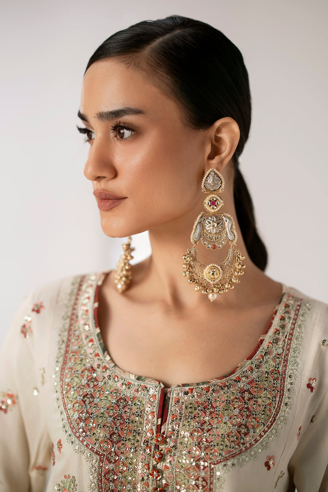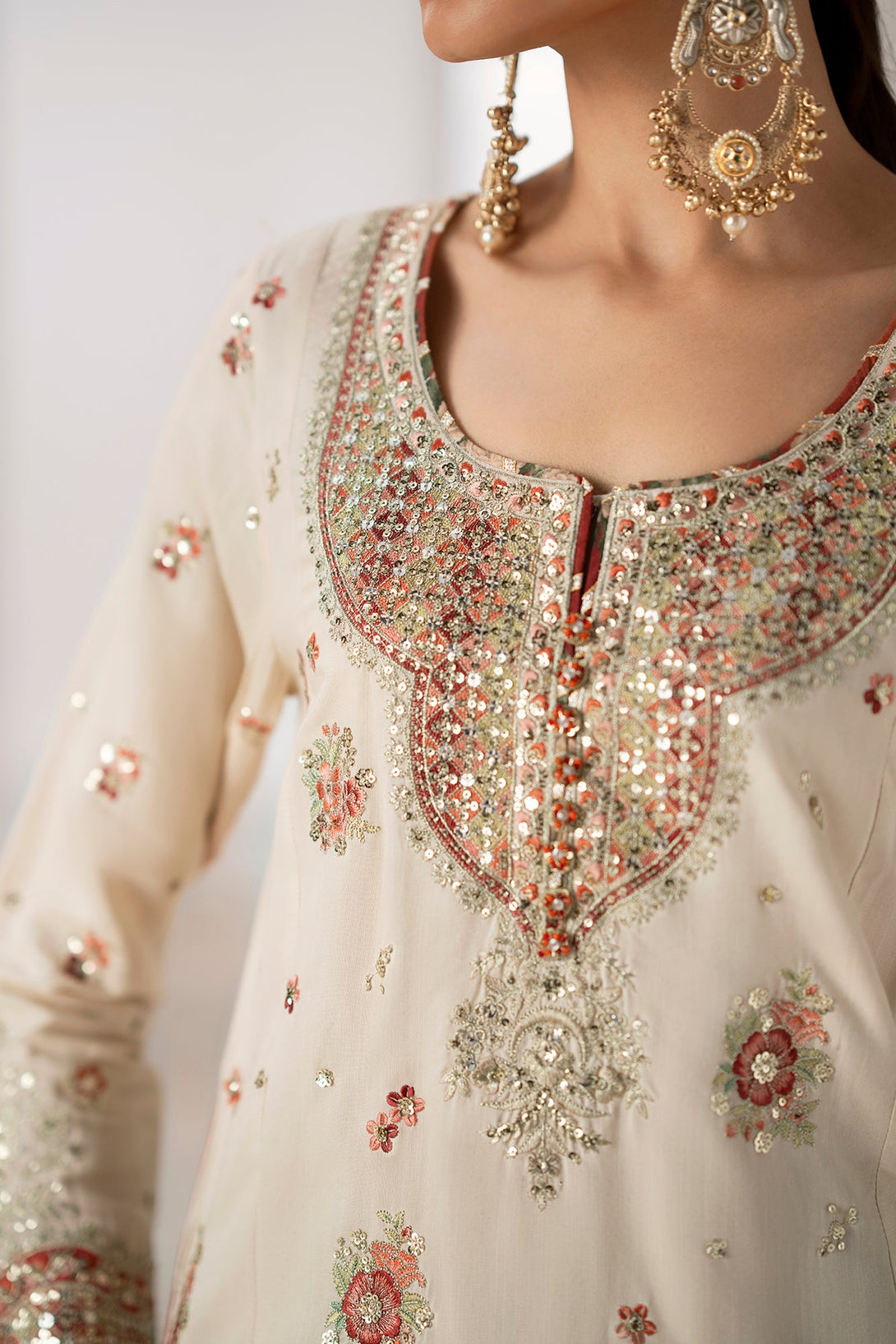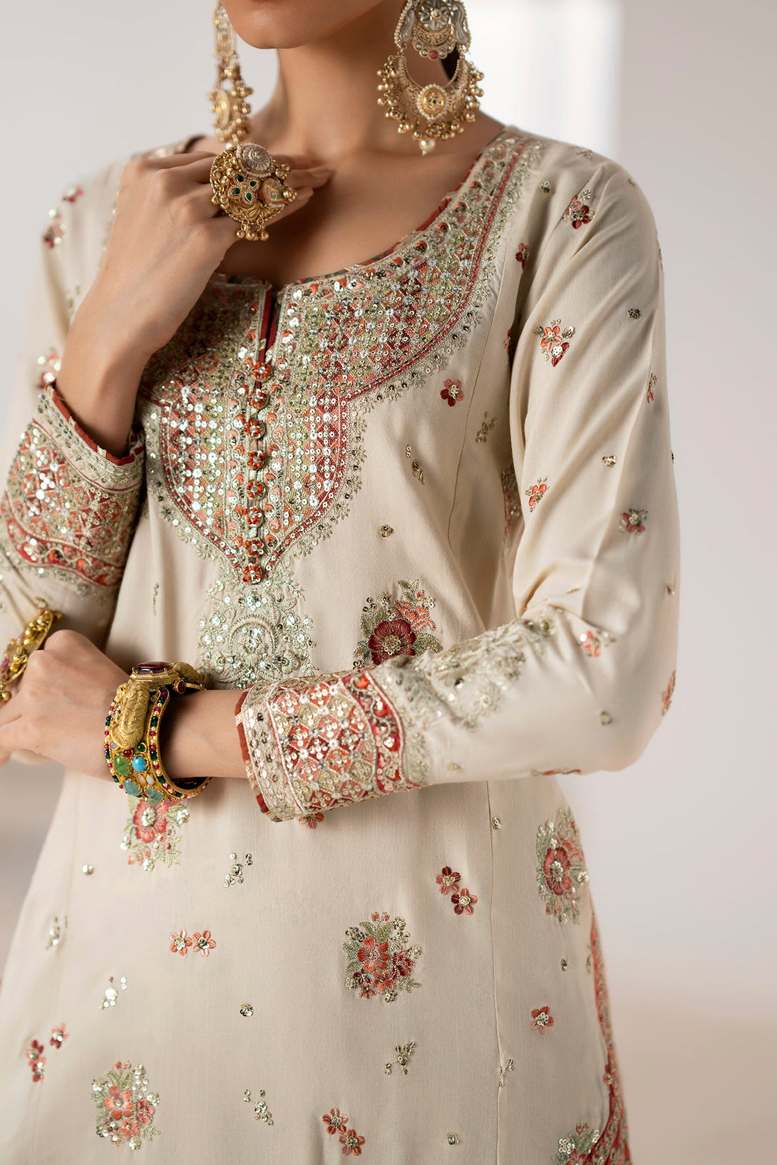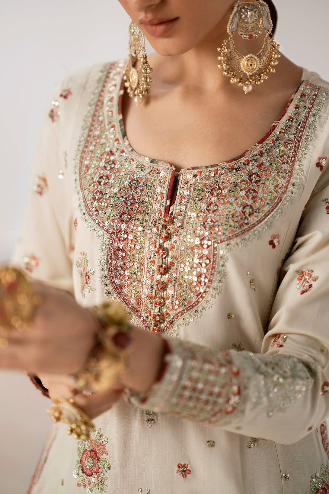 Immerse yourself in festive elegance with this stunning embroidered suit. The off-white shirt is a masterpiece of design, with a richly embellished bodice featuring intricate floral and traditional motifs in shimmering gold, pink, and red embroidery. A round-neckline with a delicate accents adds to its refined charm. The ensemble is completed with a full, flowing pleated gharara. The upper tier features a beautiful floral pattern in soft reds and greens against an off-white background, while the lower tier has a solid deep maroon hue. This suit is the perfect choice for a grand celebration, ensuring a look that is both timeless and unforgettable.