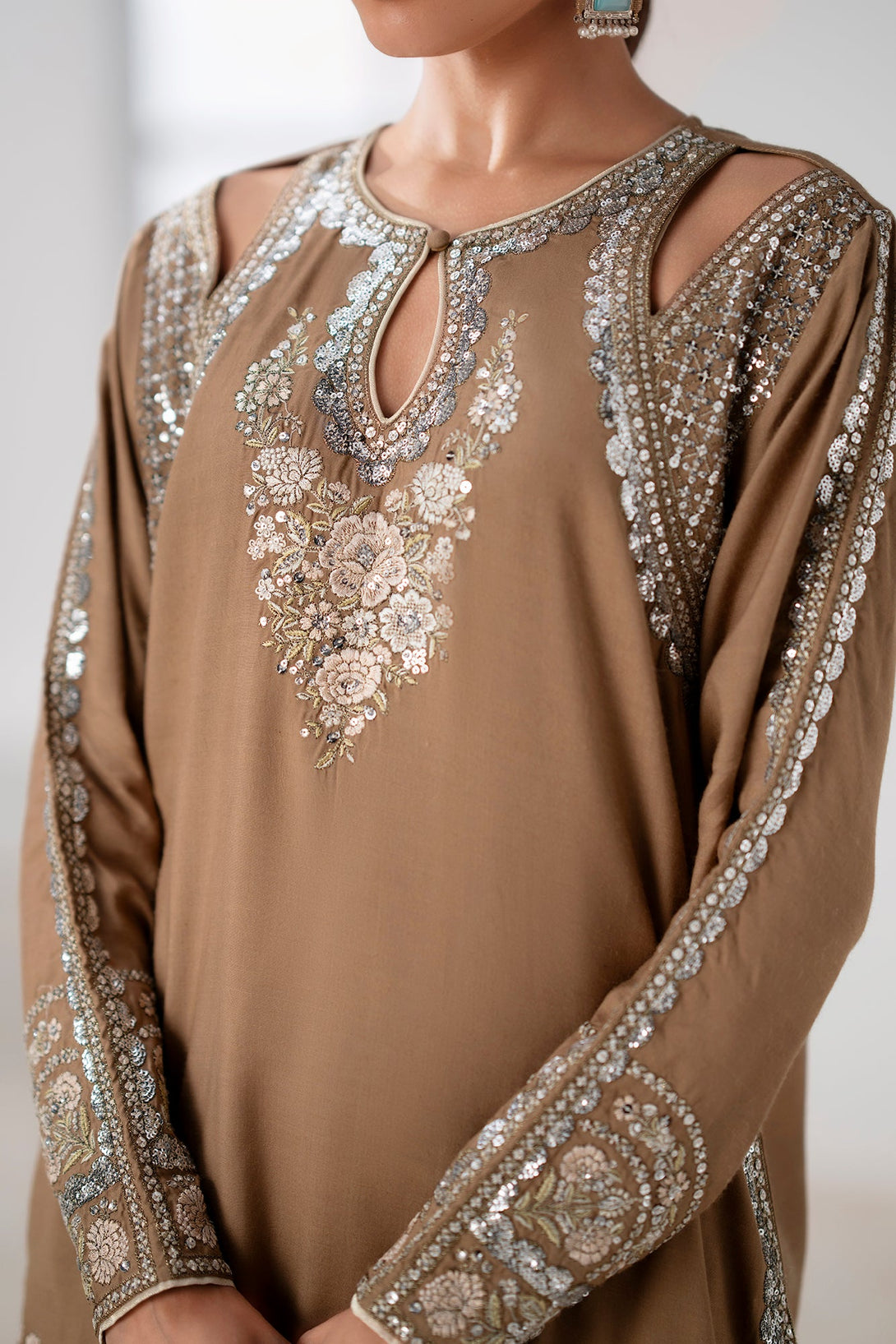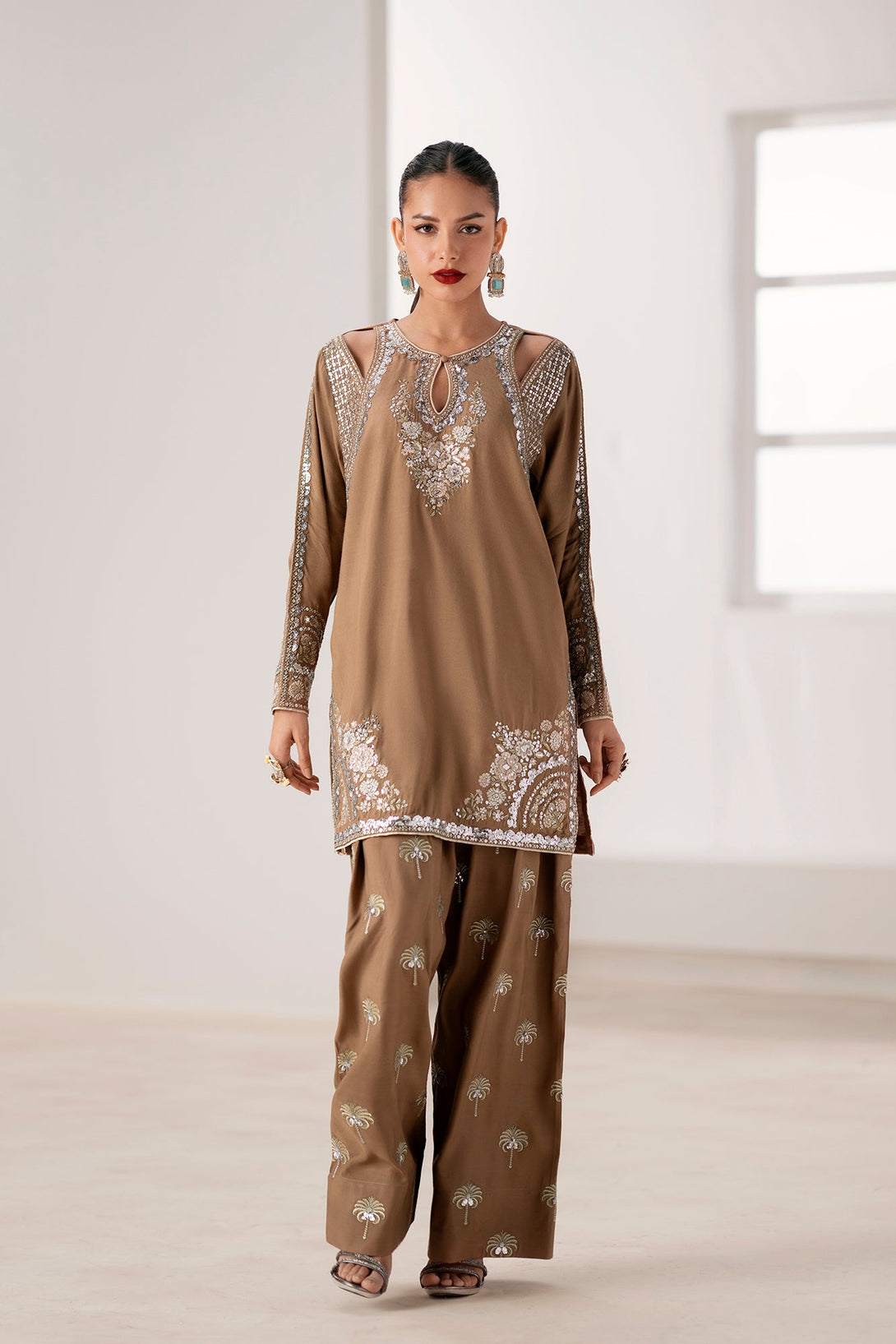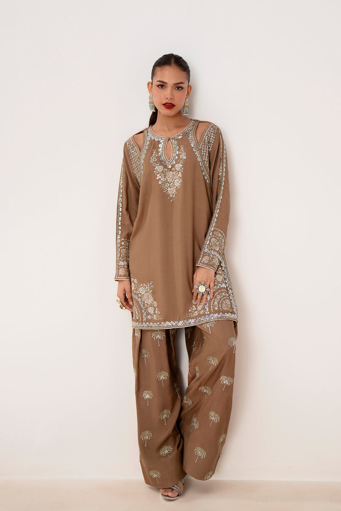 Embrace refined glamour with this striking embroidered suit. The rich brown fabric is a perfect backdrop for the intricate, heavy embroidery in shimmering silver and gold, creating a sophisticated and luxurious feel. The shirt features cut-out details on the shoulders and a keyhole neckline, adding a contemporary touch to its classic silhouette. The set is completed with matching loose fit shalwar, also adorned with elegant silver embroidery in a unique palm tree pattern. This suit is the ideal choice for making a statement at any special occasion, blending traditional craftsmanship with modern design.