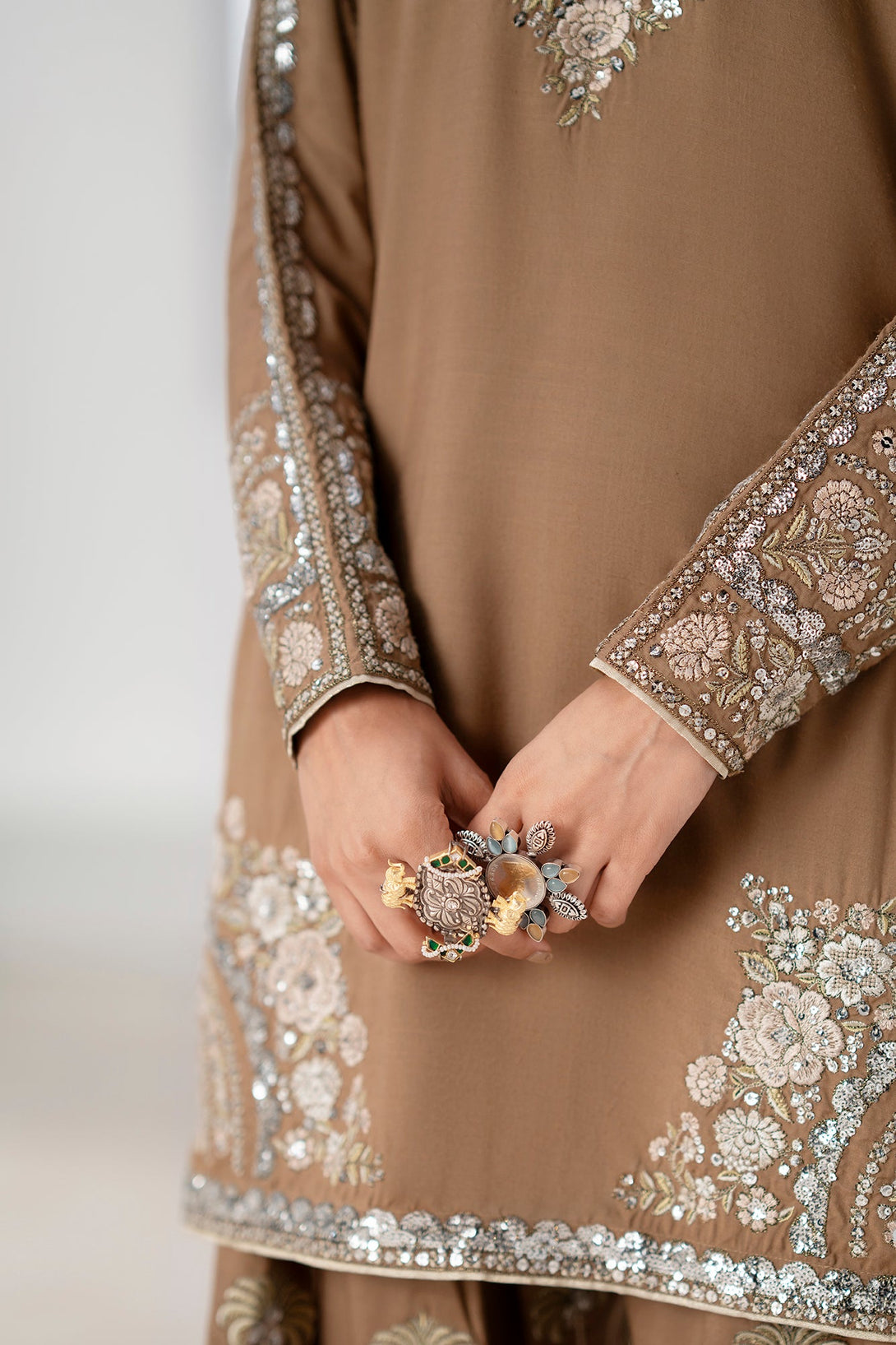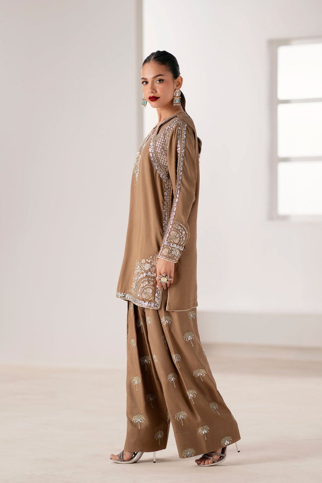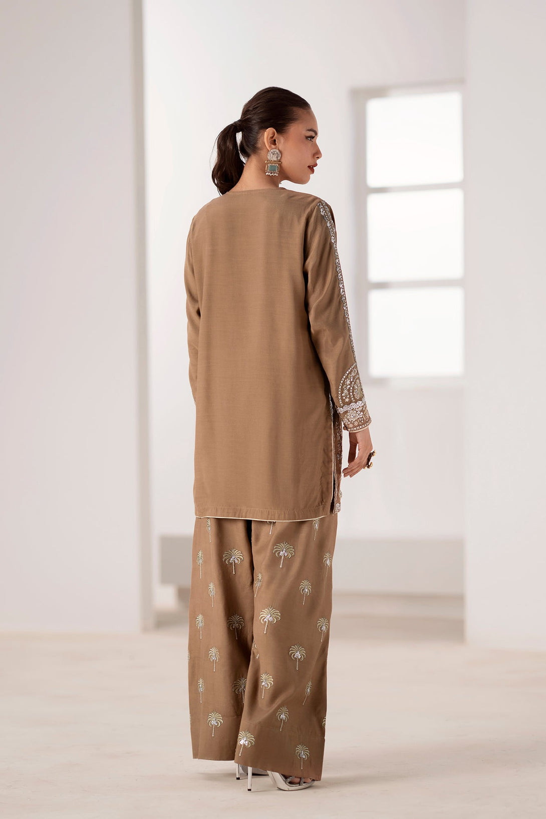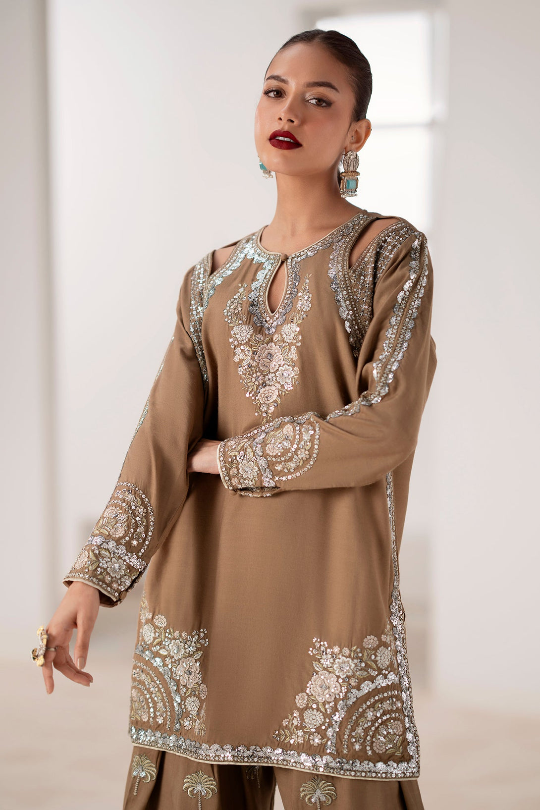 Embrace refined glamour with this striking embroidered suit. The rich brown fabric is a perfect backdrop for the intricate, heavy embroidery in shimmering silver and gold, creating a sophisticated and luxurious feel. The shirt features cut-out details on the shoulders and a keyhole neckline, adding a contemporary touch to its classic silhouette. The set is completed with matching loose fit shalwar, also adorned with elegant silver embroidery in a unique palm tree pattern. This suit is the ideal choice for making a statement at any special occasion, blending traditional craftsmanship with modern design.