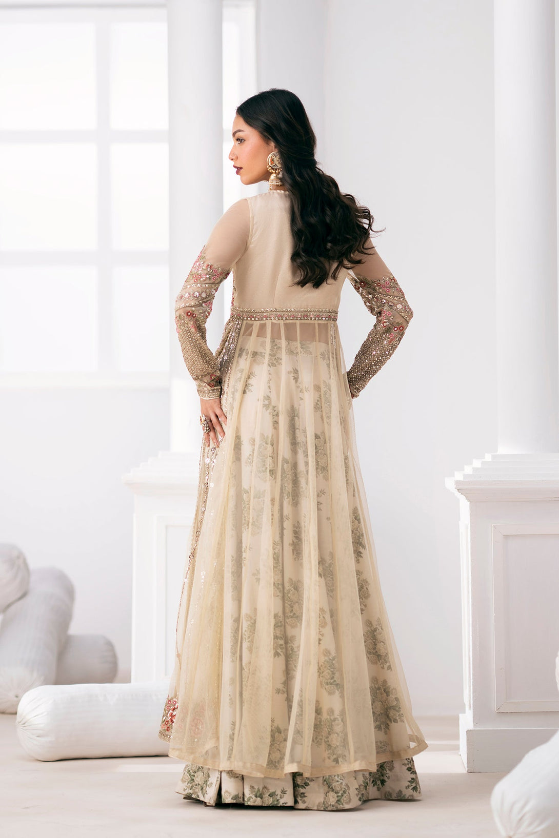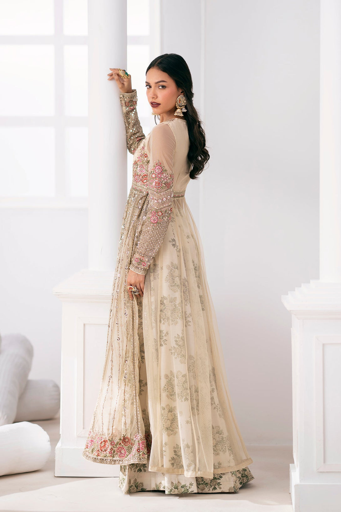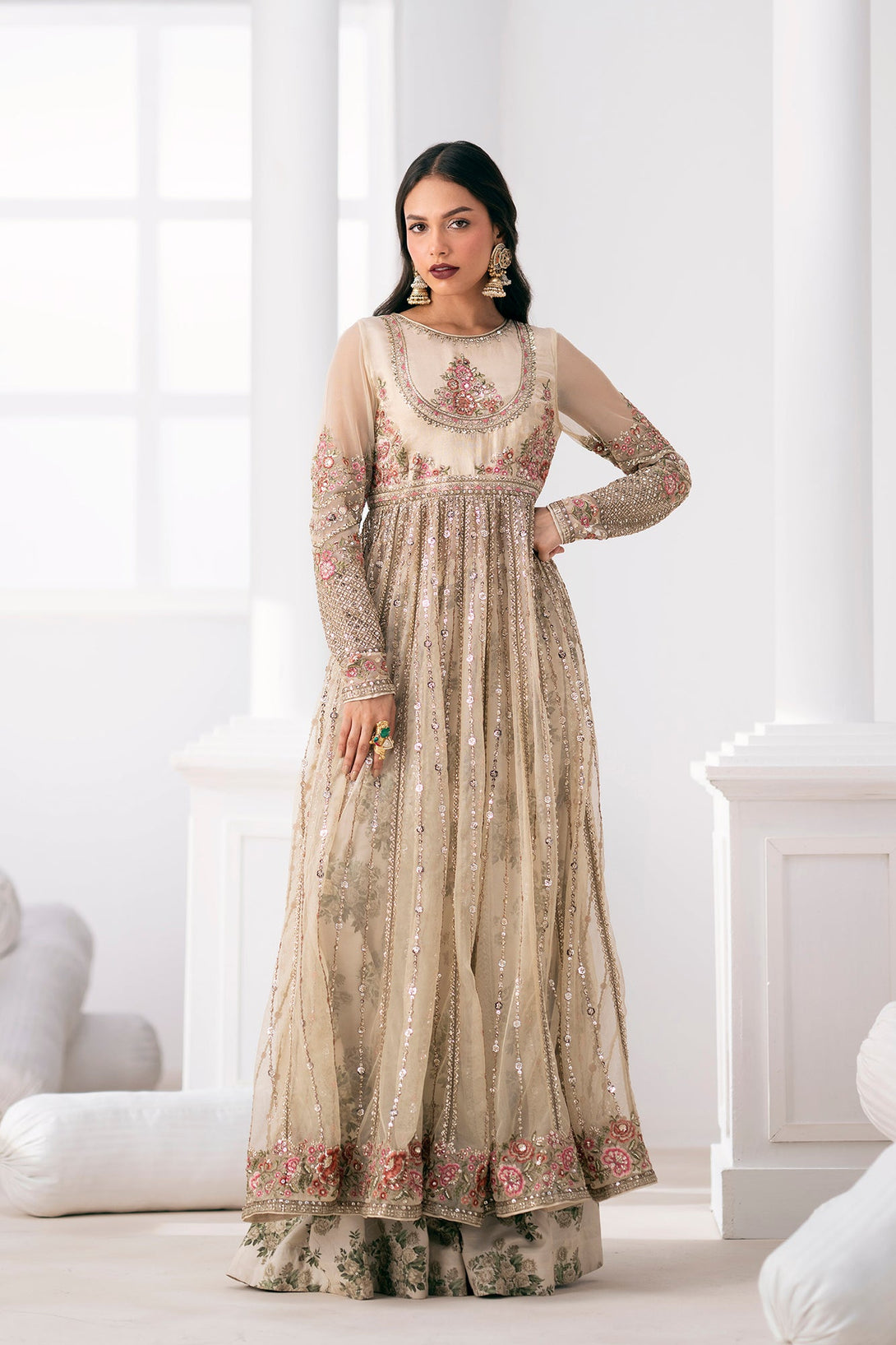 Drape yourself in ethereal elegance with this breathtaking embroidered pishwas and lehenga. The flowing pishwas, in a soft off-white, is a masterpiece of design, with a richly embellished bodice and long, sheer sleeves. The intricate embroidery in shades of pink, green, and gold creates a stunning, regal pattern. The pishwas is adorned with delicate sequin work, adding a subtle sparkle as you move. This magnificent piece is layered over a beautiful lehenga that peeks out from beneath the pishwas, featuring a beautiful floral print in muted tones. This suit is the perfect choice for a grand celebration, ensuring a look that is both luxurious and unforgettable.