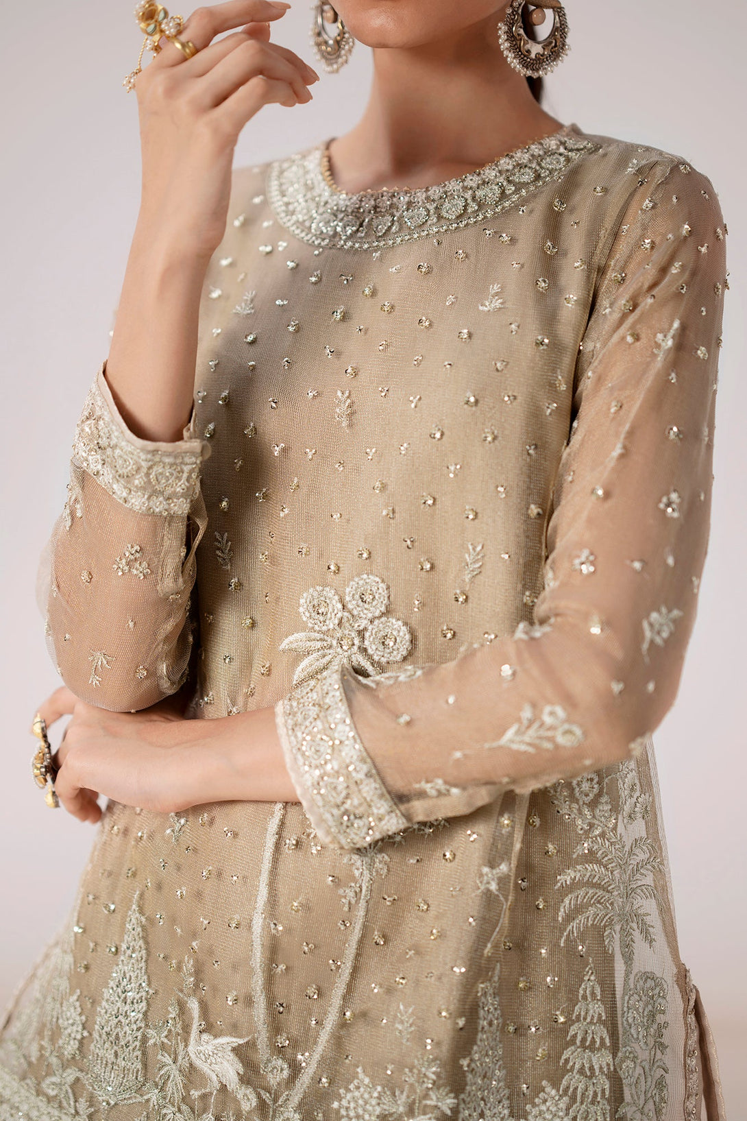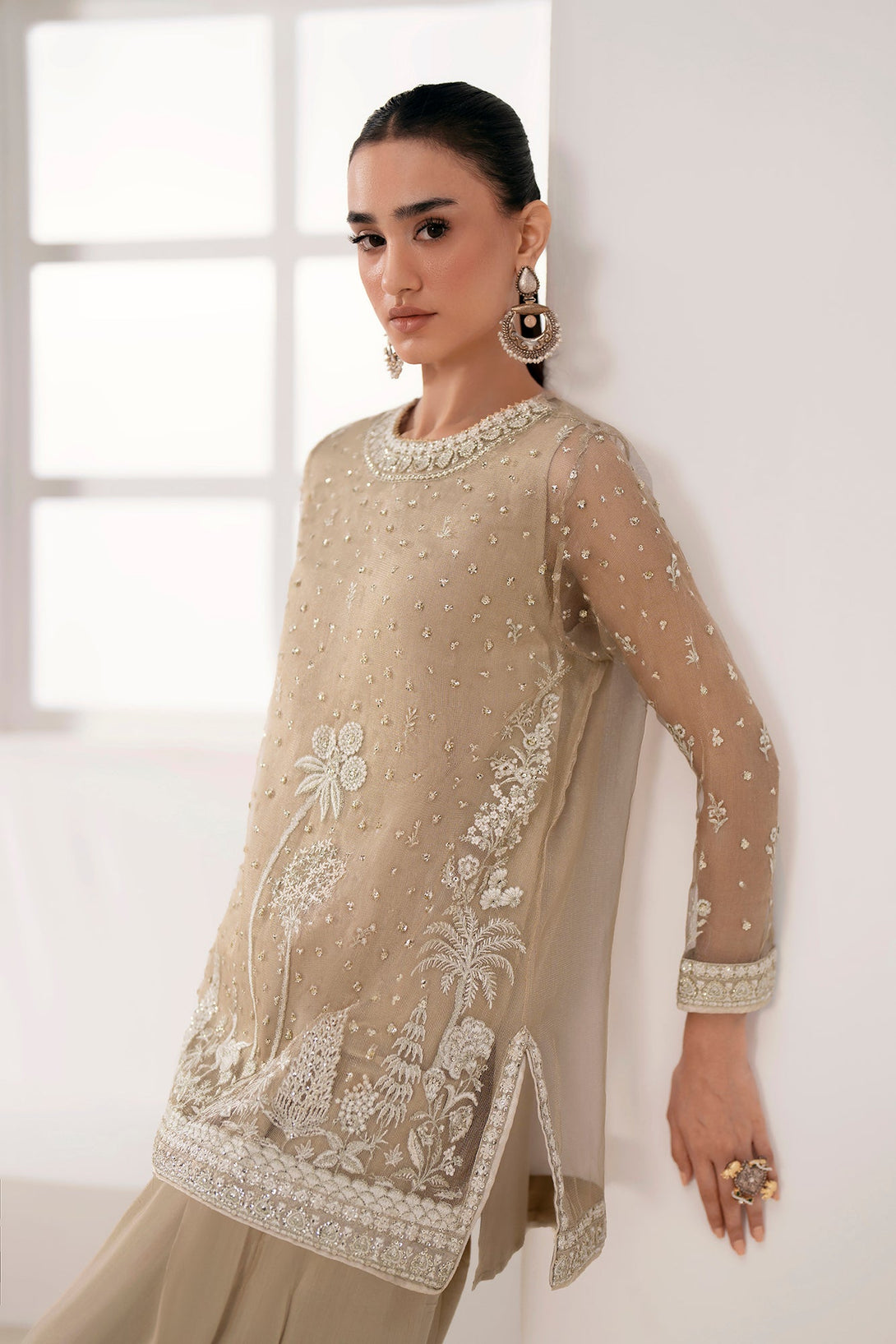 Adorn yourself in timeless grace with this exquisite embroidered suit. Crafted from a sheer zari net in a soft beige, the shirt is a masterpiece of delicate design, featuring shimmering white and silver floral and vine embroidery. The beautifully embroidered neckline adds a touch of refined charm, while the full-length sleeves create a graceful silhouette. This stunning piece is worn over a raw silk slip and is completed with a matching shalwar, also adorned with elegant floral embroidery at the hem. This suit is the perfect choice for a special occasion, blending traditional craftsmanship with a sophisticated and unforgettable style.