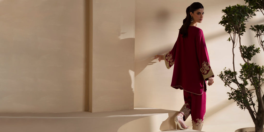 Channel timeless glamour in this breathtaking magenta embroidered suit. The relax fit kurti is crafted from a rich, deep magenta fabric and is lavishly adorned with heavy gold and silver thread embroidery. The embroidery features magnificent paisley and floral motifs running down the center front, along the hem, and gracefully decorating the sleeves. The ensemble is perfectly completed by coordinating shalwar in the same vibrant magenta hue. The hem of the shalwar boast a striking, heavily embroidered border, making this regal monochromatic look ideal for formal occasions and celebratory evenings.