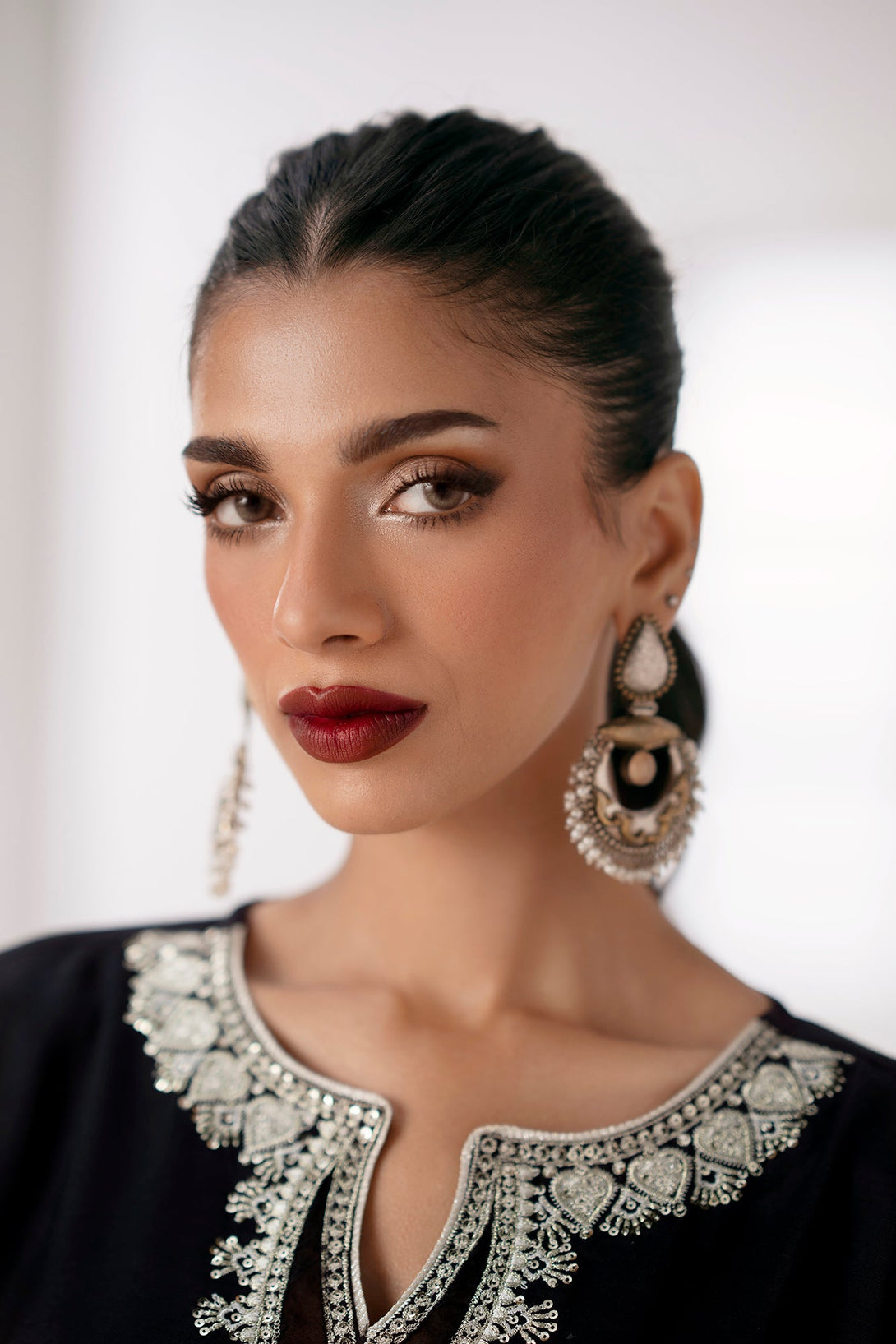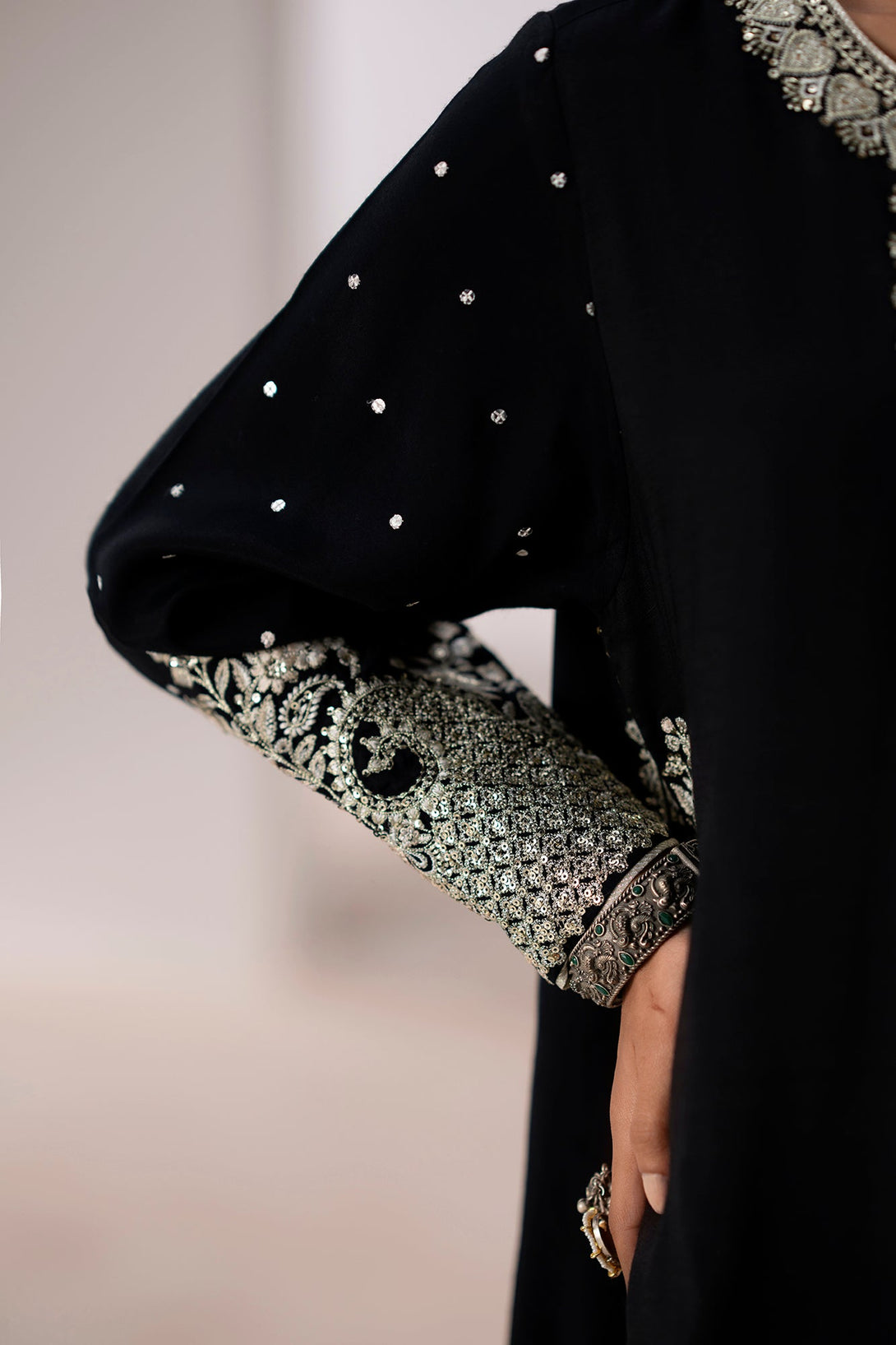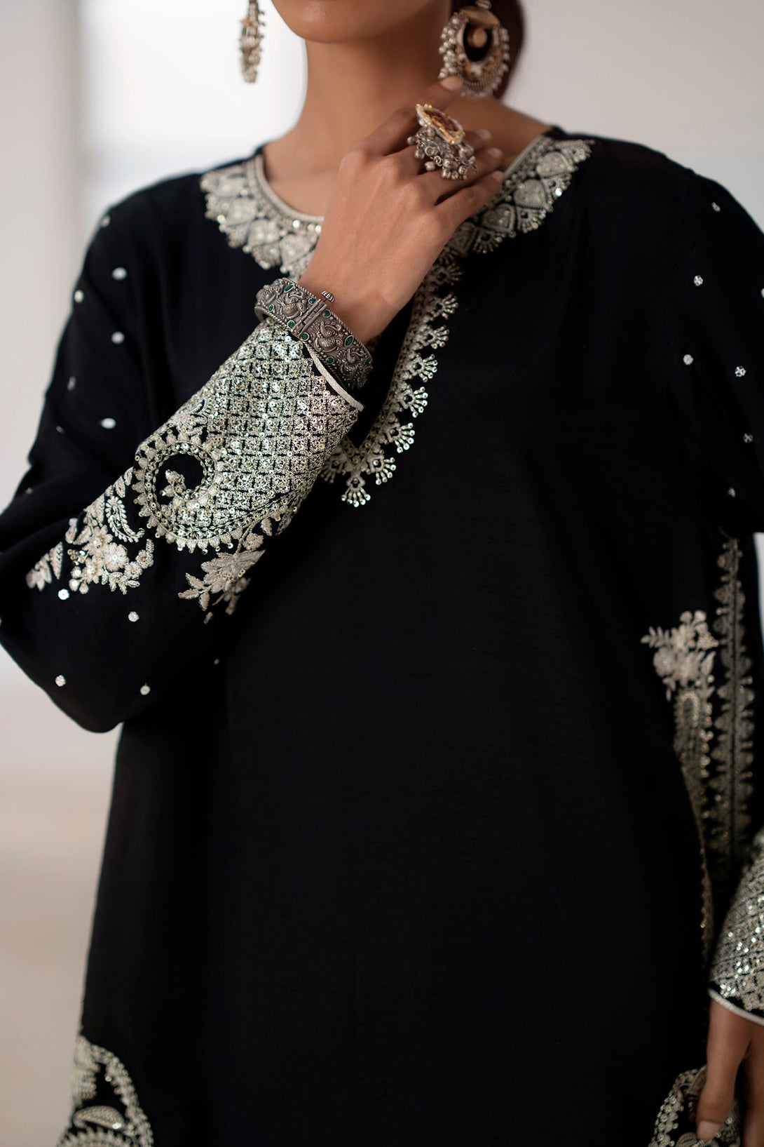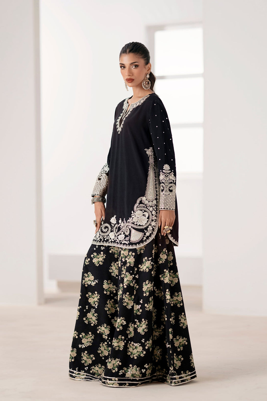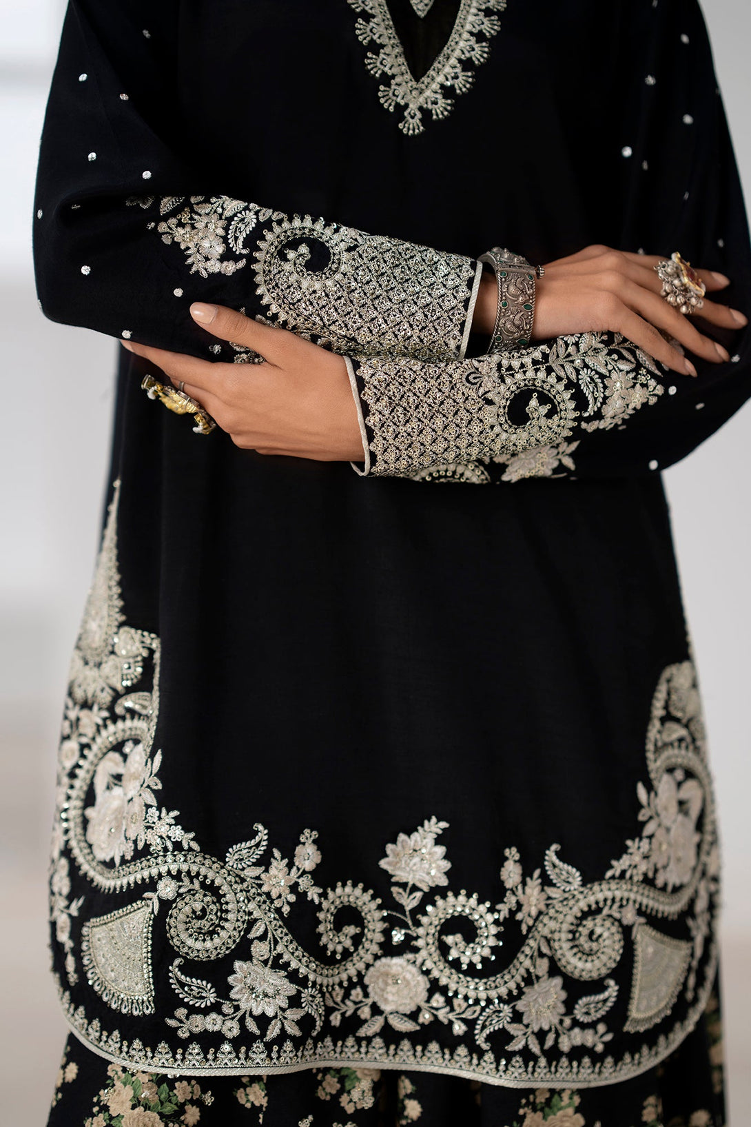 Embrace timeless sophistication with this exquisite embroidered shirt. The rich black fabric is a striking backdrop for the intricate, heavy silver embroidery that adorns the front and sleeves. A beautifully detailed V-neckline adds a touch of refined elegance where as full-length sleeves are also richly embellished with a complementary floral and vine pattern, creating a cohesive and luxurious look. Paired with a floral printed sharara showcasing an ethereal look, this graceful outfit is a must have to style this festive season.