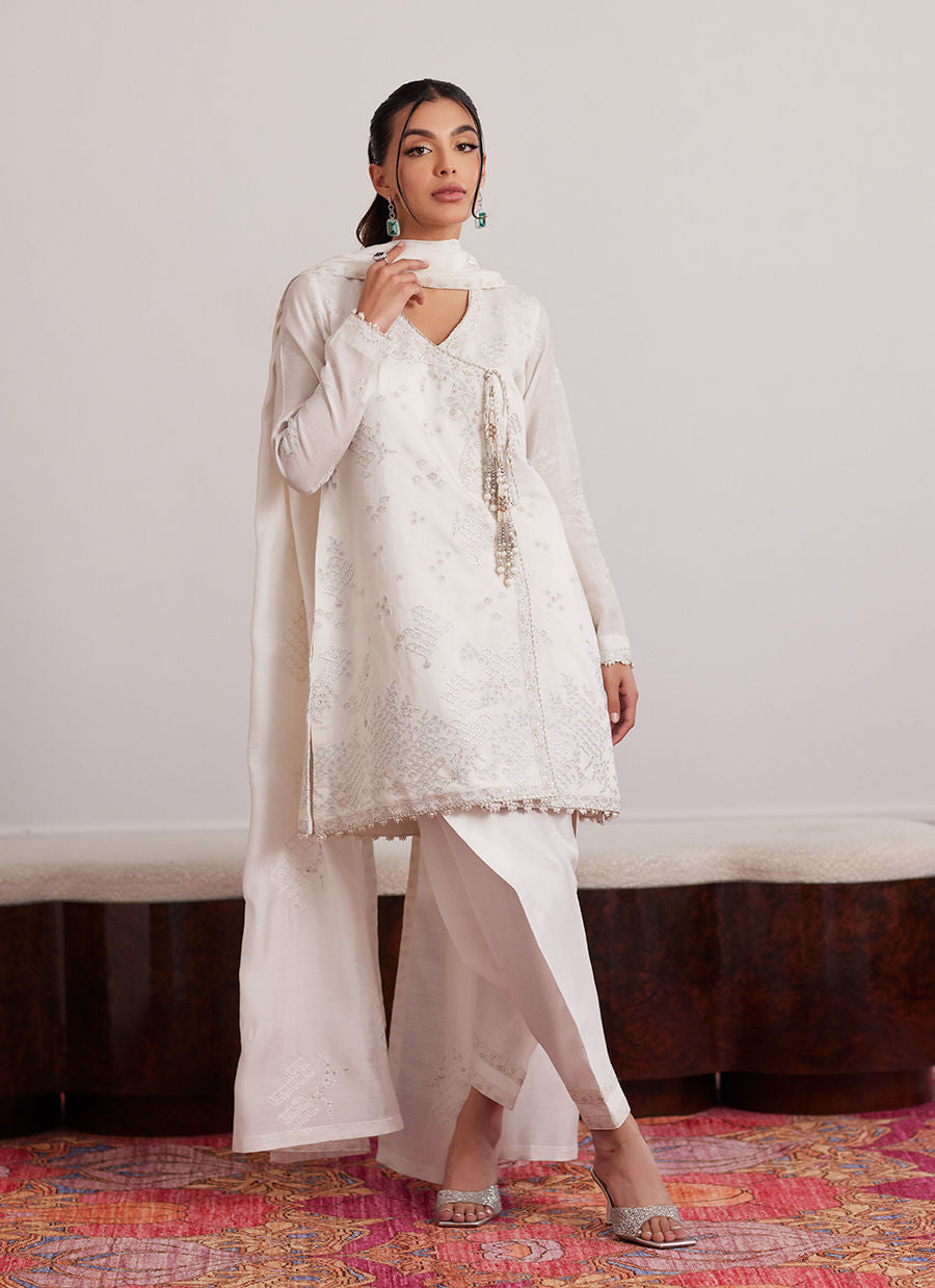 This ivory angarkha, crafted from fine kora cotton, is a refined blend of tradition and elegance. The fabric is adorned with delicately embroidered florals, blooming all over - highlighted by silver thread accents that add a subtle sheen. The neckline and borders are beautifully embellished with pearls, sequins, and Swarovski crystals, adding a touch of glamour and sophistication. The fine kora cotton dupatta mirrors the intricate all-over blooms, with a carefully crafted, border that perfectly complements the outfit’s delicate embroidery. The look is completed with a tapered shalwar, featuring embroidered borders along the hem for an added element of detail. This ensemble is ideal for a graceful, timeless statement at any manner of occasion.