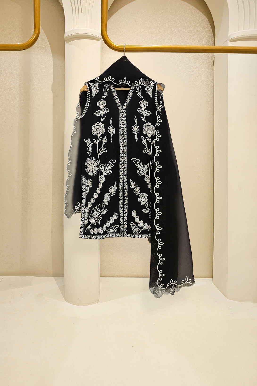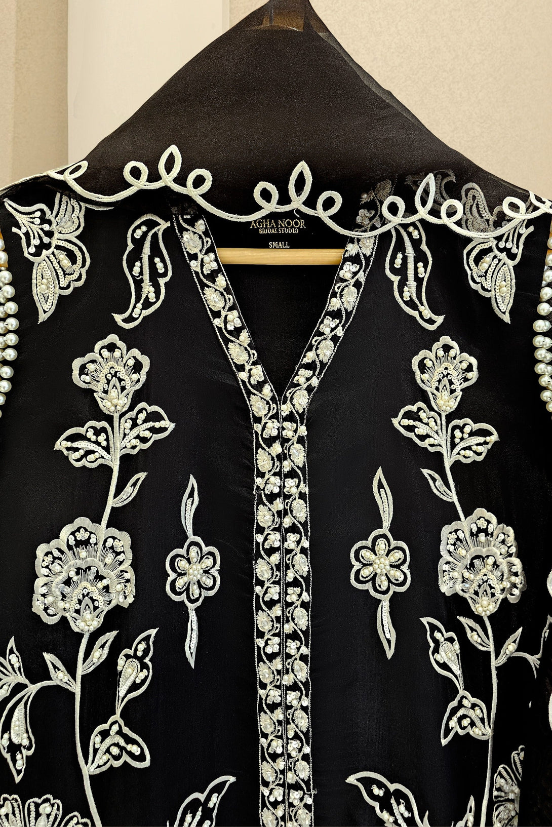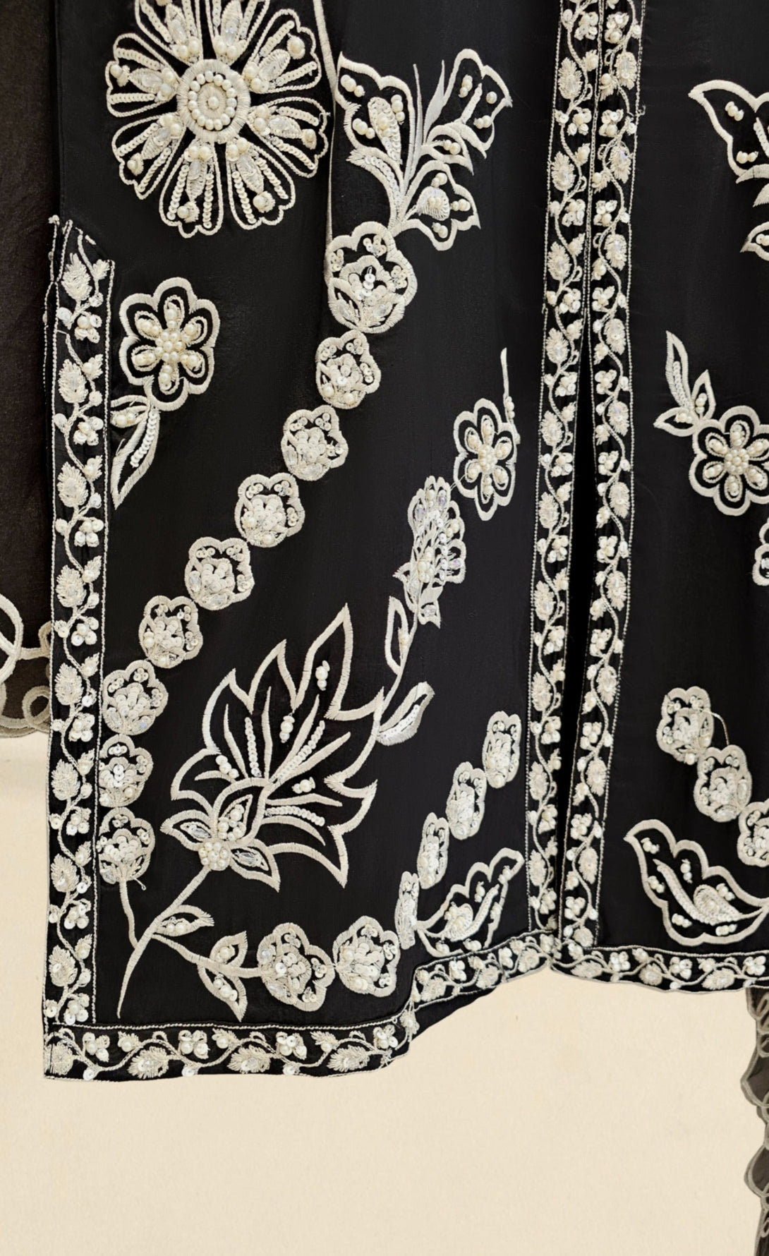 Timeless elegance and unmatched details make up for our Cassia ensemble. Curated on jet black korean silk, adorned with stunning threadwork and pearl details. Styled with an ethereal cutwork organza dupatta alongside farshi shalwar to complete this beautiful design. A must have look that can be dressed up or down according to the occasion.