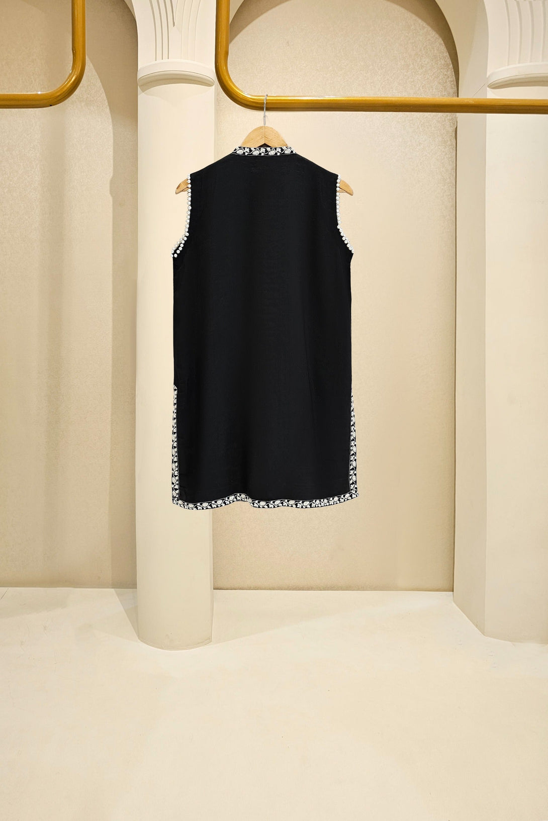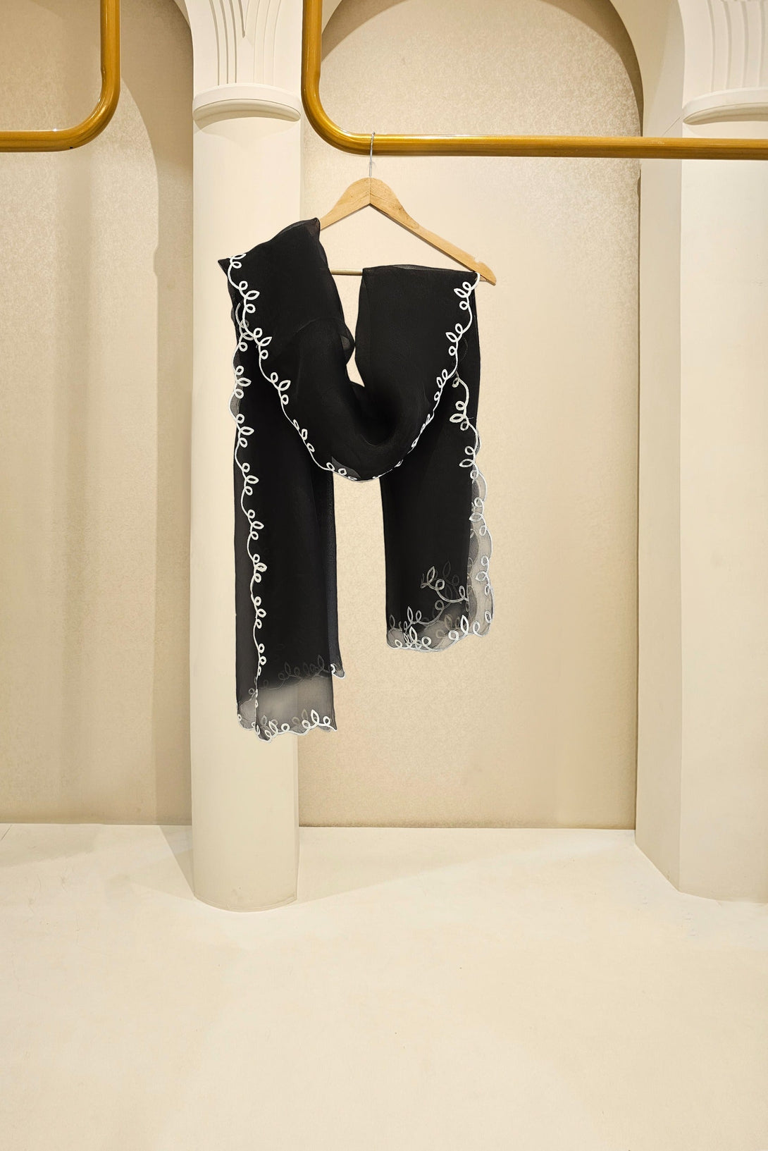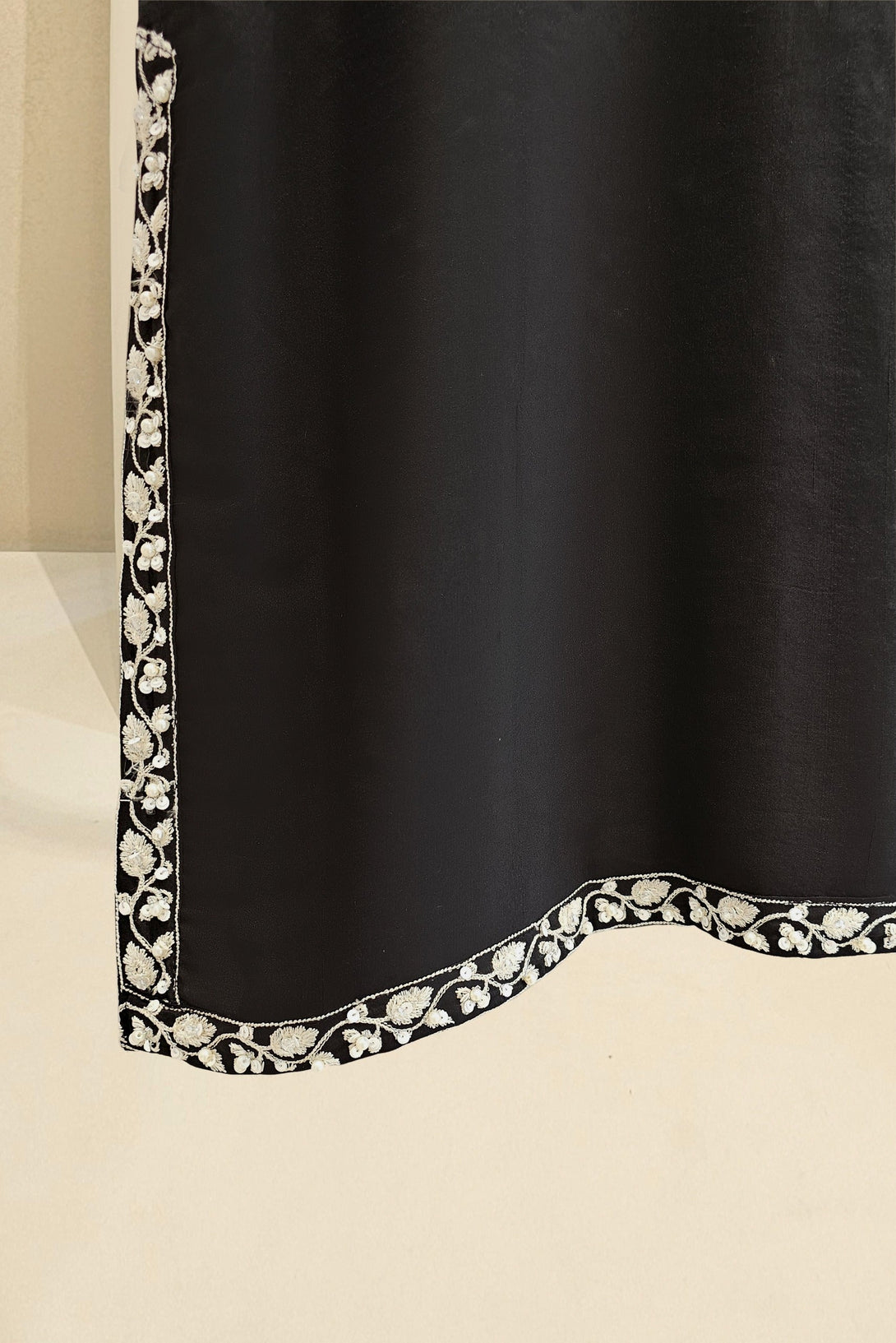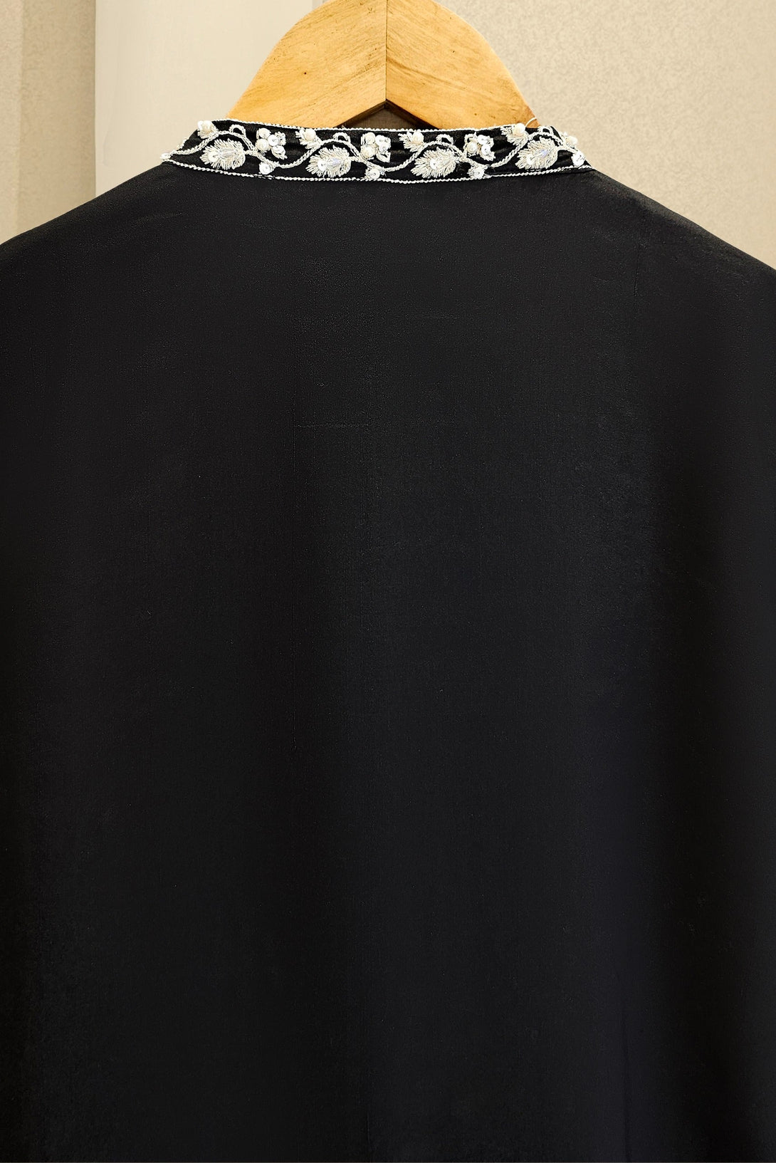 Timeless elegance and unmatched details make up for our Cassia ensemble. Curated on jet black korean silk, adorned with stunning threadwork and pearl details. Styled with an ethereal cutwork organza dupatta alongside farshi shalwar to complete this beautiful design. A must have look that can be dressed up or down according to the occasion.
