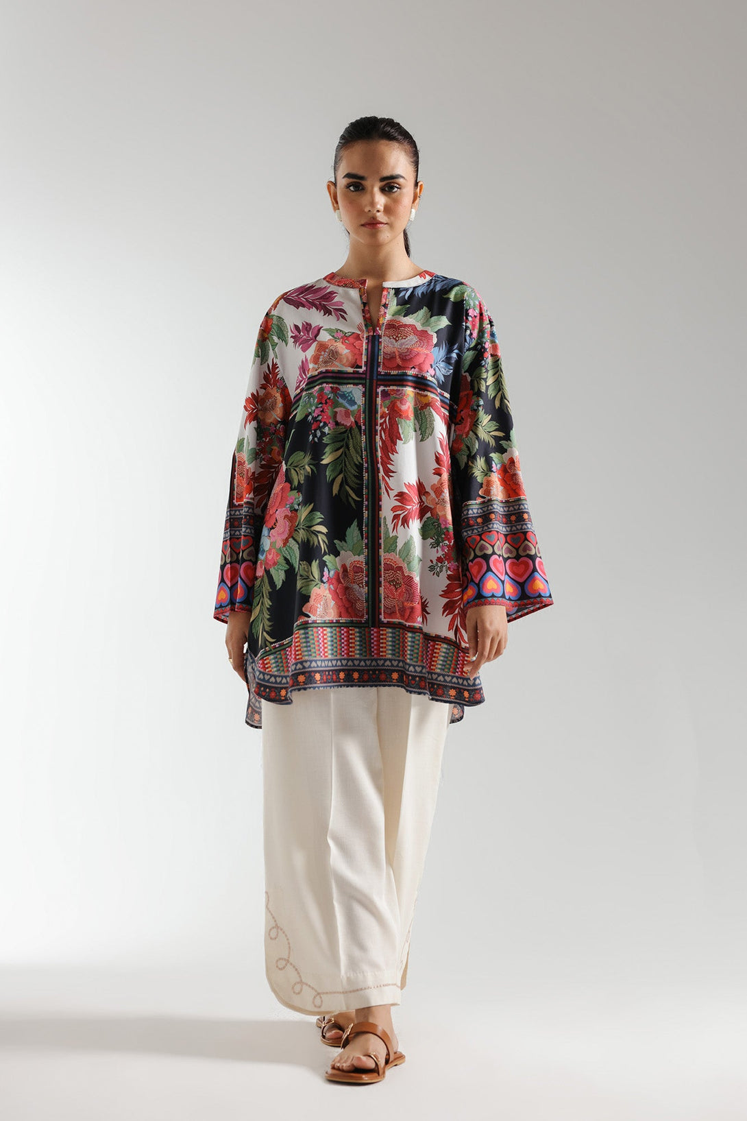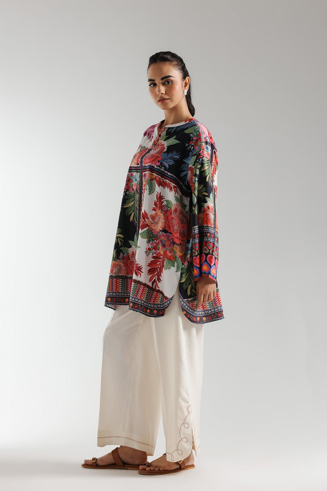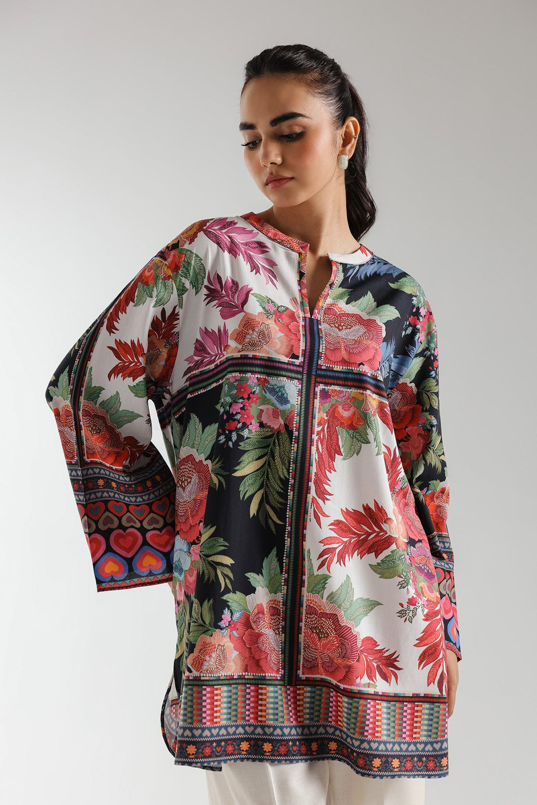 A classically chic design is portrayed on this elegant shirt rendered in a subtle vanilla ice white shade. It features fascinating abstract designs printed in vibrant colors illustrating an artistic composition. Style this contemporary shirt at fun events and be the epitome of grace this season.