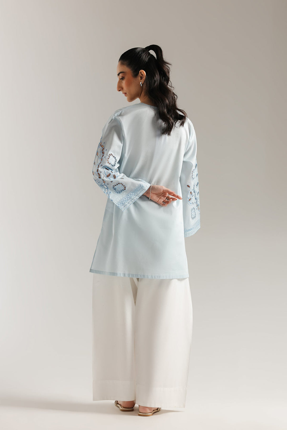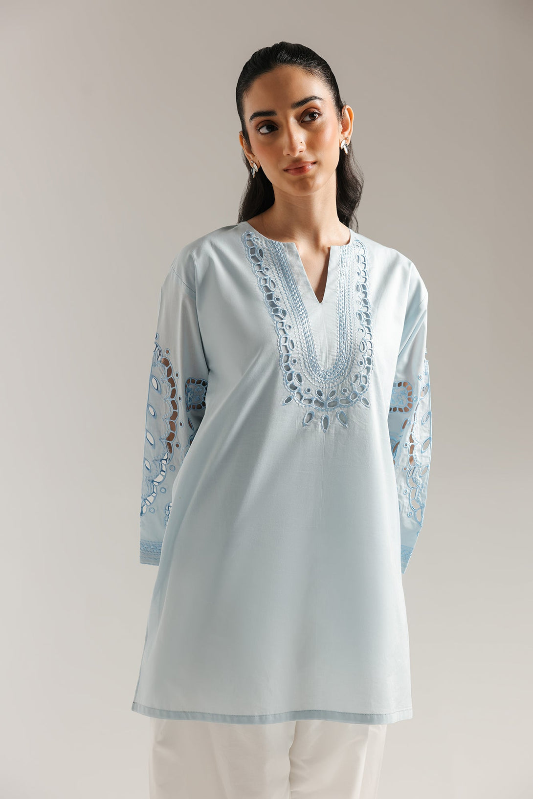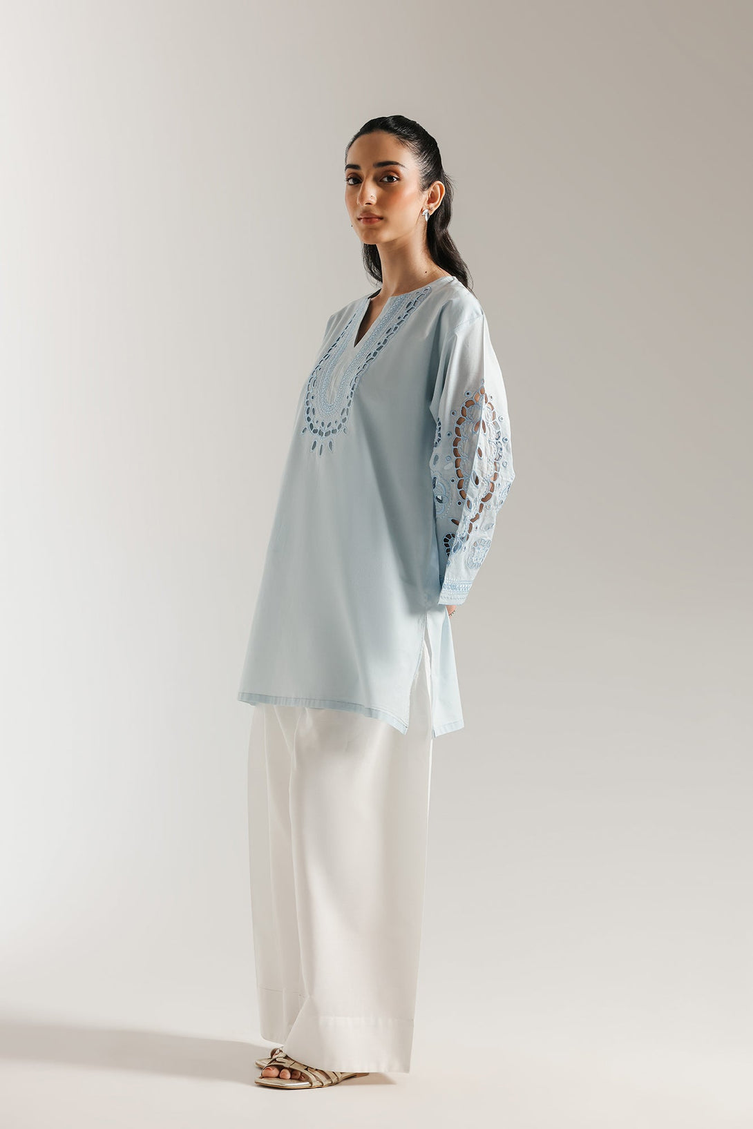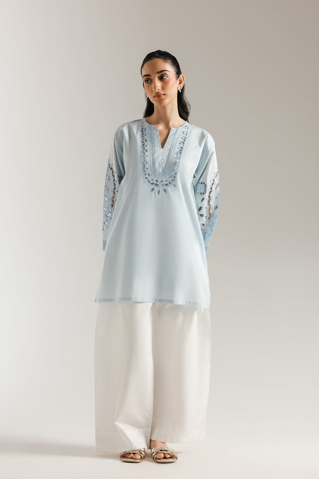 A vision of sophisticated style, this embroidered kurti is a testament to the timeless elegance. The solid hue is elevated by intricate blue cutwork and detailed embroidery that adorns the V-neckline and cascades gracefully down the front. The wide, flowing sleeves feature a beautiful lace-like cutwork pattern, adding a bold textural element. This kurti is a perfect blend of modern flair and classic craftsmanship, creating a look that is both dramatic and effortlessly chic.