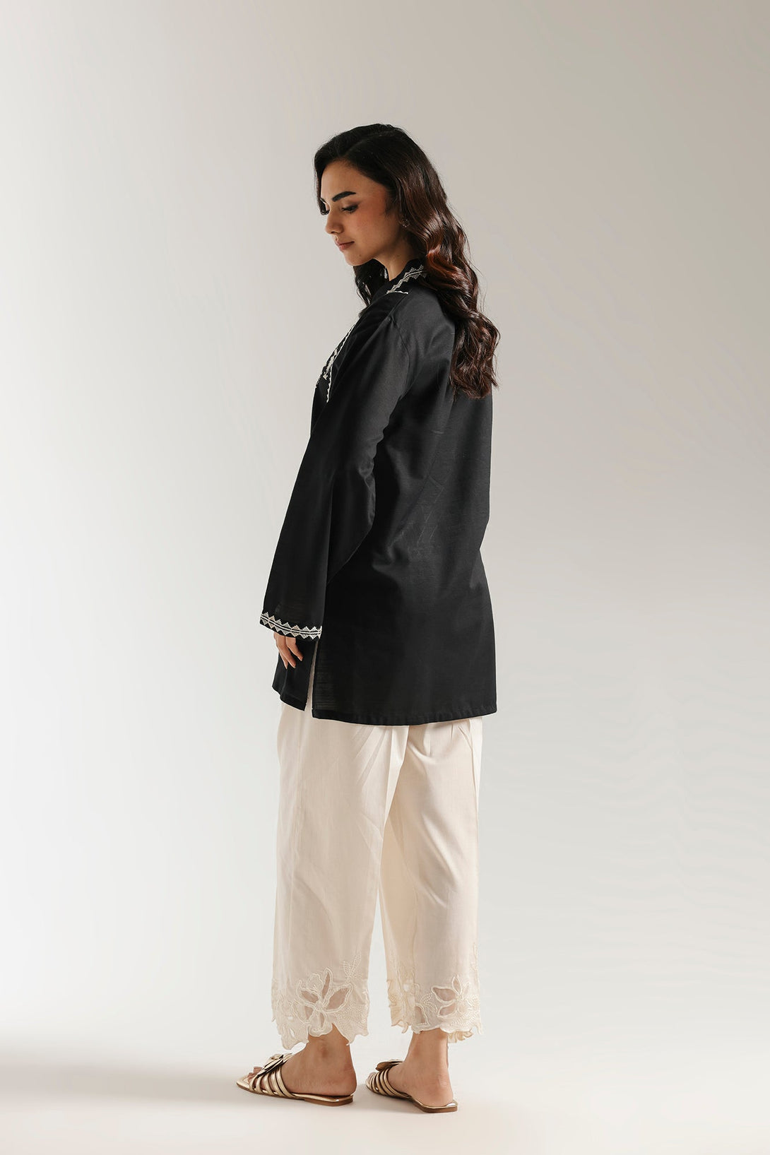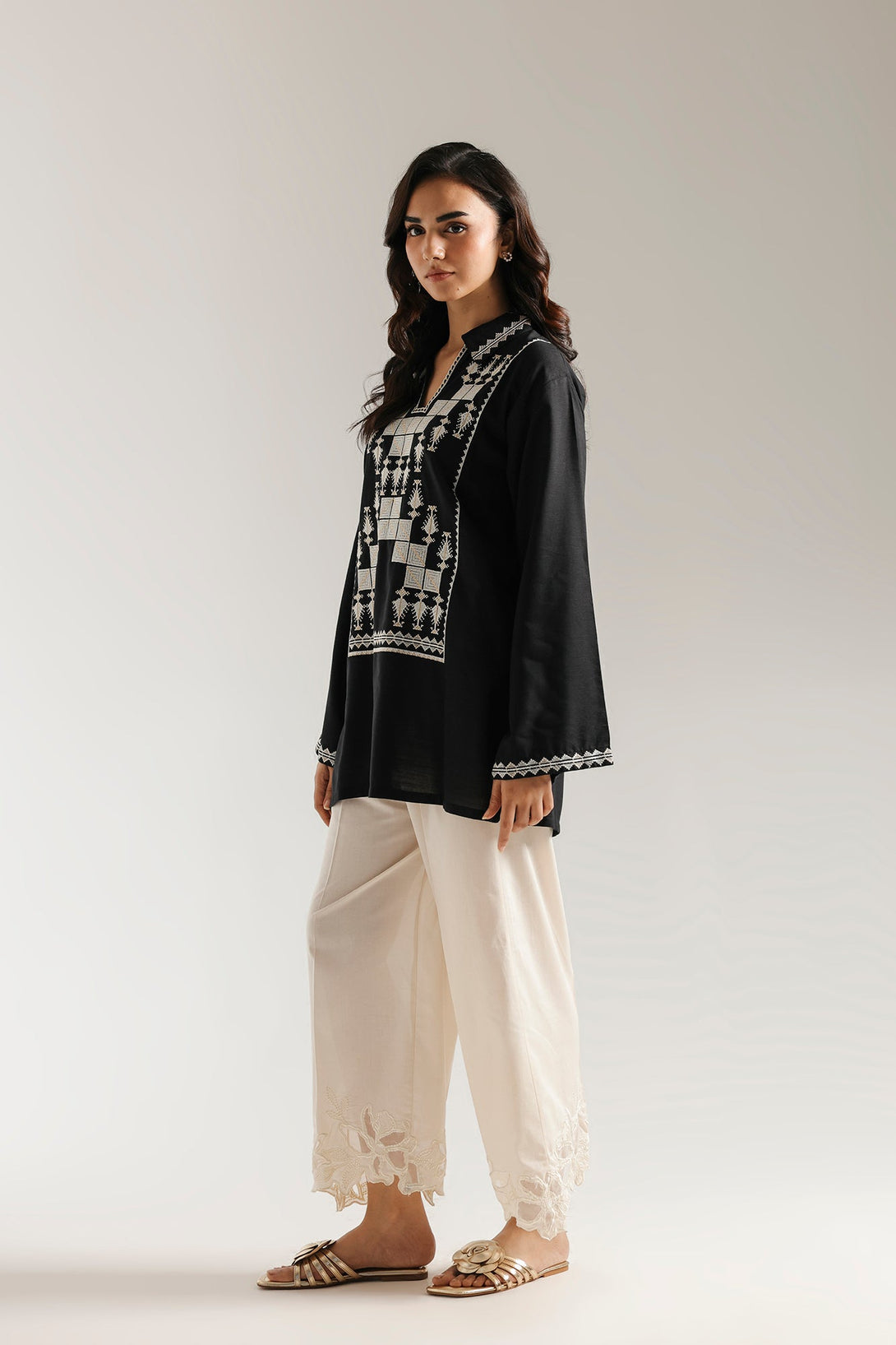 This sophisticated embroidered kurti is a true statement piece. The classic black fabric is a canvas for striking white and beige geometric embroidery, creating a bold, artistic pattern. With its elegant silhouette and wide sleeves, this piece offers a modern and captivating look.