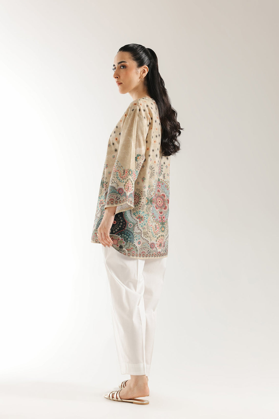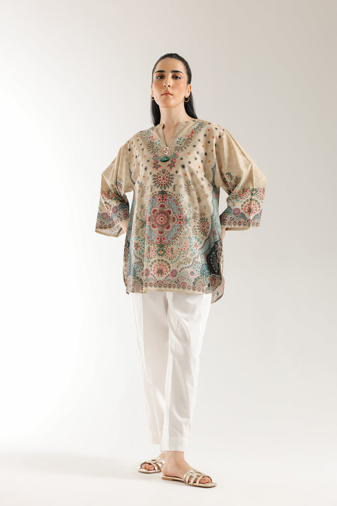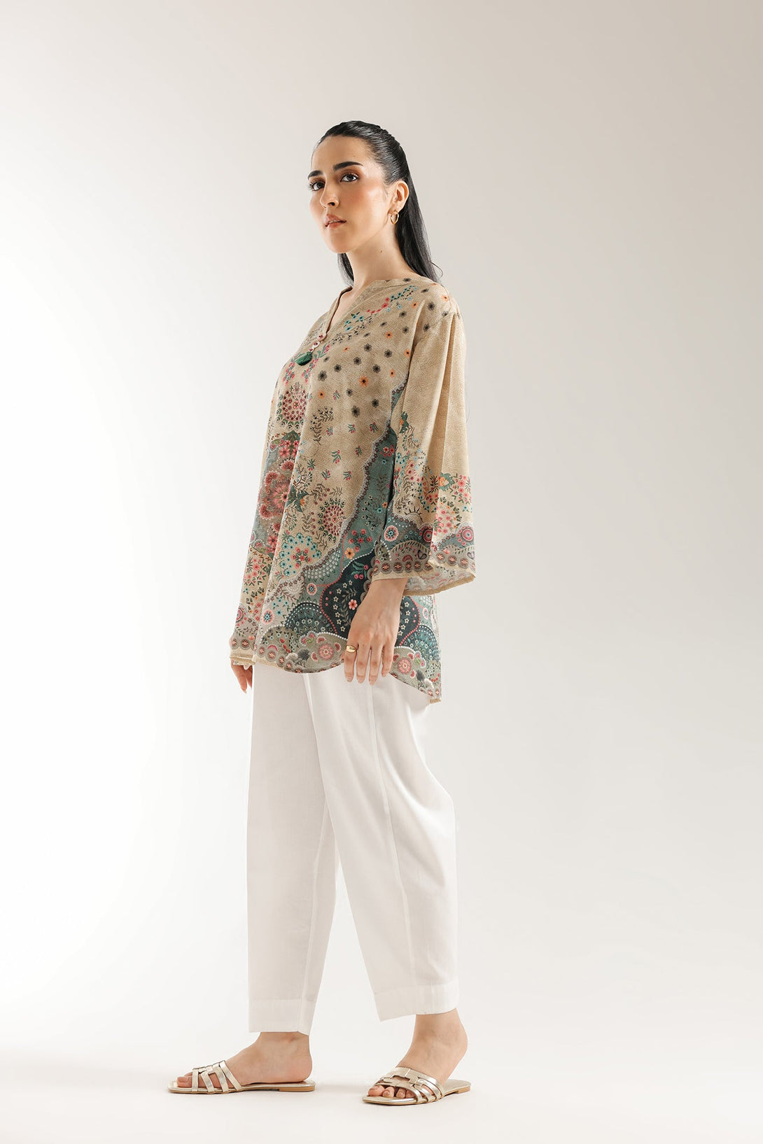 This stunning shirt in warm beige hue serves as a canvas for a mesmerizing tapestry of patterns, blending rich floral, paisley, and geometric motifs in a vibrant palette of blues, pinks, and reds. With a relaxed silhouette and beautifully detailed sleeves, this piece offers a perfect fusion of bohemian charm and sophisticated elegance, making it a truly unique addition to your wardrobe.